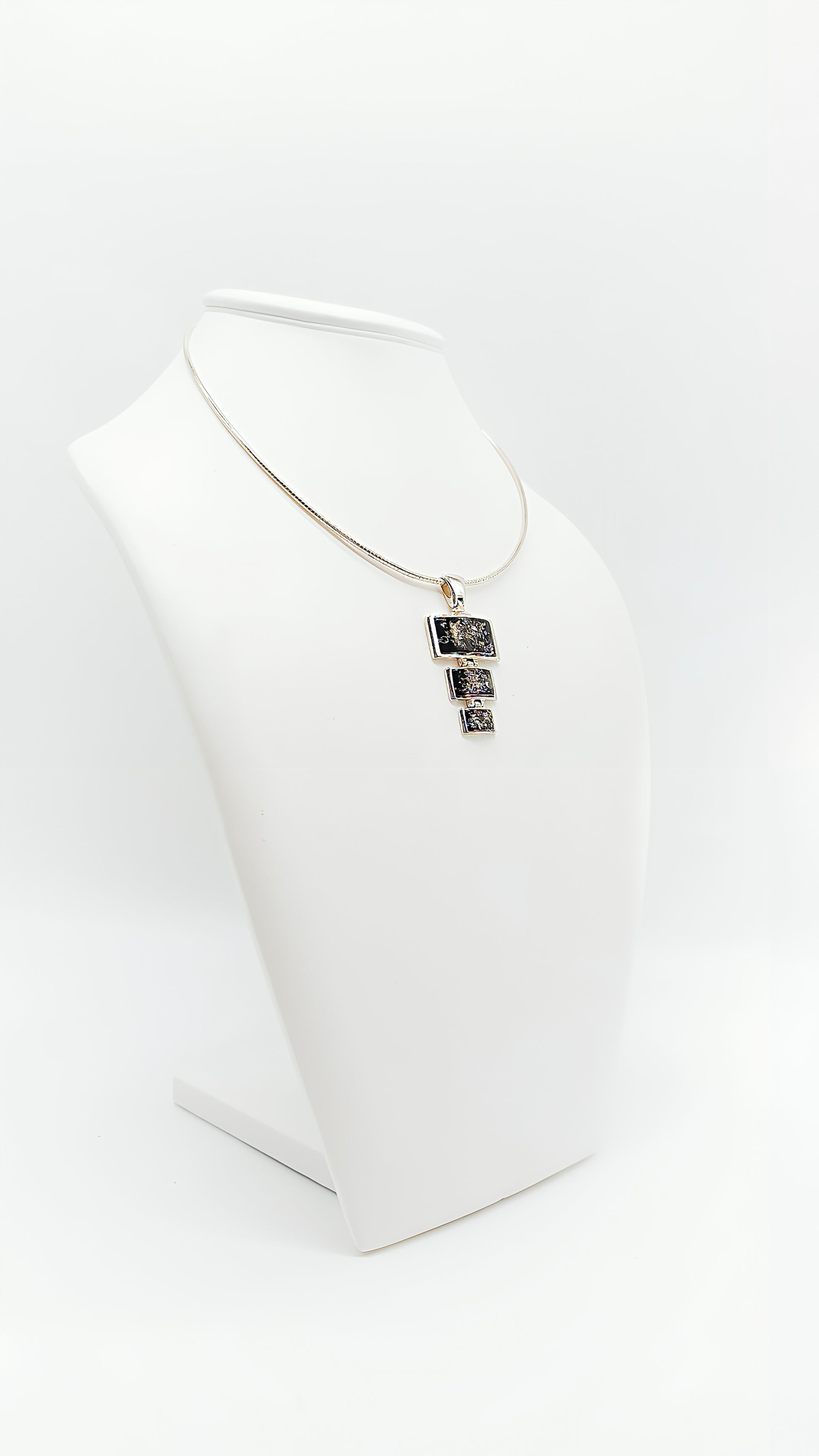Dieser außergewöhnliche Anhänger aus 925er Sterlingsilber fasziniert durch seine dreistufige Struktur, in die glänzende Bernsteine eingebettet sind. Jeder Stein erzählt seine eigene Geschichte und fängt das Licht auf eine besondere Art und Weise ein. Die rechteckigen Formen verleihen dem Schmuckstück eine moderne Eleganz, während der Bernstein eine warme, natürliche Tiefe einbringt. Ein edles Accessoire für alle, die ein Statement setzen wollen, ohne auf schlichte Eleganz zu verzichten.