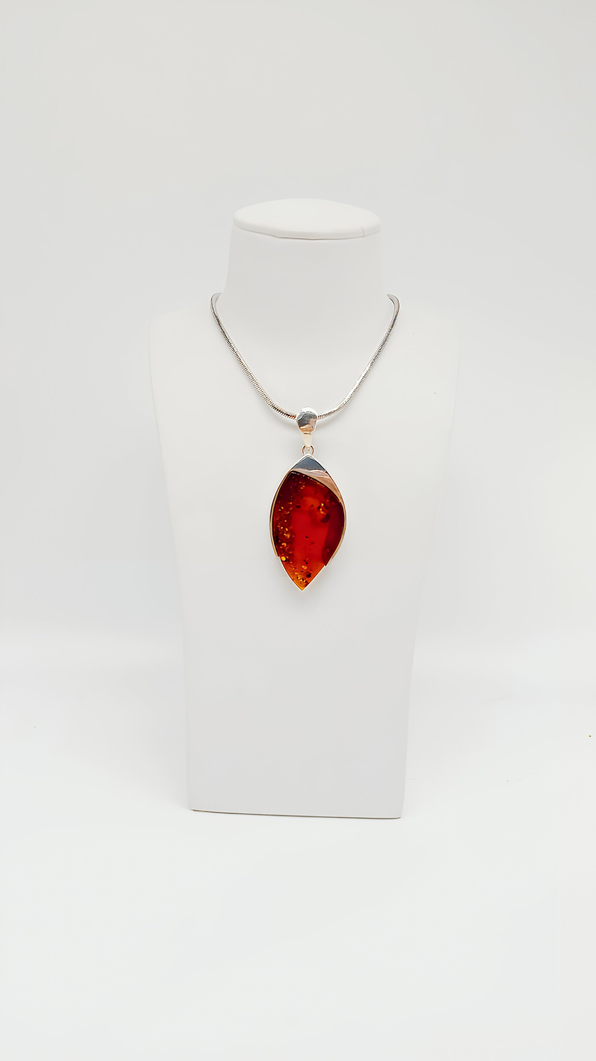 Dieser atemberaubende Bernsteinanhänger aus 925er Sterlingsilber vereint die faszinierende Tiefe des roten Bernsteins mit einer eleganten Silberfassung. Die warmen Rottöne des Bernsteins fangen das Licht auf magische Weise ein, während die organische Form des Anhängers moderne Eleganz ausstrahlt. Dieses handgefertigte Unikat ist perfekt für Liebhaber von einzigartigen Schmuckstücken, die durch ihre schlichte, aber kraftvolle Präsenz beeindrucken.