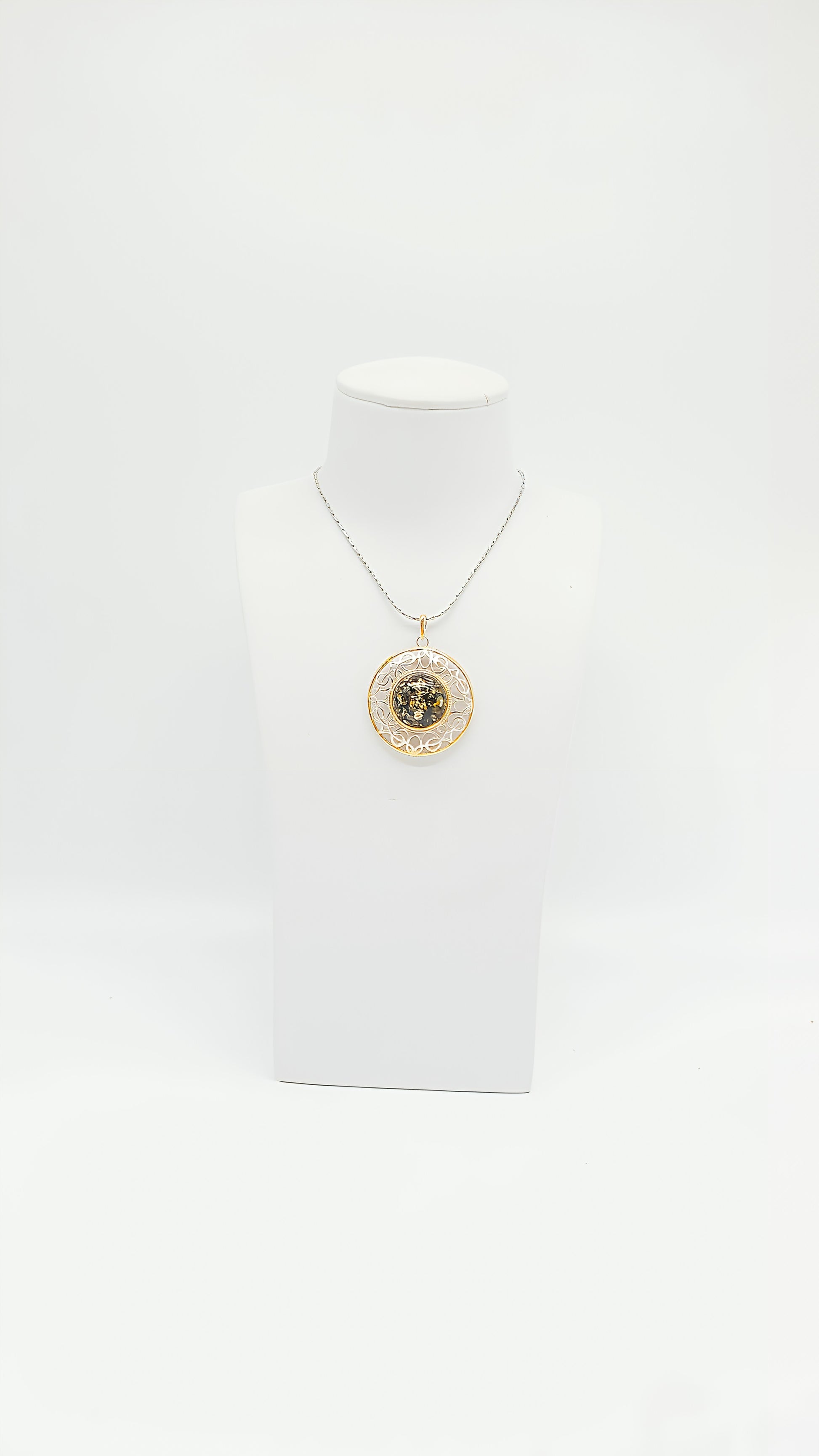 Dieser edle Anhänger aus 925er Sterlingsilber präsentiert einen faszinierenden grünen Bernstein, der in einem kunstvollen Silberrahmen eingefasst ist. Die filigrane Verzierung des Rahmens betont den natürlichen Schimmer des Bernsteins, der in seiner grünen Farbvariante besonders edel wirkt. Die vergoldeten Details im Rahmen verleihen dem Anhänger zusätzlichen Glanz und machen ihn zu einem einzigartigen Schmuckstück, das sowohl Eleganz als auch Naturverbundenheit symbolisiert.
