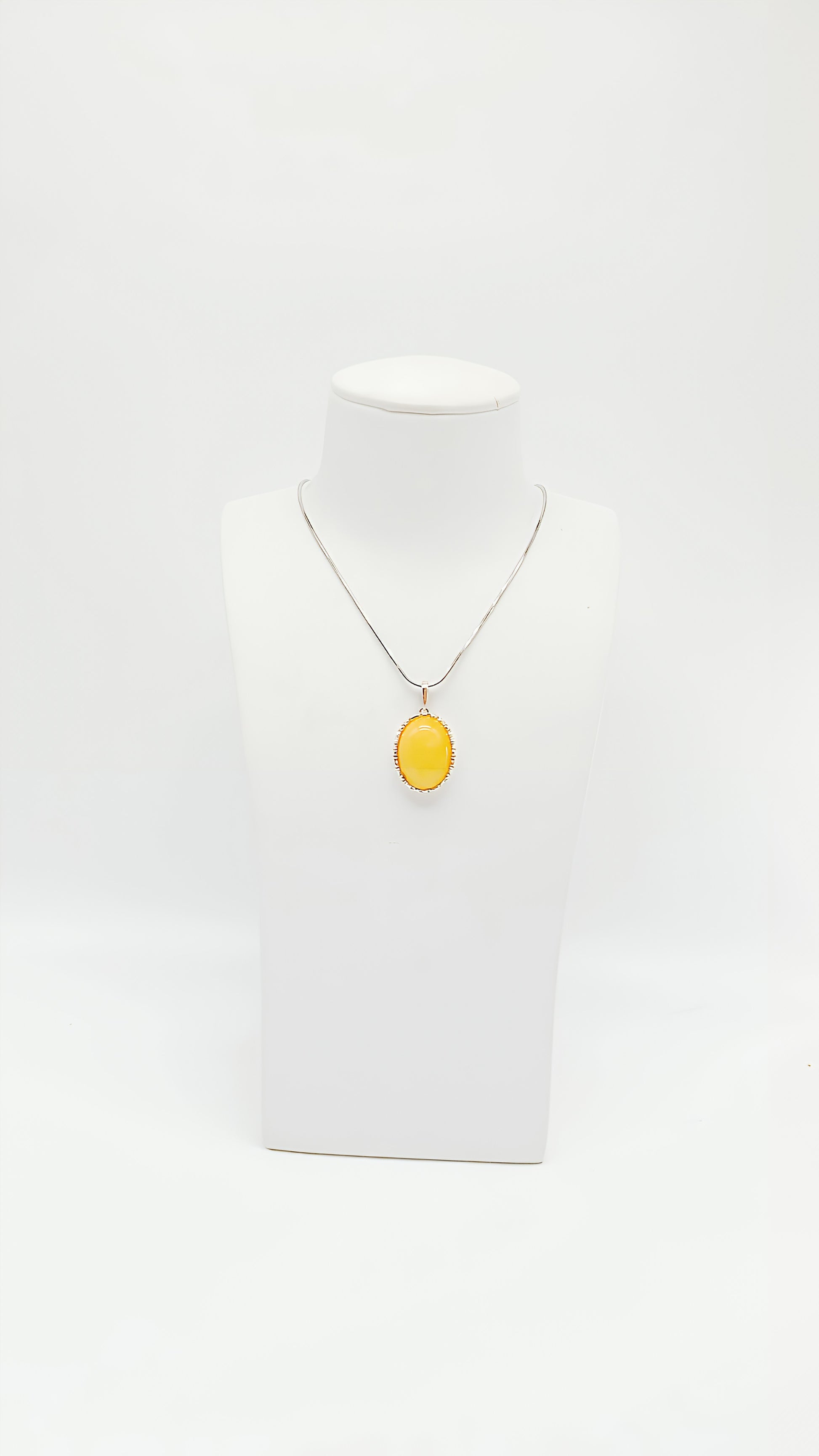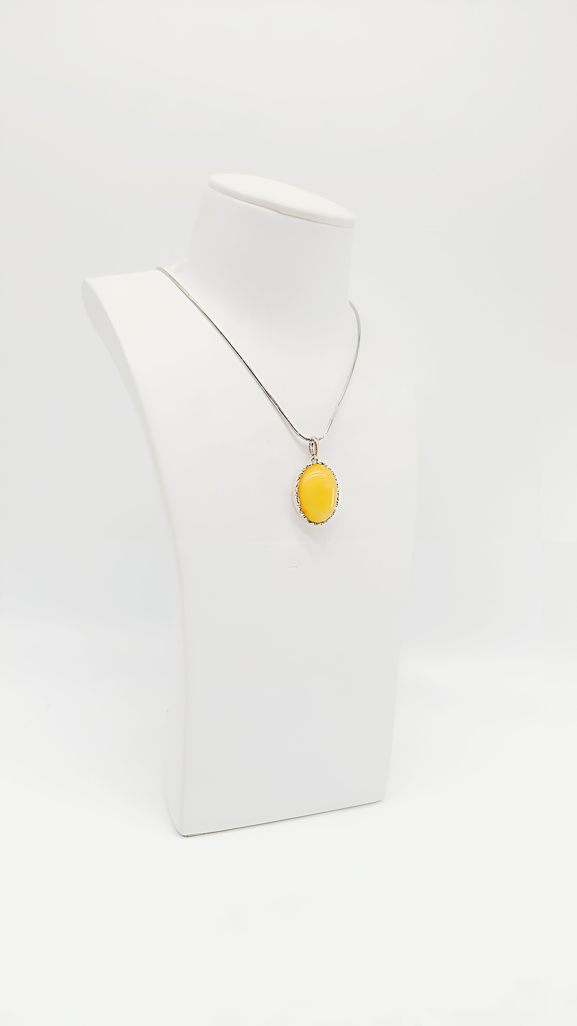 Dieser exklusive Anhänger aus 925er Sterlingsilber präsentiert einen leuchtenden, goldgelben Bernstein, der das Sonnenlicht in sich trägt. Umrahmt von fein gearbeitetem Silber, hebt sich der Stein als strahlender Mittelpunkt hervor und vereint zeitlose Eleganz mit einem Hauch von Natur. Jeder Anhänger ist ein Unikat, das seine Trägerin mit einem warmen Glanz umgibt. Perfekt für alle, die etwas Einzigartiges und Stilvolles suchen.