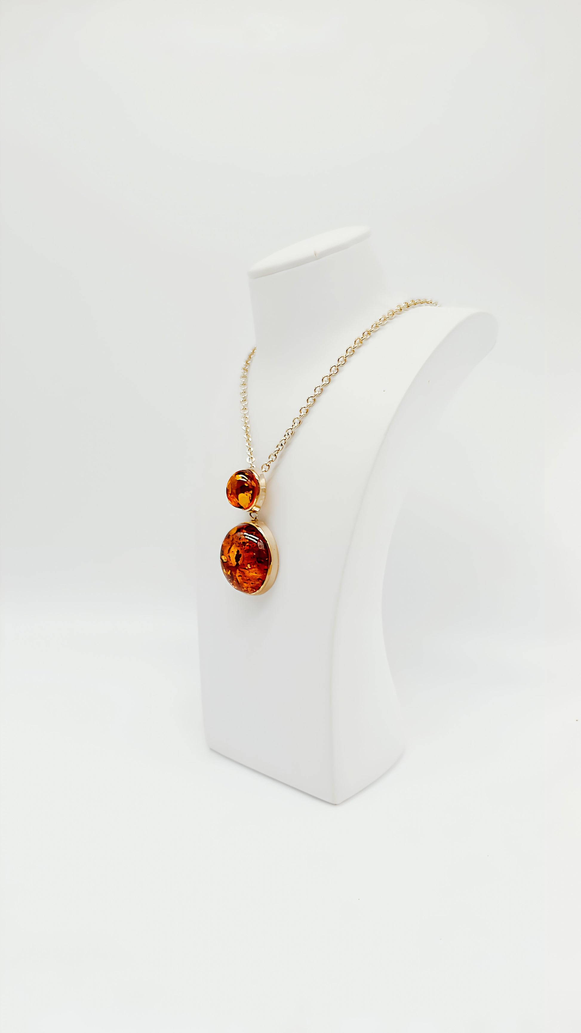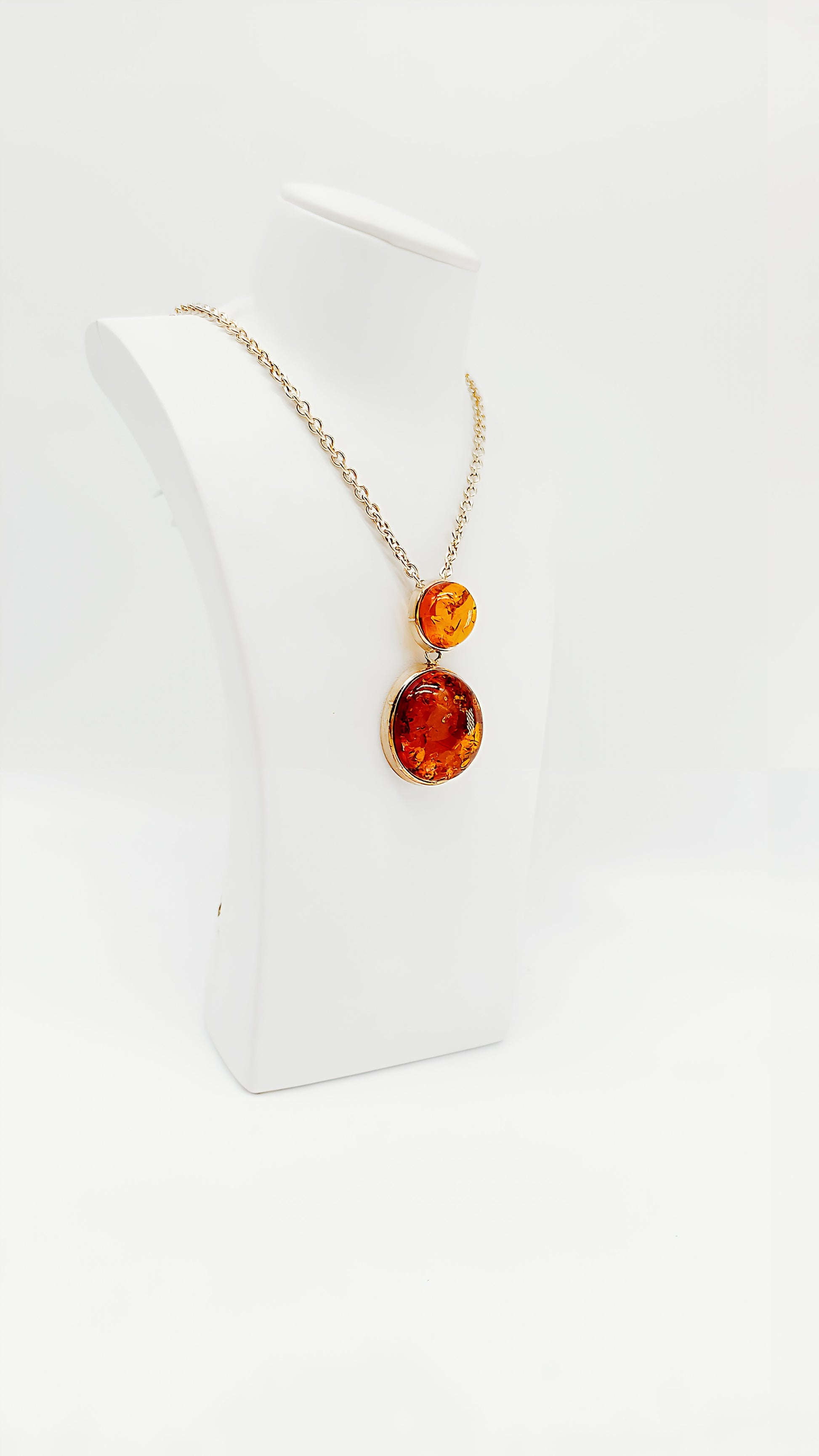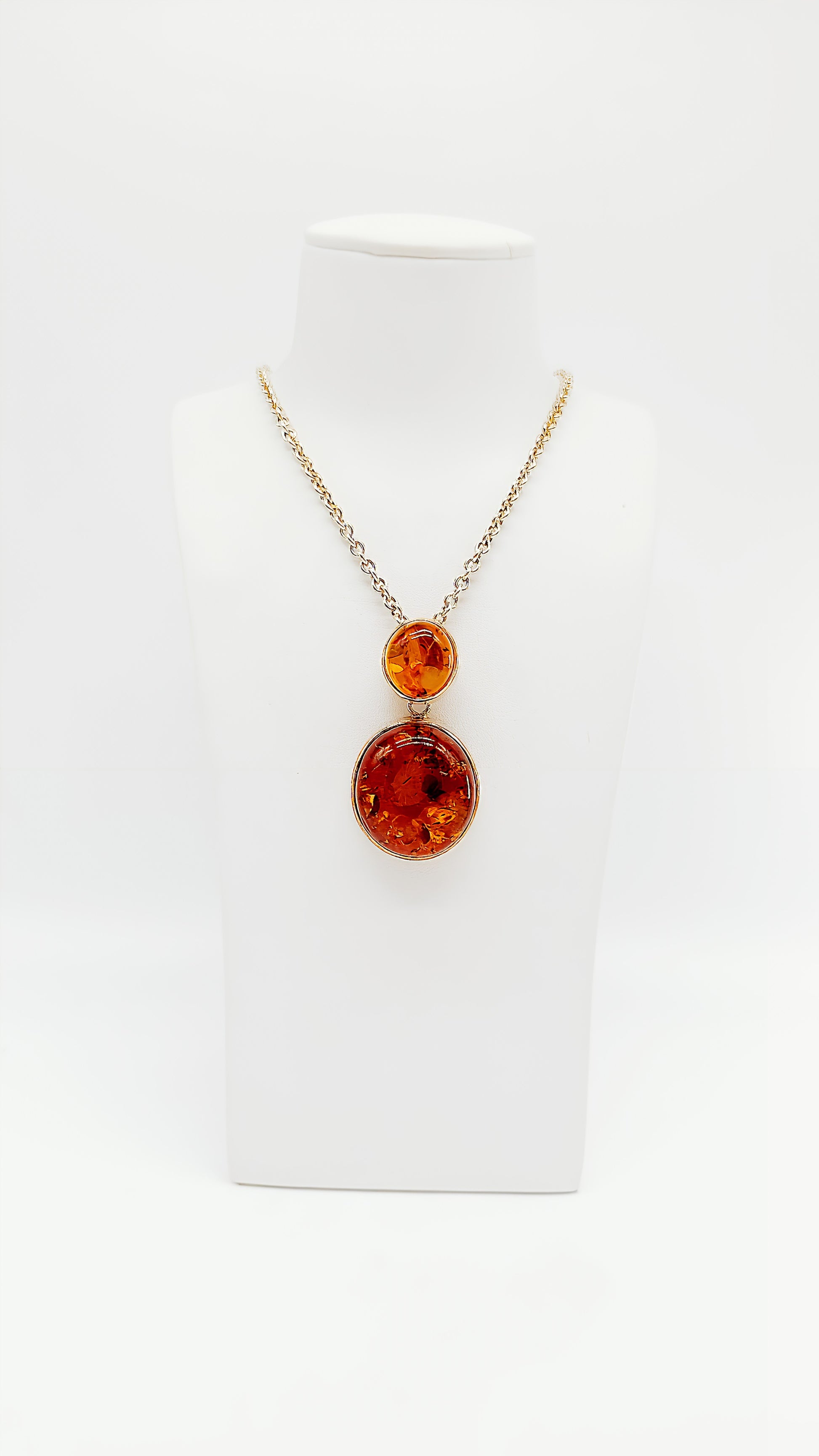 Dieser atemberaubende Anhänger vereint zwei wunderschöne Bernsteine in einem einzigartigen Design. Gefasst in 925er Sterlingsilber, glänzen die warmen, orangefarbenen Steine mit einem natürlichen, goldenen Schimmer. Die Kombination aus kleinem und großem Bernstein sorgt für eine elegante und stilvolle Optik, die jedem Outfit eine besondere Note verleiht. Ein echtes Unikat, das die Schönheit der Natur und die Kunst der Schmuckherstellung perfekt vereint.