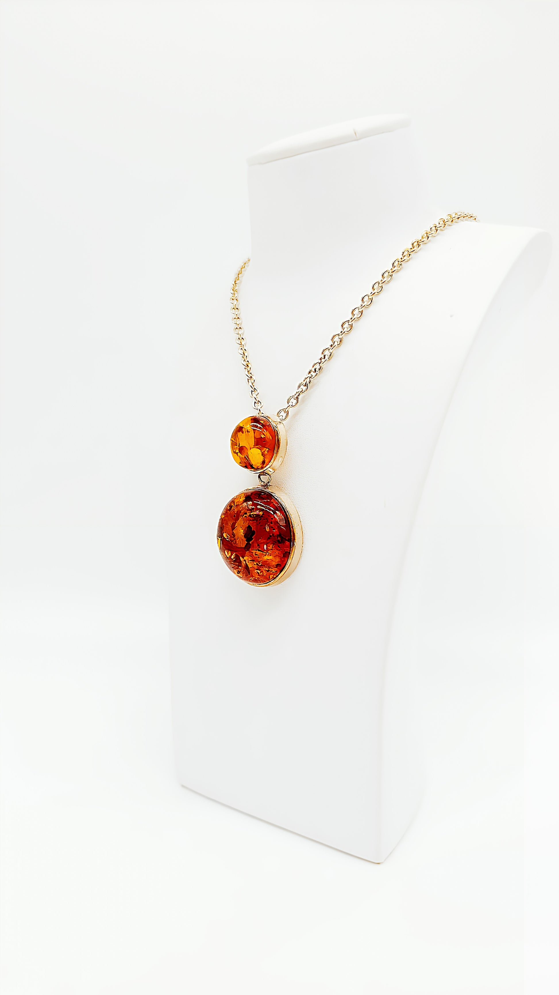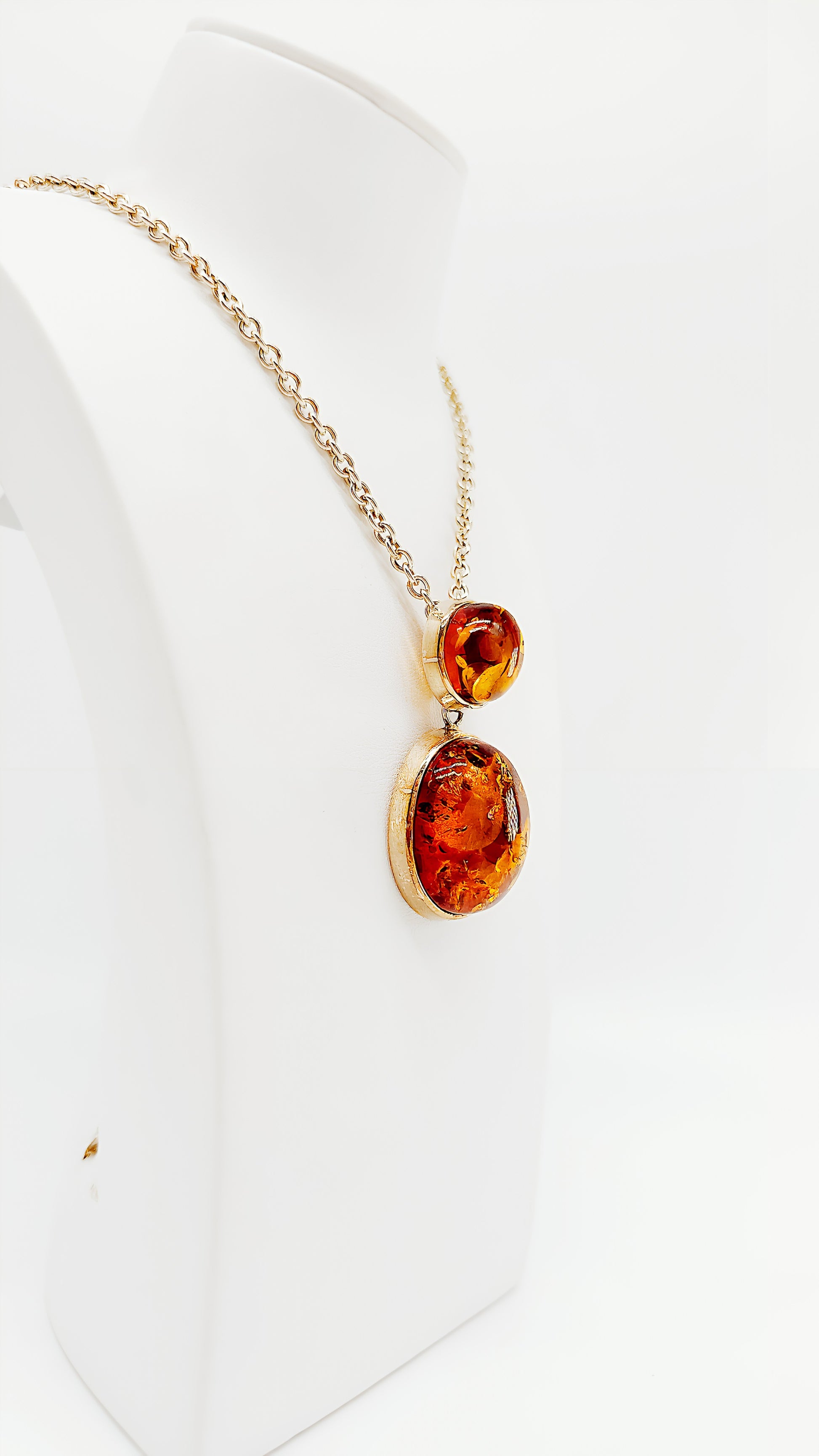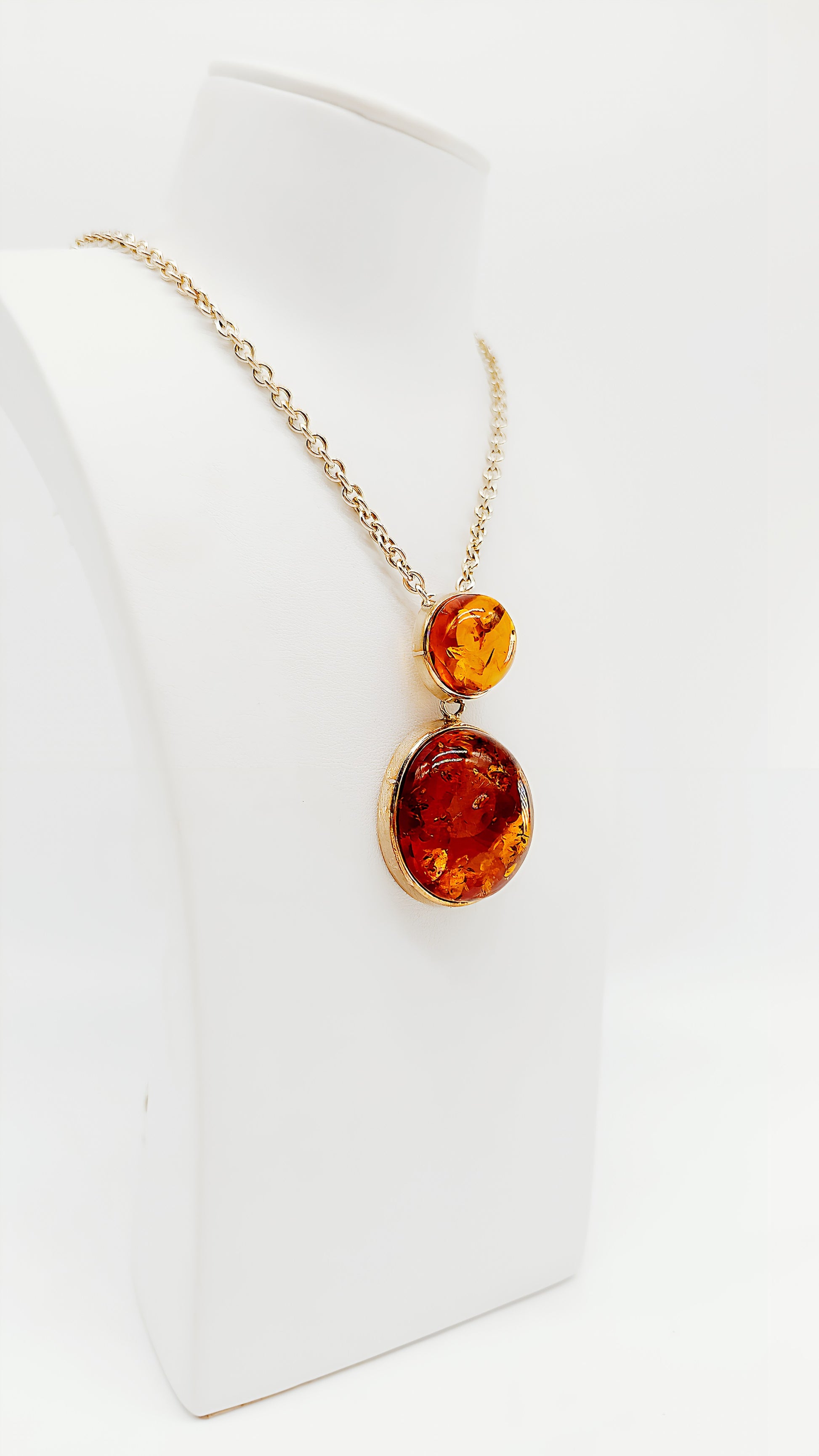 Dieser atemberaubende Anhänger vereint zwei wunderschöne Bernsteine in einem einzigartigen Design. Gefasst in 925er Sterlingsilber, glänzen die warmen, orangefarbenen Steine mit einem natürlichen, goldenen Schimmer. Die Kombination aus kleinem und großem Bernstein sorgt für eine elegante und stilvolle Optik, die jedem Outfit eine besondere Note verleiht. Ein echtes Unikat, das die Schönheit der Natur und die Kunst der Schmuckherstellung perfekt vereint.