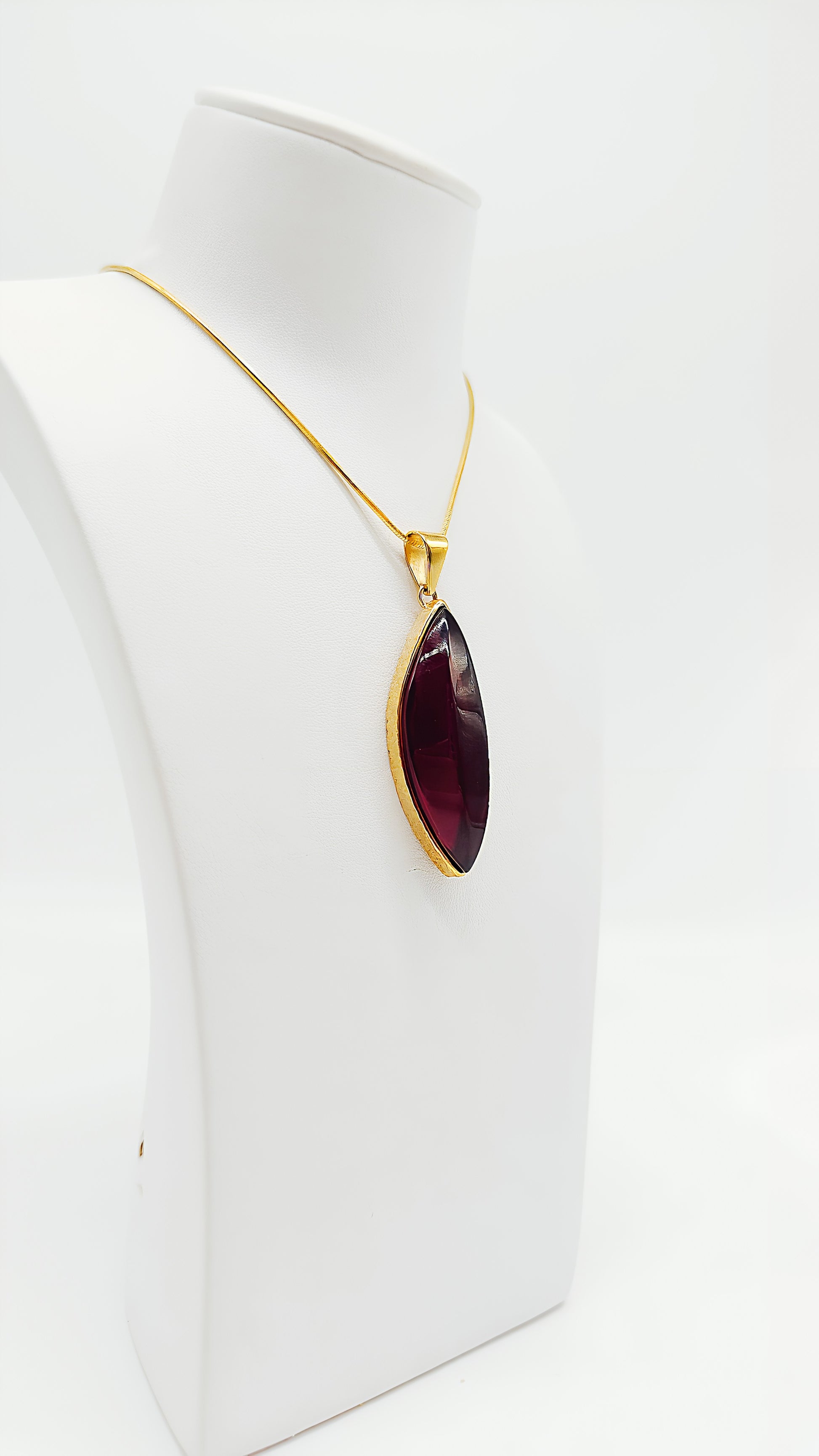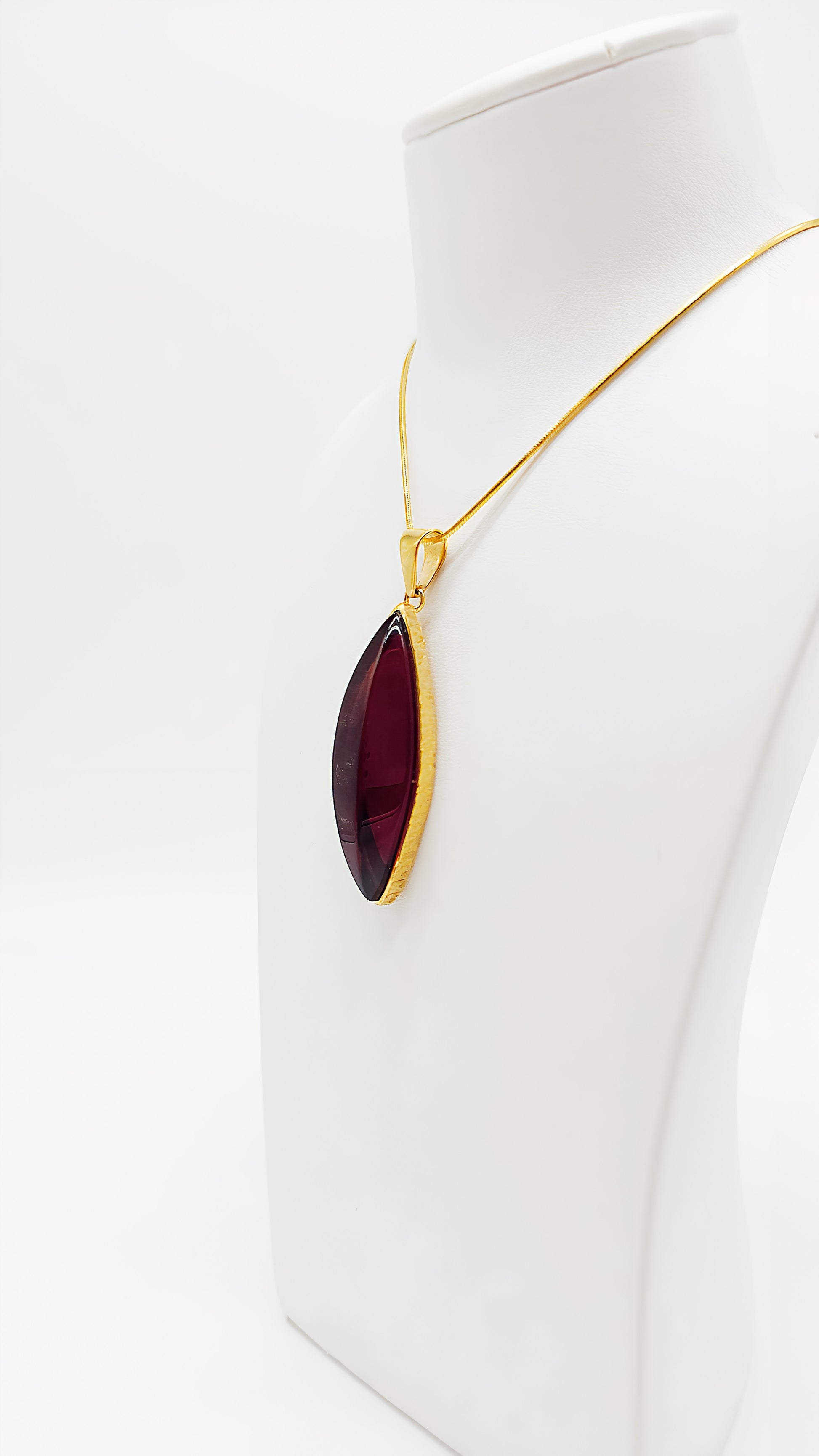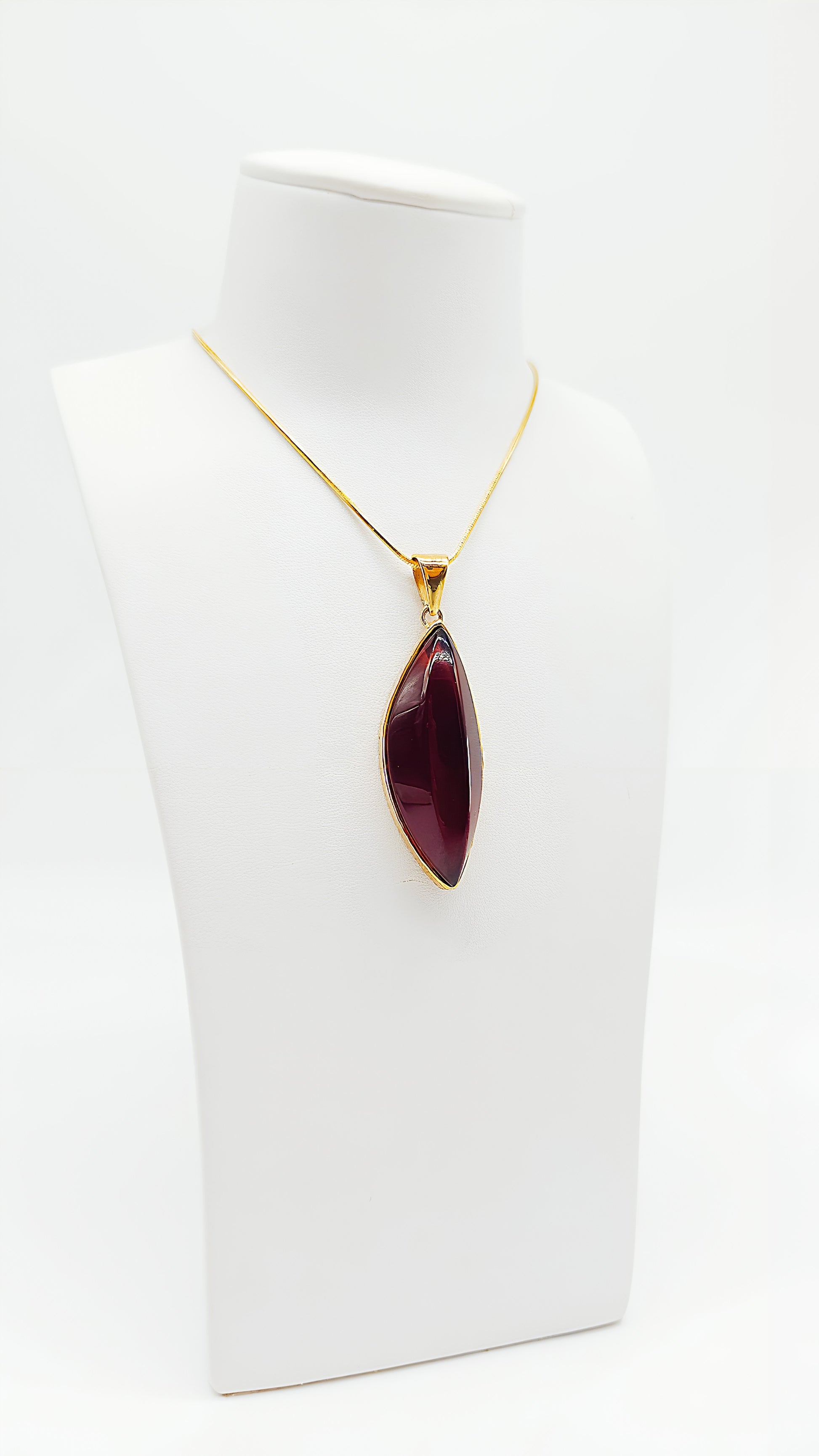 Dieser exquisite Anhänger aus vergoldetem 925er Sterlingsilber vereint zeitlose Eleganz mit der warmen, natürlichen Schönheit des Bernsteins. Das tiefrote, facettierte Bernstein-Element verleiht dem Anhänger einen einzigartigen Glanz, der von der sanften Umrahmung aus edlem Gold unterstrichen wird. Ob zu einem eleganten Anlass oder als stilvoller Akzent im Alltag – dieser Anhänger ist ein vielseitiger Begleiter, der jedes Outfit aufwertet. Die hochwertige Verarbeitung und das Zusammenspiel von Gold und Bernstein machen dieses Schmuckstück zu einem wahren Highlight.