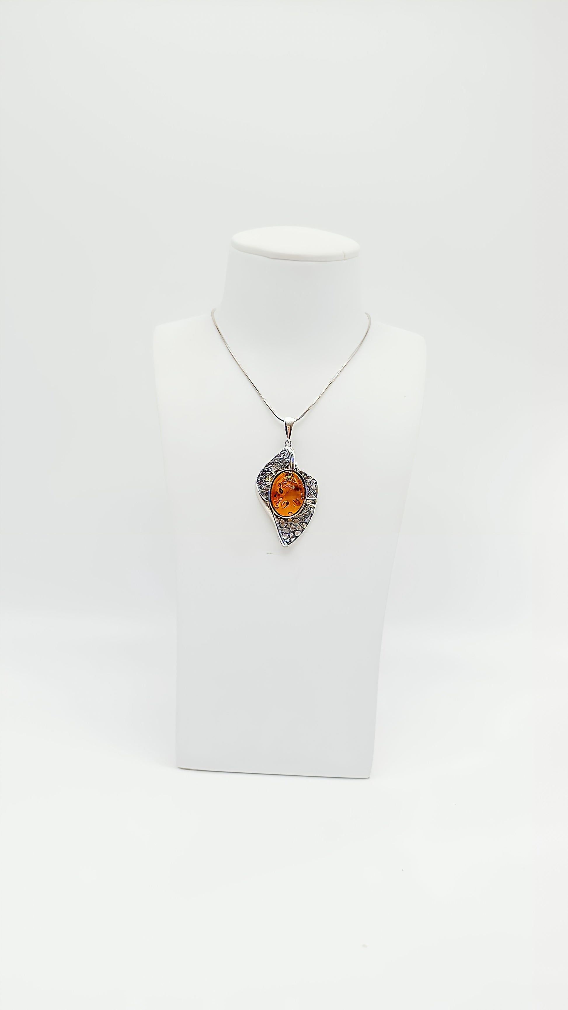 Dieser faszinierende Anhänger aus 925er Sterlingsilber ist eine Hommage an die Kunst der Natur. Der warme, honigfarbene Bernstein wird von einem kunstvoll gestalteten Silberrahmen umschlossen, der mit filigranen Details verziert ist. Das außergewöhnliche Design erinnert an Blätter oder Wellen, die den Bernstein wie ein wertvolles Juwel in Szene setzen. Perfekt verarbeitet und einzigartig in seiner Form, ist dieser Anhänger ein echter Hingucker, der jedem Outfit das gewisse Etwas verleiht.