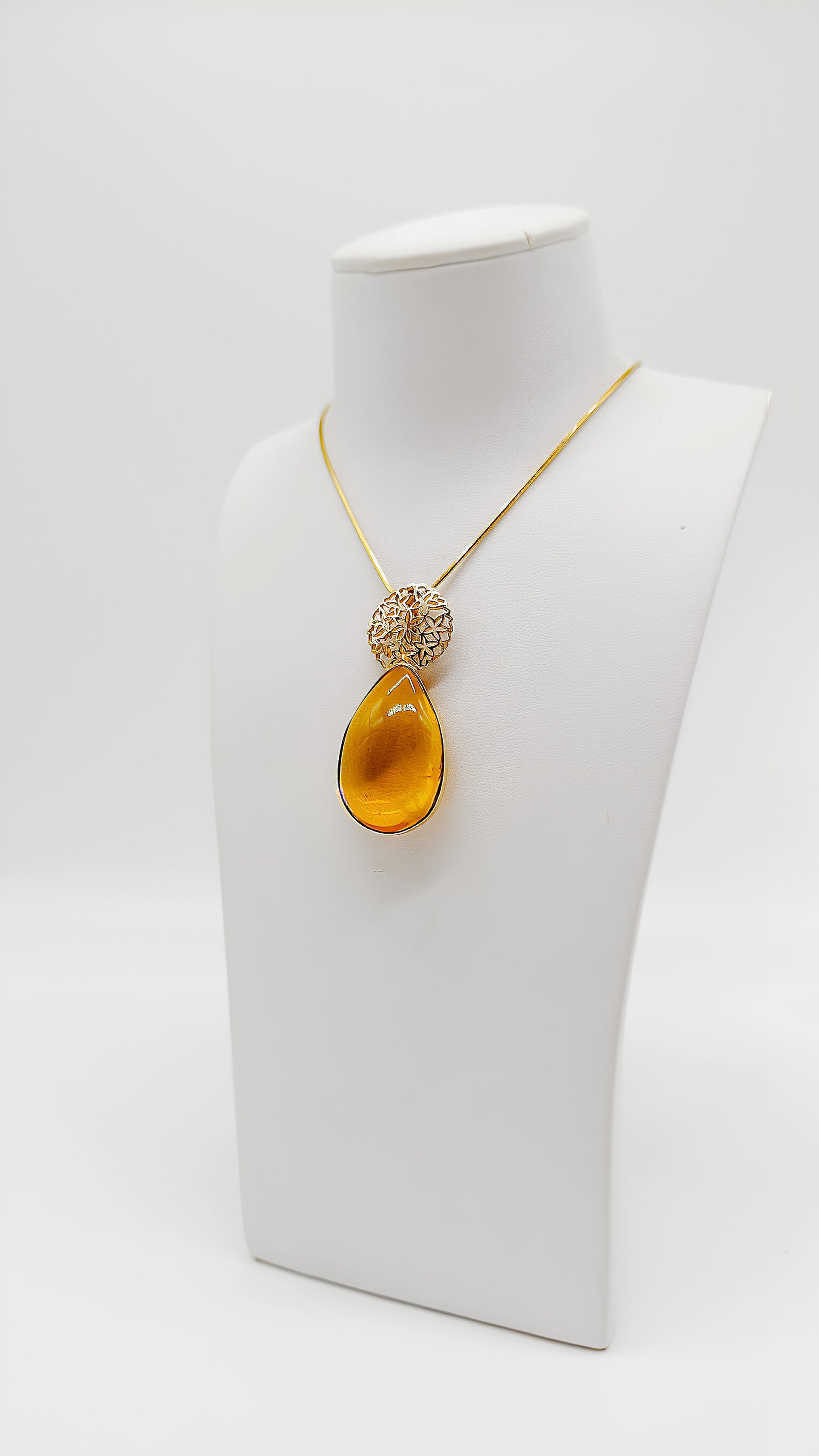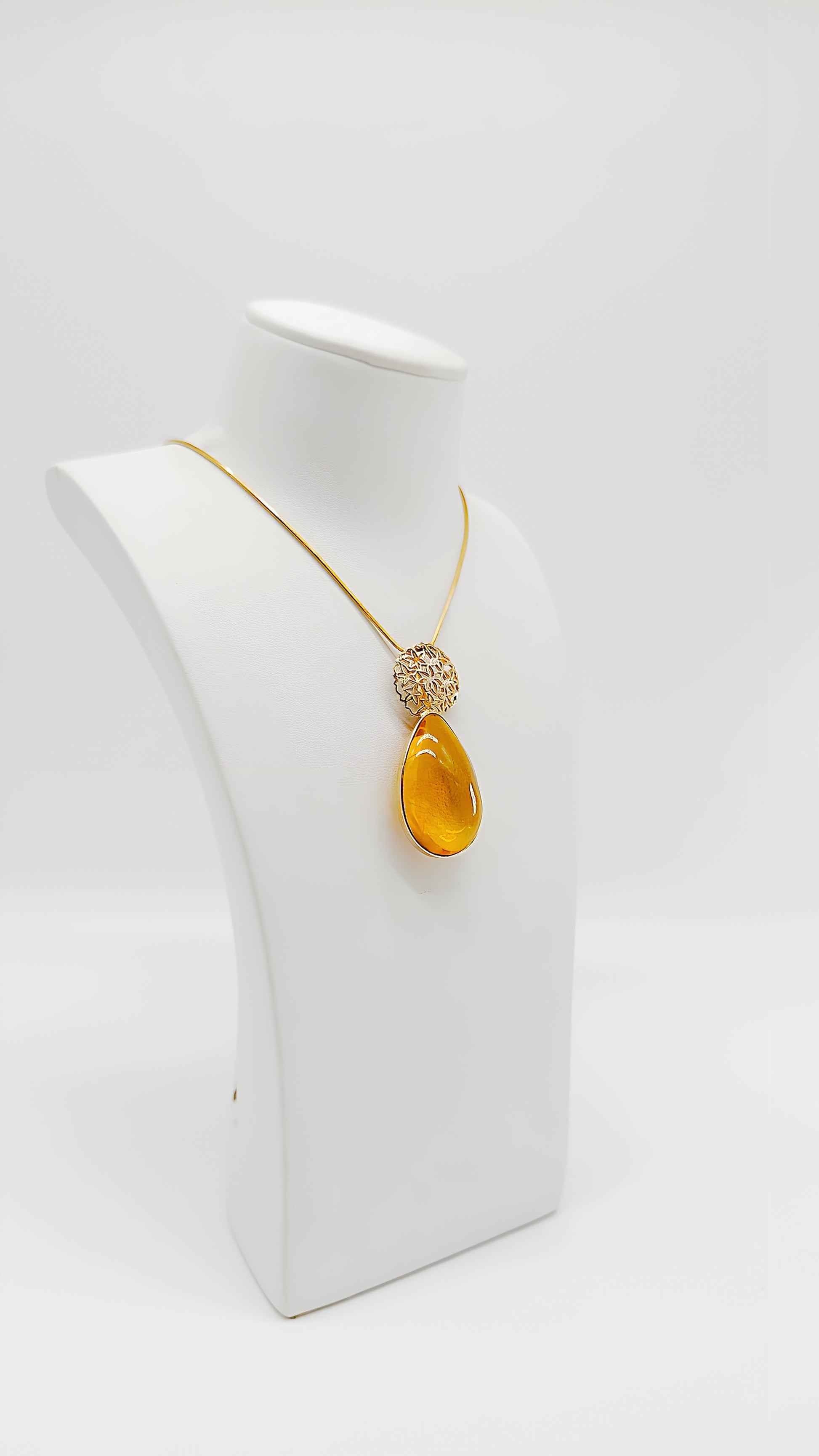 Dieser beeindruckende Anhänger aus vergoldetem 925er Sterlingsilber kombiniert die zeitlose Schönheit des Bernsteins mit einer eleganten, goldenen Fassung. Der honigfarbene Bernstein in Tropfenform wird durch das filigrane, vergoldete Muster oberhalb des Steins wunderschön ergänzt. Die sanfte Wärme des Bernsteins harmoniert perfekt mit dem goldenen Glanz des Silbers und verleiht diesem Schmuckstück eine luxuriöse Ausstrahlung. Ob zu besonderen Anlässen oder als tägliches Highlight – dieser Anhänger veredelt jedes Outfit mit Eleganz und Stil.