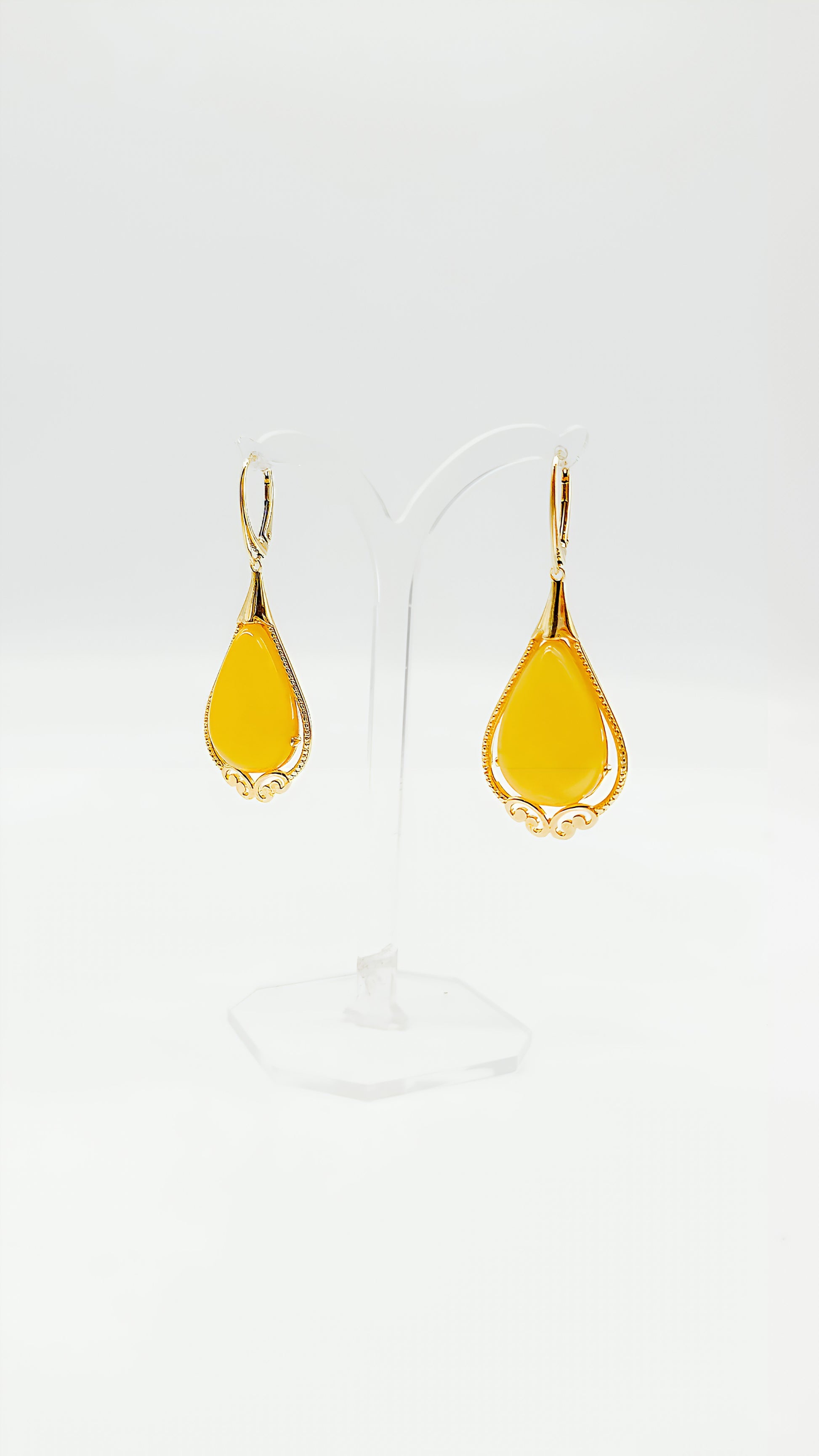 Diese eleganten Ohrhänger aus vergoldetem 925er Sterlingsilber präsentieren einen leuchtend gelben Bernsteintropfen, der von zarten Verzierungen umrahmt wird. Der warme Glanz des Bernsteins trifft auf die edlen Goldakzente und verleiht dem Schmuckstück einen luxuriösen, aber dennoch natürlichen Look. Perfekt, um jedem Outfit eine Extraportion Eleganz und Wärme zu verleihen – ob für besondere Anlässe oder als tägliches Highlight.
