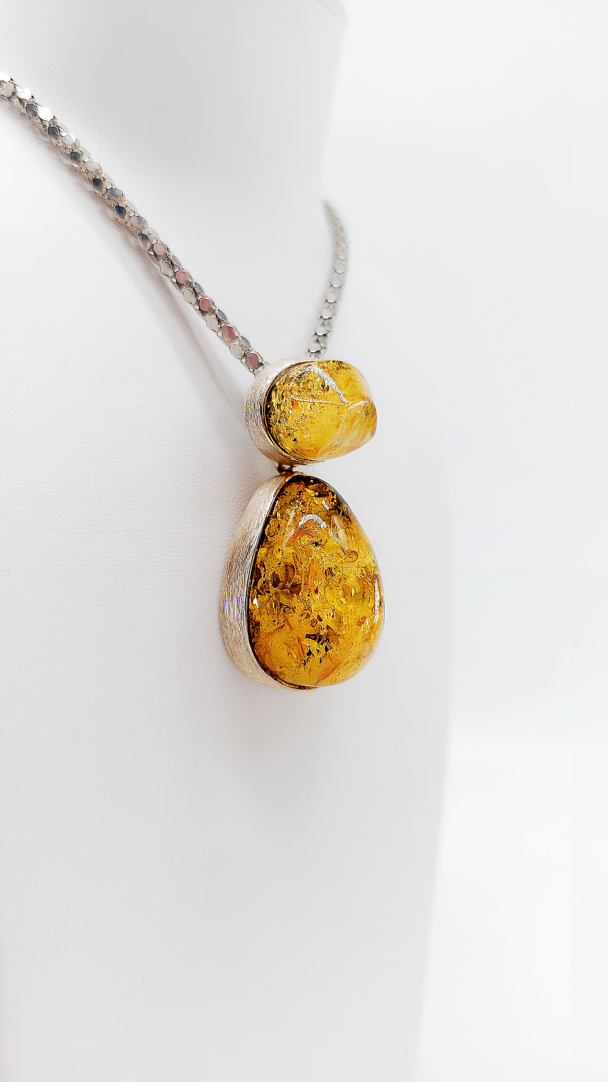 Dieser doppelte Bernsteinanhänger aus 925er Sterlingsilber kombiniert zwei wunderschöne Bernsteine in unterschiedlichen Formen und Größen zu einem einzigartigen Design. Die goldenen Töne des Bernsteins strahlen Wärme aus, während die filigrane Silberfassung das Schmuckstück zu einem stilvollen und eleganten Accessoire macht. Ein echtes Unikat für Frauen, die einzigartigen und natürlichen Schmuck lieben. Ideal als Geschenk für besondere Anlässe oder als persönliches Highlight für jeden Tag.
