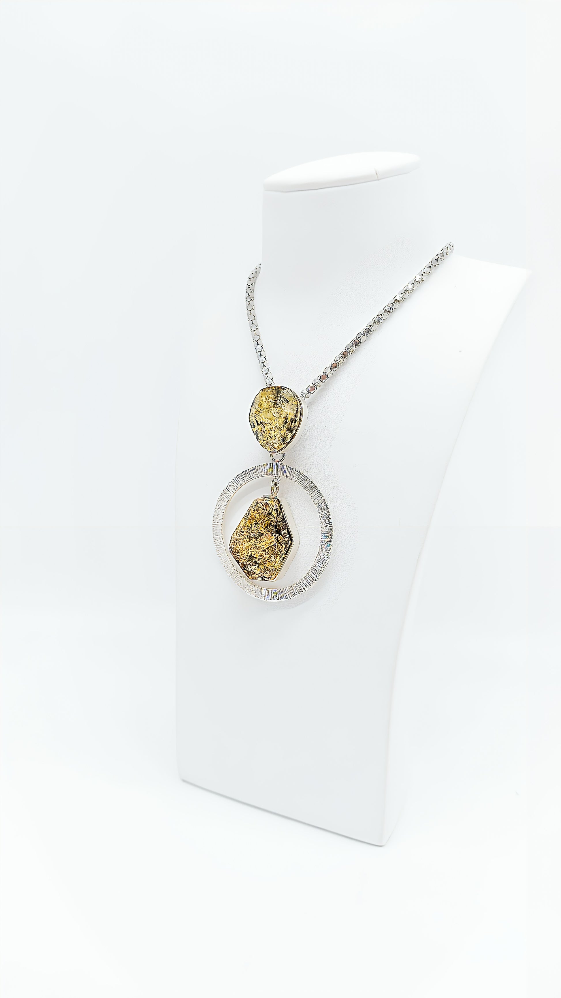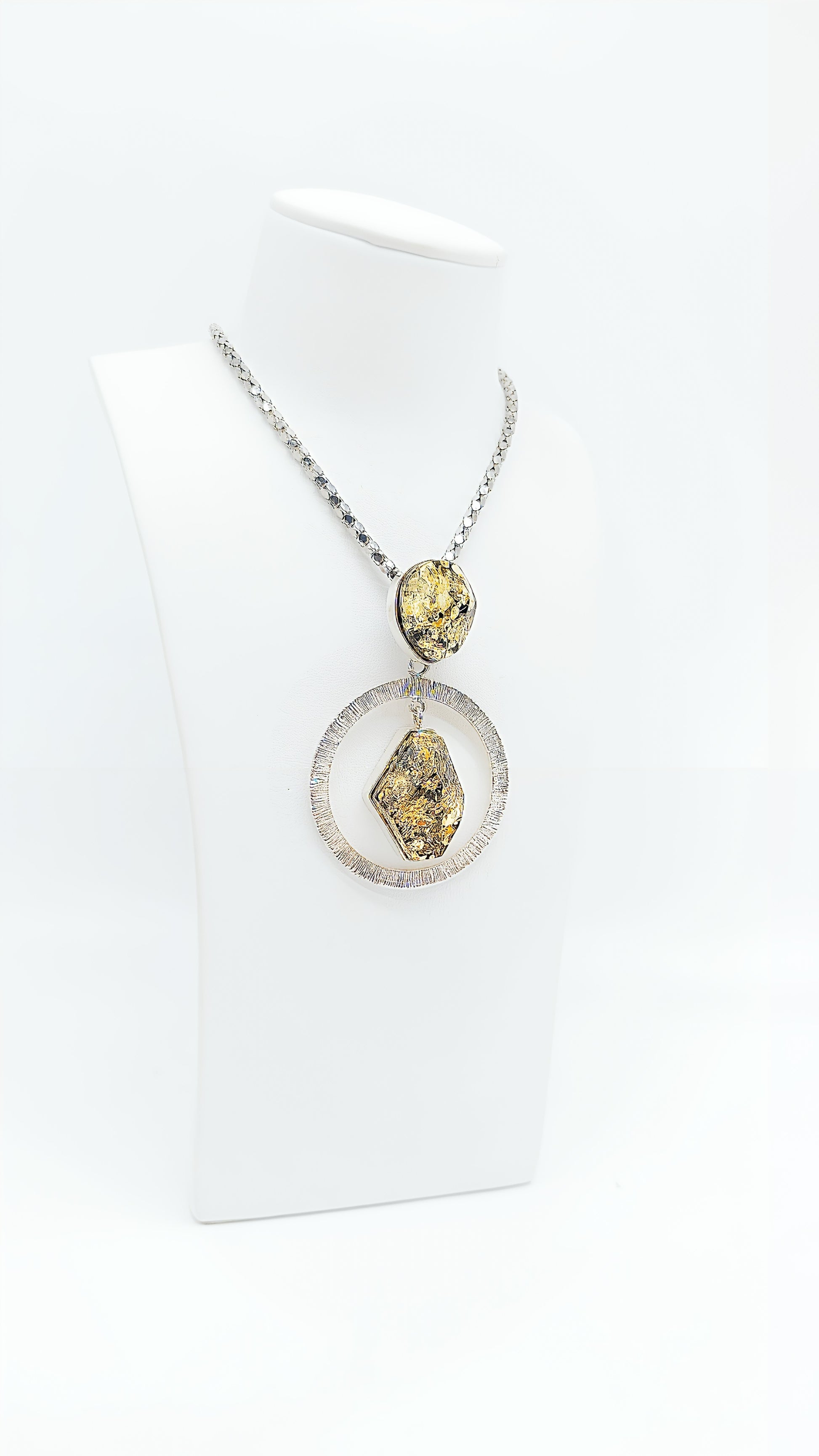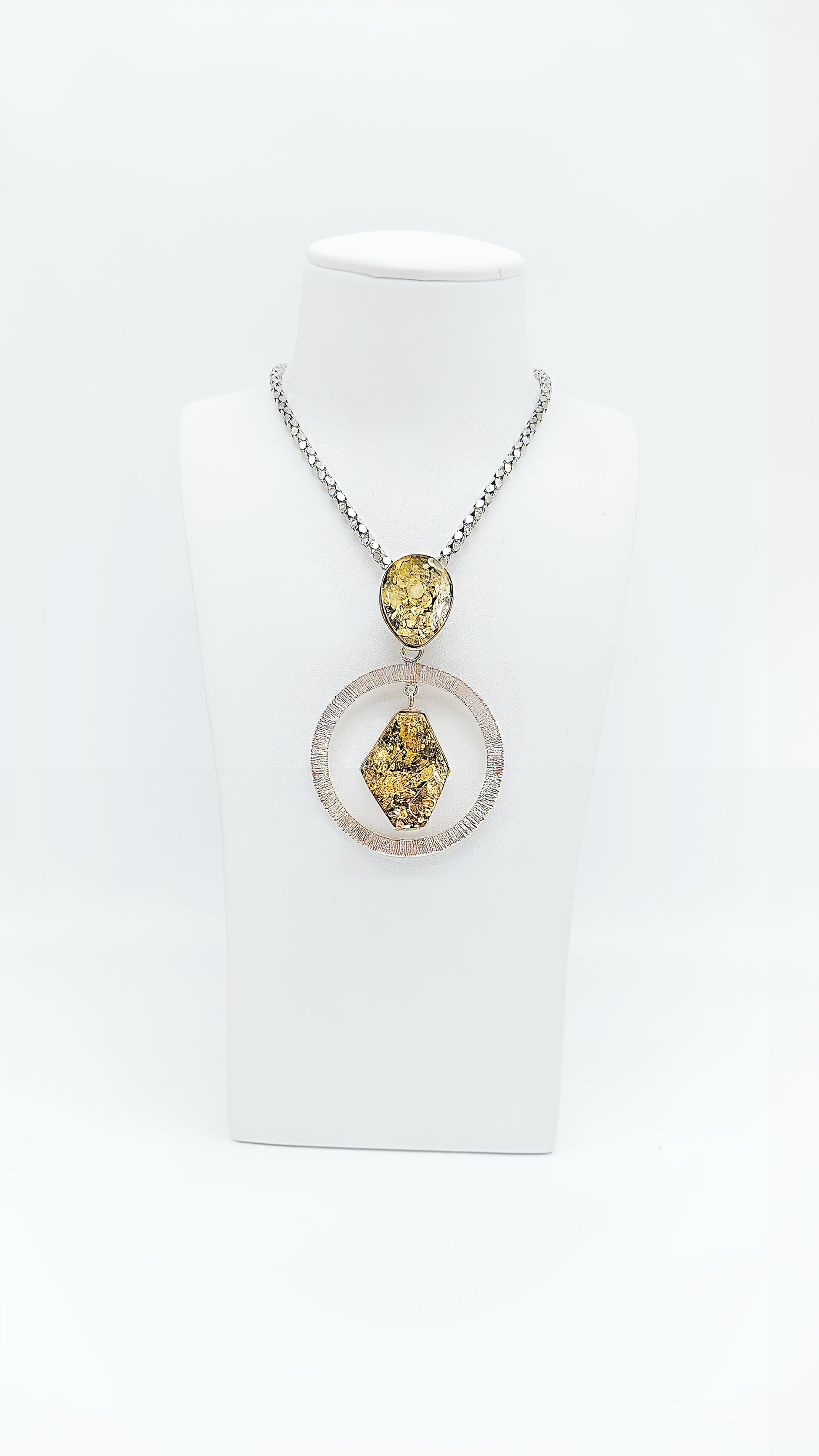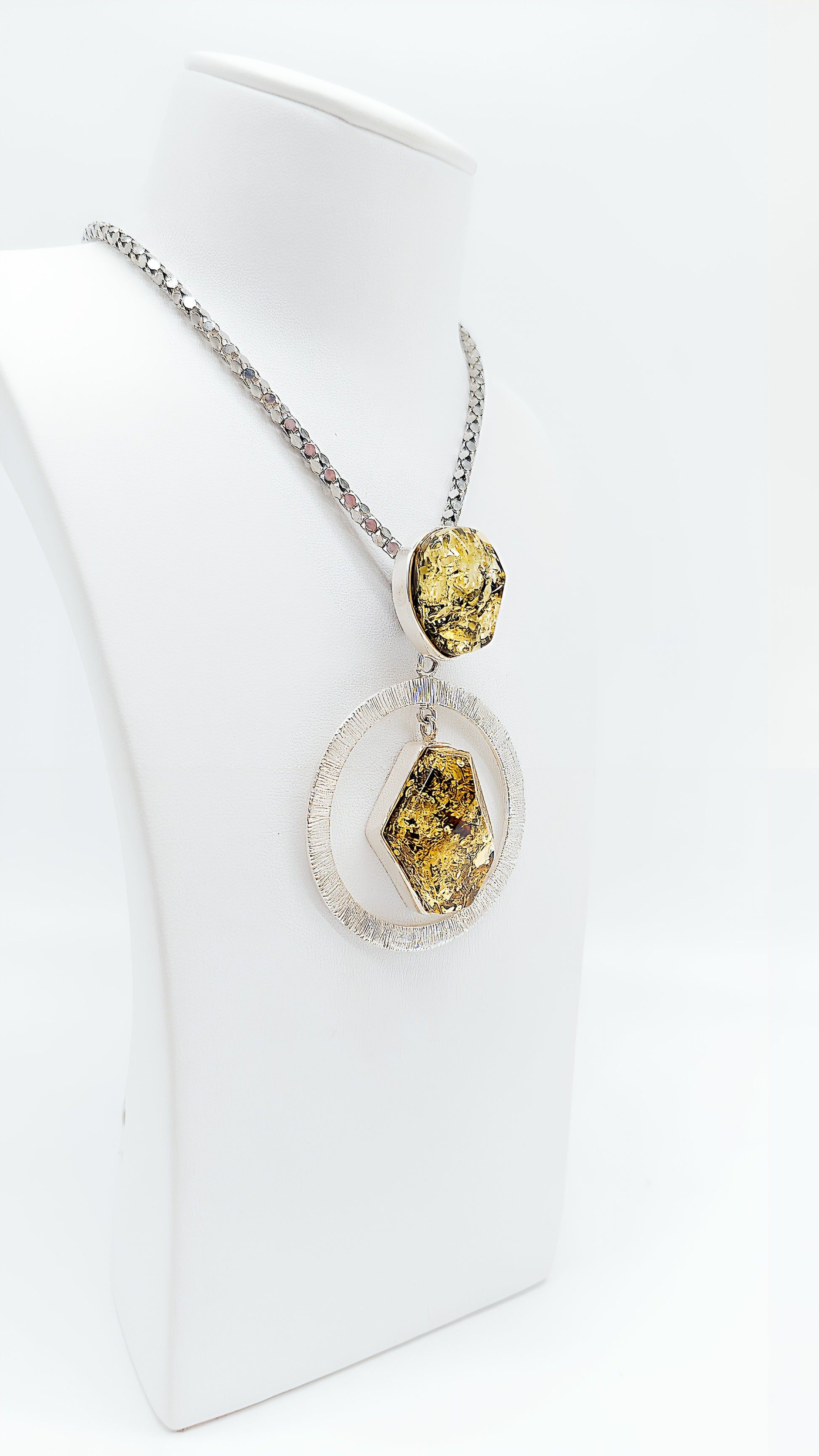 Dieser extravagante Bernsteinanhänger aus 925er Sterlingsilber kombiniert kunstvolles Design mit natürlicher Schönheit. Der warme Bernstein in geometrischer Form wird von zwei eleganten Rahmen gehalten, die ihm eine moderne und zugleich edle Ausstrahlung verleihen. Durch die verspielte Kombination aus Kreis- und Polygonformen ist dieser Anhänger ein echter Hingucker und ein absolutes Unikat. Ideal für Frauen, die einen außergewöhnlichen Stil lieben. Perfekt als besonderes Geschenk oder als exklusives Accessoire für stilvolle Anlässe.