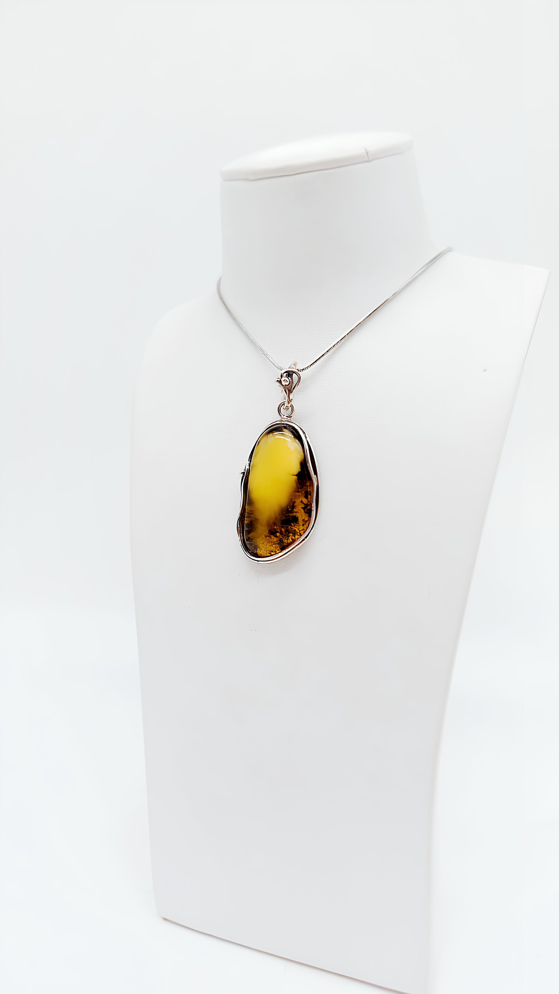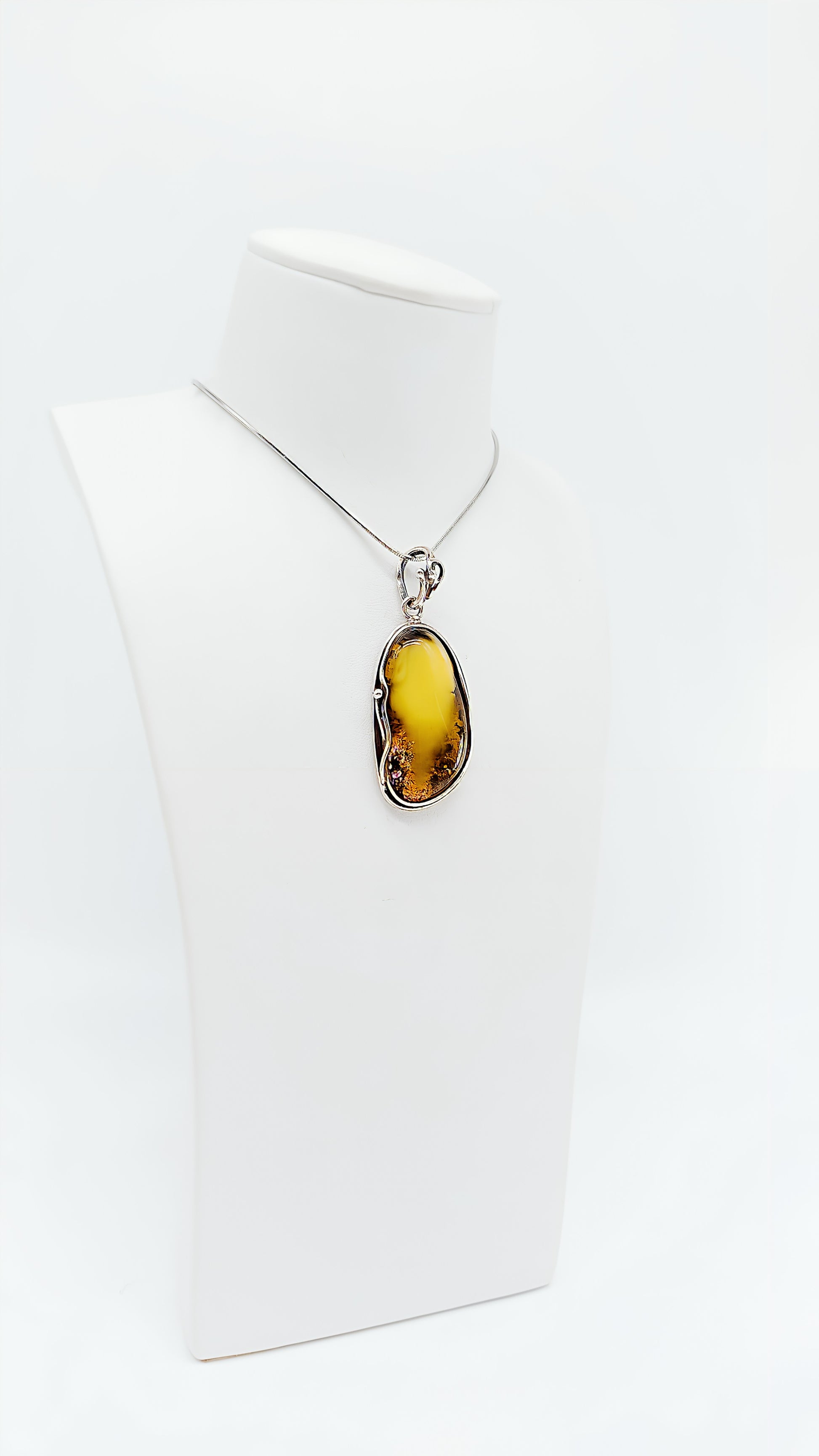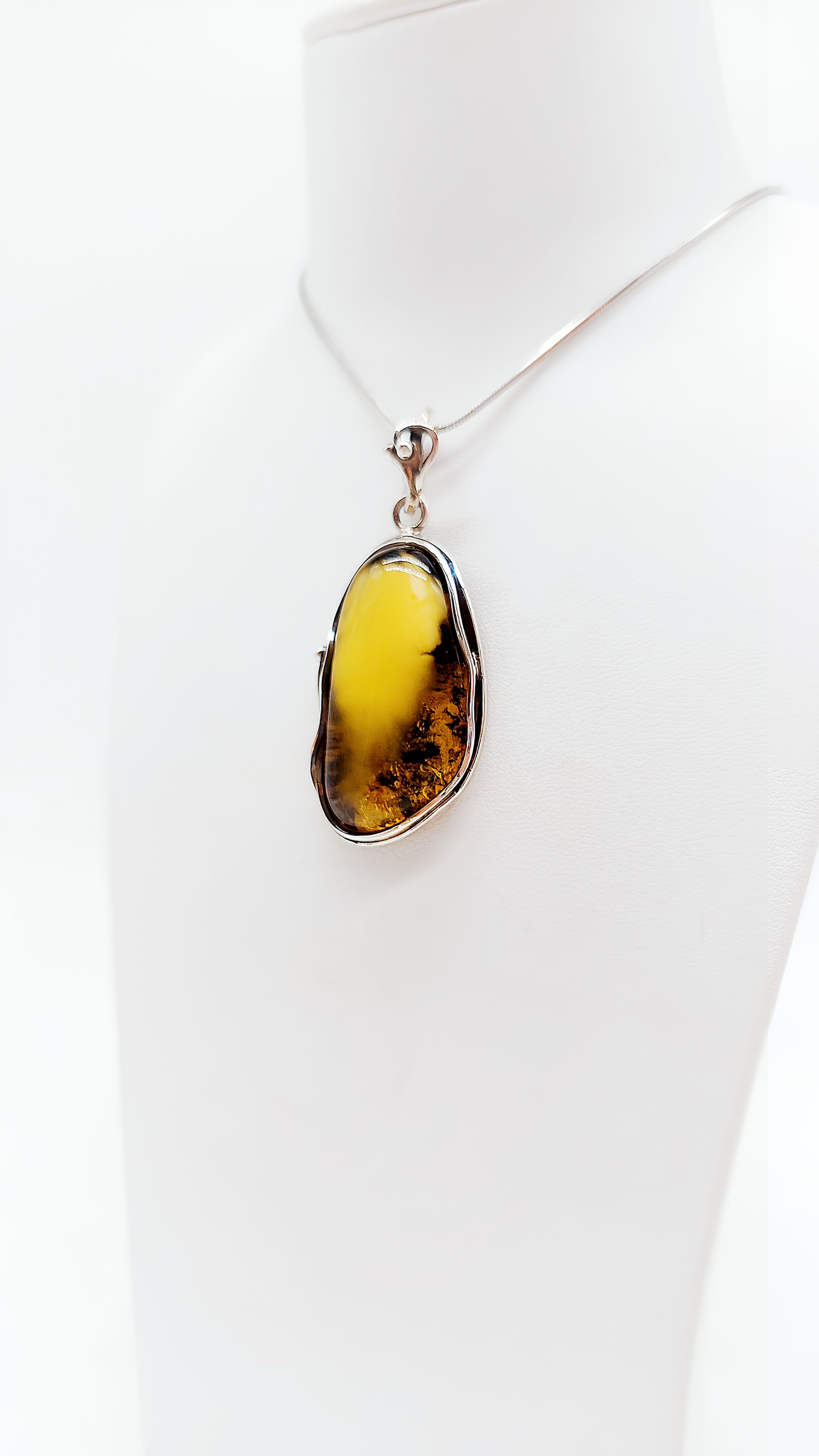 Dieser außergewöhnliche Bernstein-Anhänger verbindet Natur und Eleganz in einem einzigartigen Schmuckstück. Der handgefertigte Anhänger besteht aus hochwertigem 925er Sterlingsilber und einem echten Naturbernstein mit faszinierendem Farbverlauf in goldgelben und dunklen Tönen. Die geschwungene Silberfassung unterstreicht die organische Form und hebt die natürliche Schönheit des Bernsteins hervor. Dank seines modernen Unisex-Designs eignet sich dieses Schmuckstück sowohl für Damen als auch für Herren. Perfekt als stilvolles Accessoire oder als exklusives Geschenk für besondere Menschen.