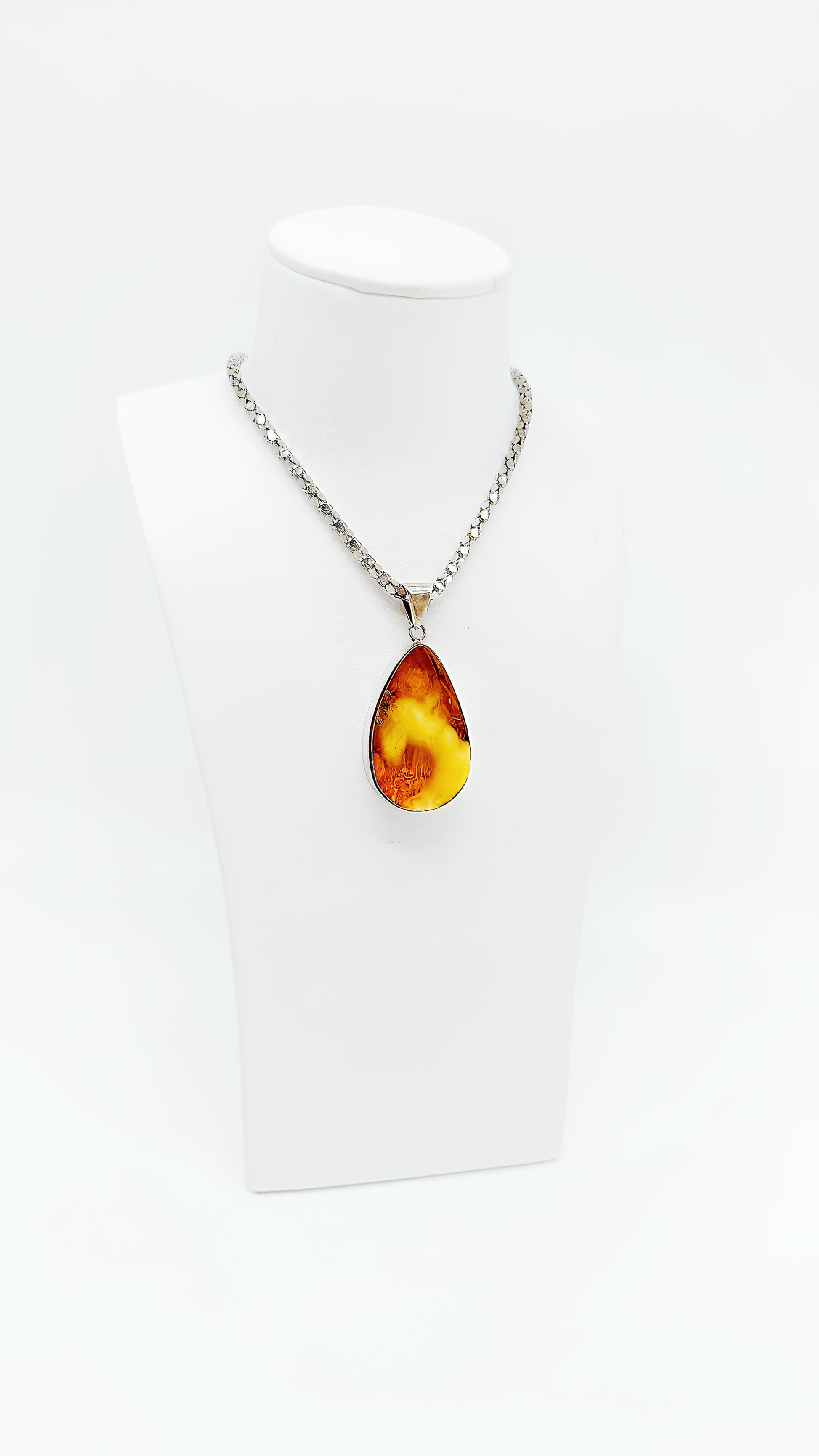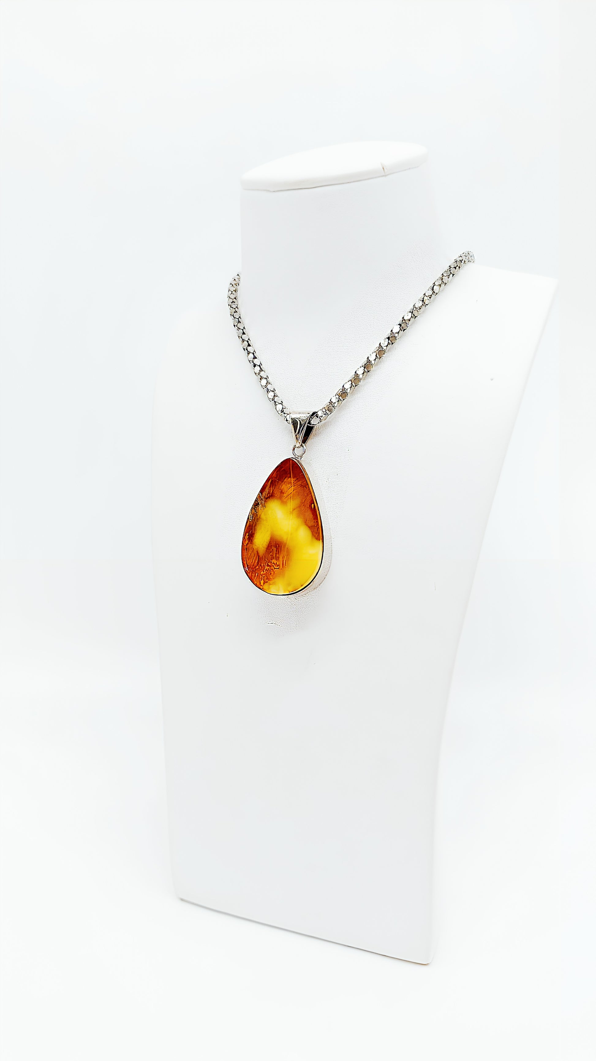 Dieser wunderschöne Bernstein-Anhänger in edler Tropfenform ist ein Unikat aus echtem Naturbernstein und wurde in 925er Sterlingsilber gefasst. Der Stein beeindruckt mit einem einzigartigen Farbverlauf von Honiggelb bis Cognac und natürlichem Einschlussmuster.