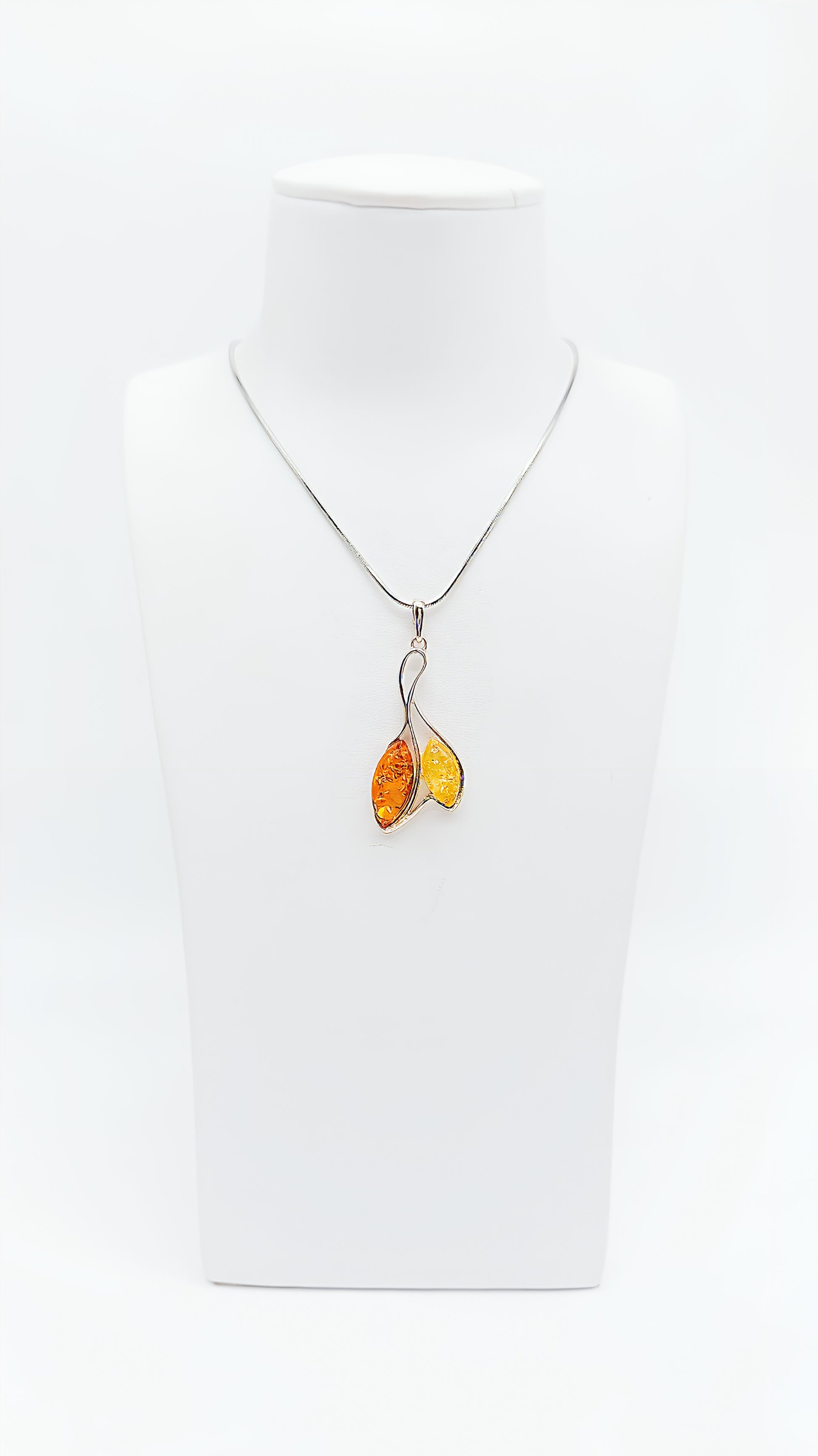 Dieser exquisite Anhänger aus 925er Sterlingsilber vereint die natürliche Schönheit zweier Bernsteinsorten in warmen Gold- und Orangetönen. Die beiden tropfenförmigen Bernsteine werden von einer geschwungenen Silberfassung elegant umschlossen, wodurch das Schmuckstück eine sanfte und dynamische Bewegung erhält. Die unterschiedlichen Farben des Bernsteins erinnern an die warmen Farben eines herbstlichen Blättertanzes, während die Silberfassung dem Design eine moderne und zeitlose Eleganz verleiht.