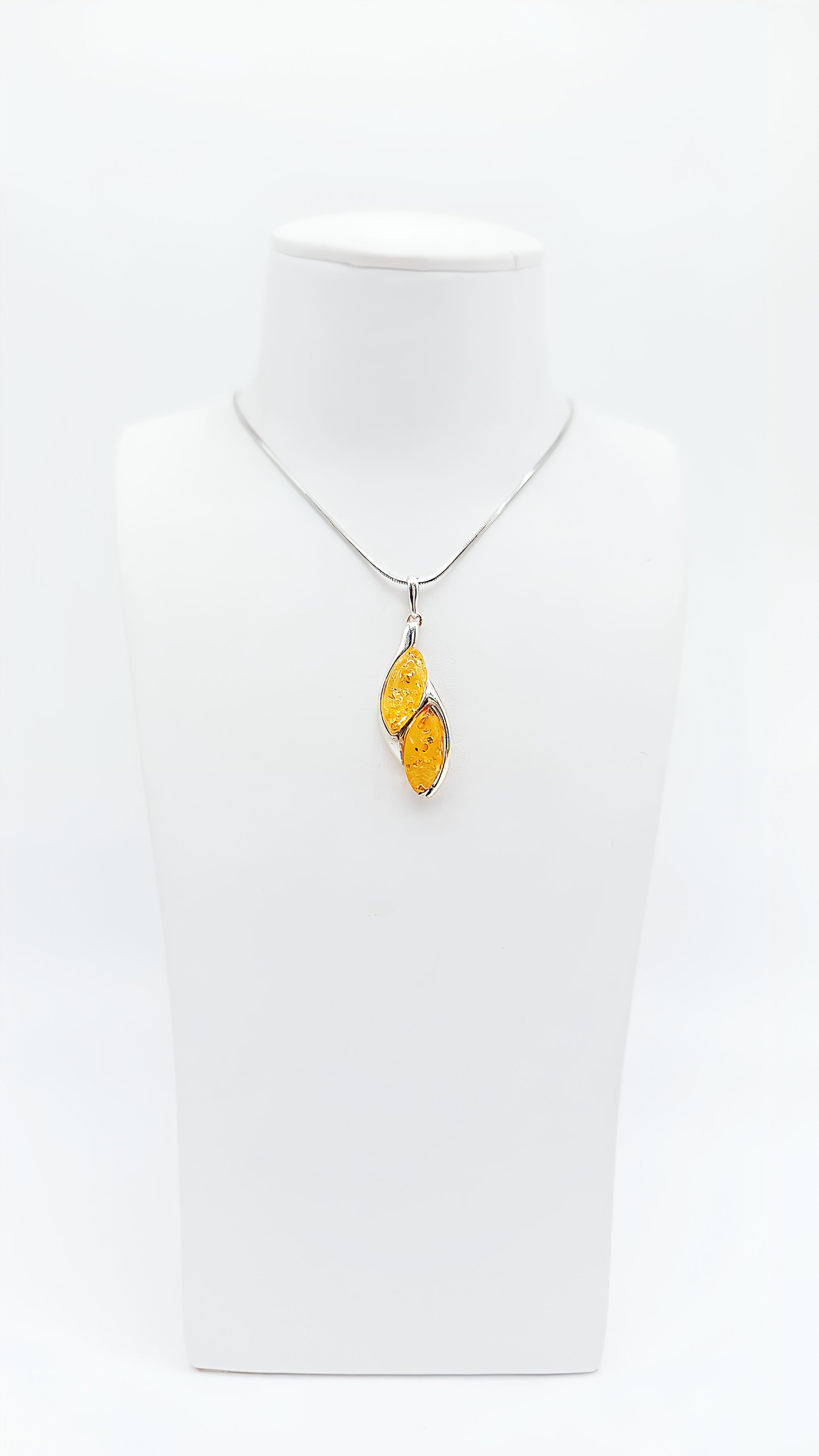 Dieser wunderschöne Anhänger vereint die strahlende Wärme von zwei gelben Bernsteinen in einem geschwungenen Design aus 925er Sterlingsilber. Die beiden Bernsteine sind in eine fließende Silberfassung eingebettet, die ihre natürliche Schönheit unterstreicht und dem Schmuckstück eine harmonische, elegante Ausstrahlung verleiht. Die warmen Gelbtöne des Bernsteins symbolisieren Freude und Energie, während das Silber zeitlose Eleganz verleiht. Bernstein steht für Schutz und positive Energie und ist seit jeher ein beliebtes Symbol für Glück. Dieser Anhänger ist das perfekte Accessoire für Frauen, die Eleganz und Natürlichkeit in ihrem Schmuck vereinen möchten. Ob als stilvolles Geschenk oder als persönliches Schmuckstück – dieser Anhänger ist ein zeitloser Begleiter für jeden Anlass.