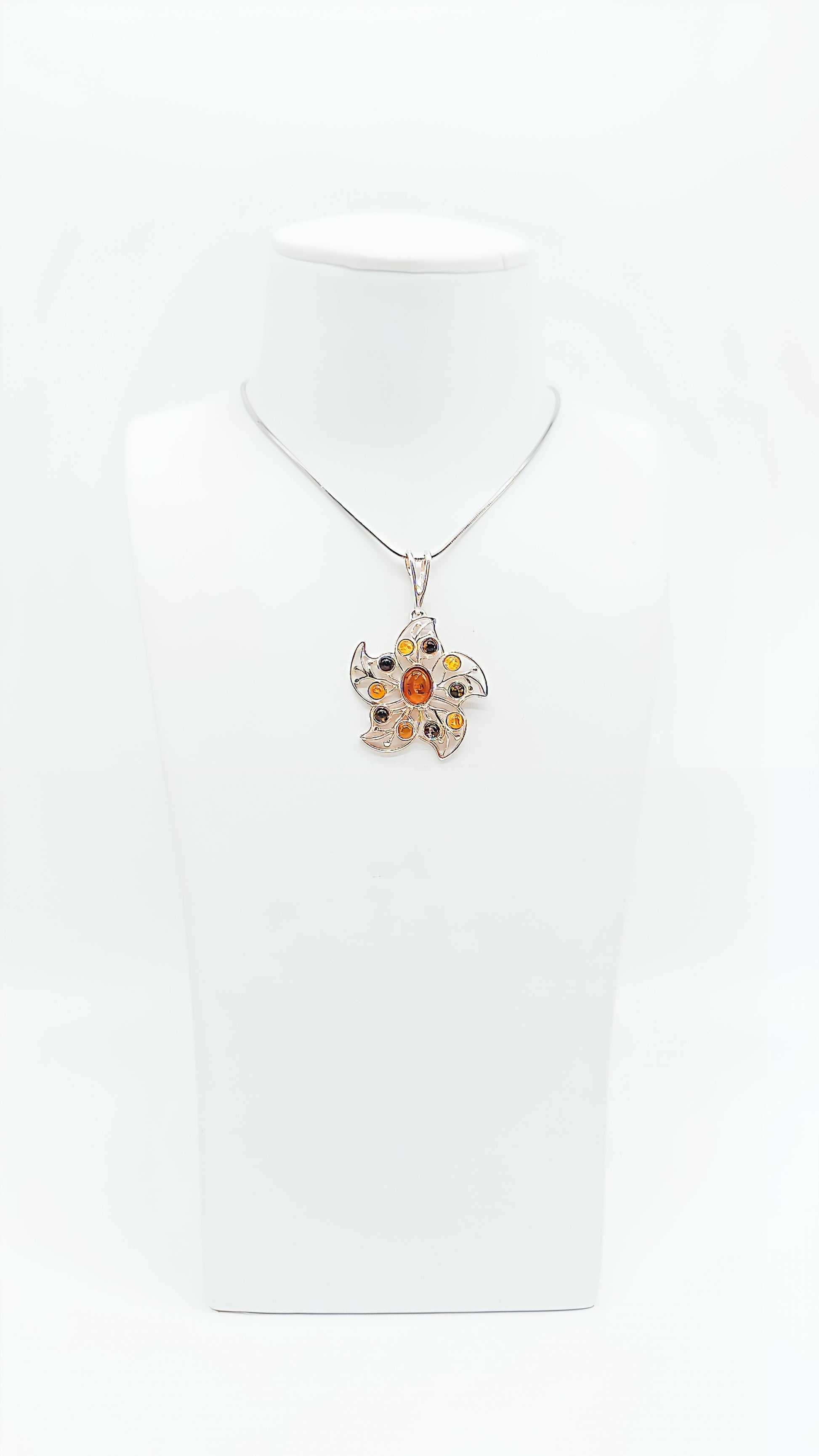 Dieser atemberaubende Anhänger in Blumenform vereint die Harmonische Töne von verschiedenen Bernsteinen in Gelb, Orange und Schwarz. Die kunstvoll gefassten Bernsteine in 925er Sterlingsilber bilden eine elegante Blüte, die die natürliche Schönheit der Steine betont. Der warme Glanz des Bernsteins verleiht diesem Schmuckstück eine lebendige Ausstrahlung, während das Silber den eleganten Rahmen bildet. Dieser Anhänger ist perfekt für Frauen, die ihre Liebe zur Natur und zur stilvollen Eleganz in einem Schmuckstück vereinen möchten. Die Symbolik des Bernsteins als Glücksbringer und der Blume als Zeichen von Schönheit und Erneuerung machen diese Anhänger zu einem besonderen Geschenk für einen lieben Menschen. Ob als Geburtstagsgeschenk, als Zeichen der Zuneigung oder einfach als Ausdruck von Lebensfreude – dieses Schmuckstück bringt Strahlen in jedes Outfit.