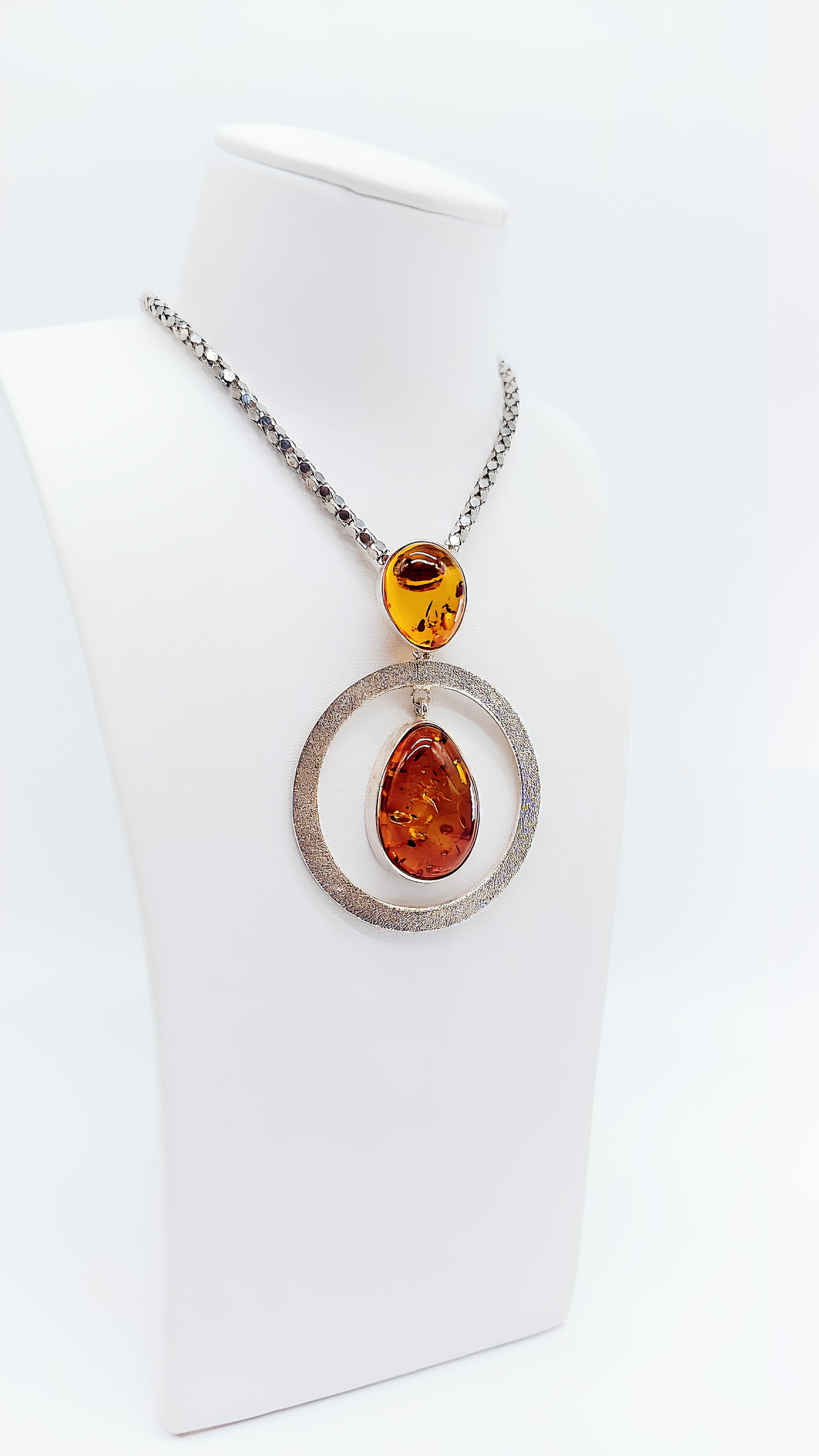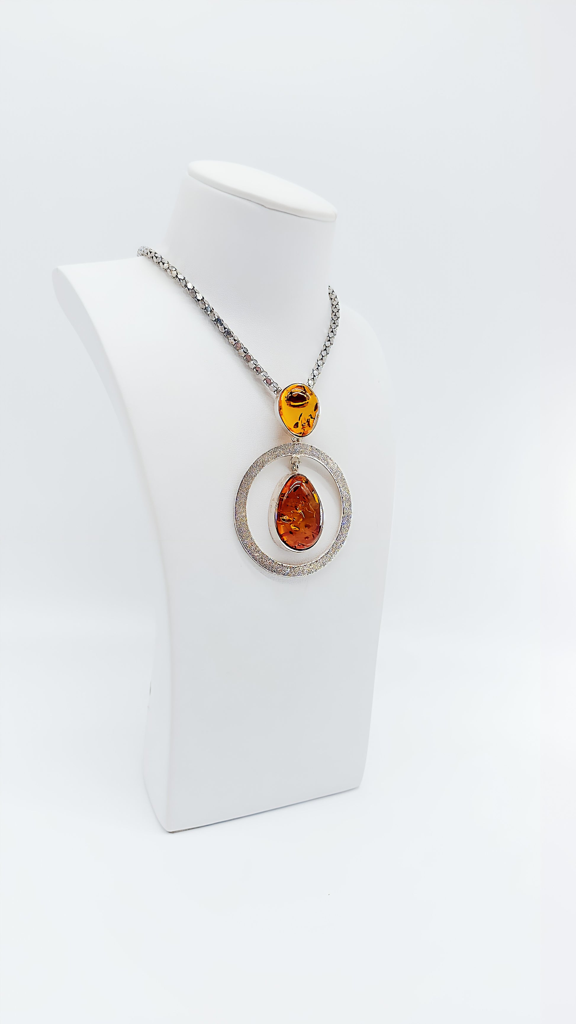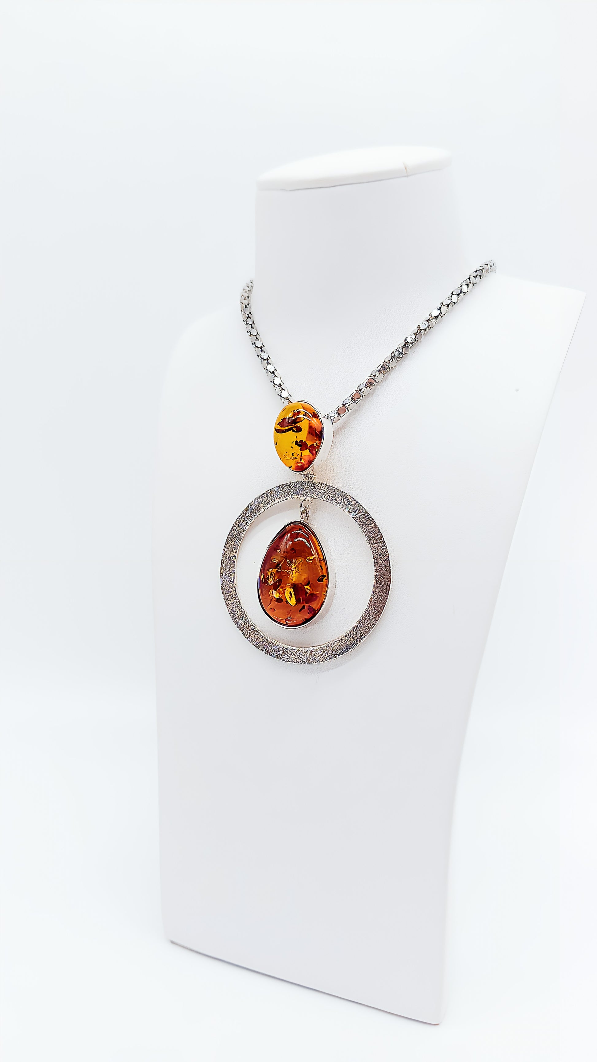 Dieser beeindruckende Anhänger aus 925er Sterlingsilber ist ein wahres Unikat. Zwei perfekt geformte Bernsteine, einer in Tropfenform und einer oval, sind in einem kunstvoll gearbeiteten Silberrahmen eingefasst. Der moderne Kreis in der Mitte verleiht dem Anhänger eine zeitlose Eleganz, während die warmen Farbtöne des Bernsteins natürliche Schönheit ausstrahlen. Dieses Schmuckstück ist ideal für Frauen, die Wert auf Einzigartigkeit und Stil legen. Es passt sowohl zu besonderen Anlässen als auch als modisches Highlight im Alltag. Ein perfektes Geschenk für alle, die exklusiven Schmuck lieben.