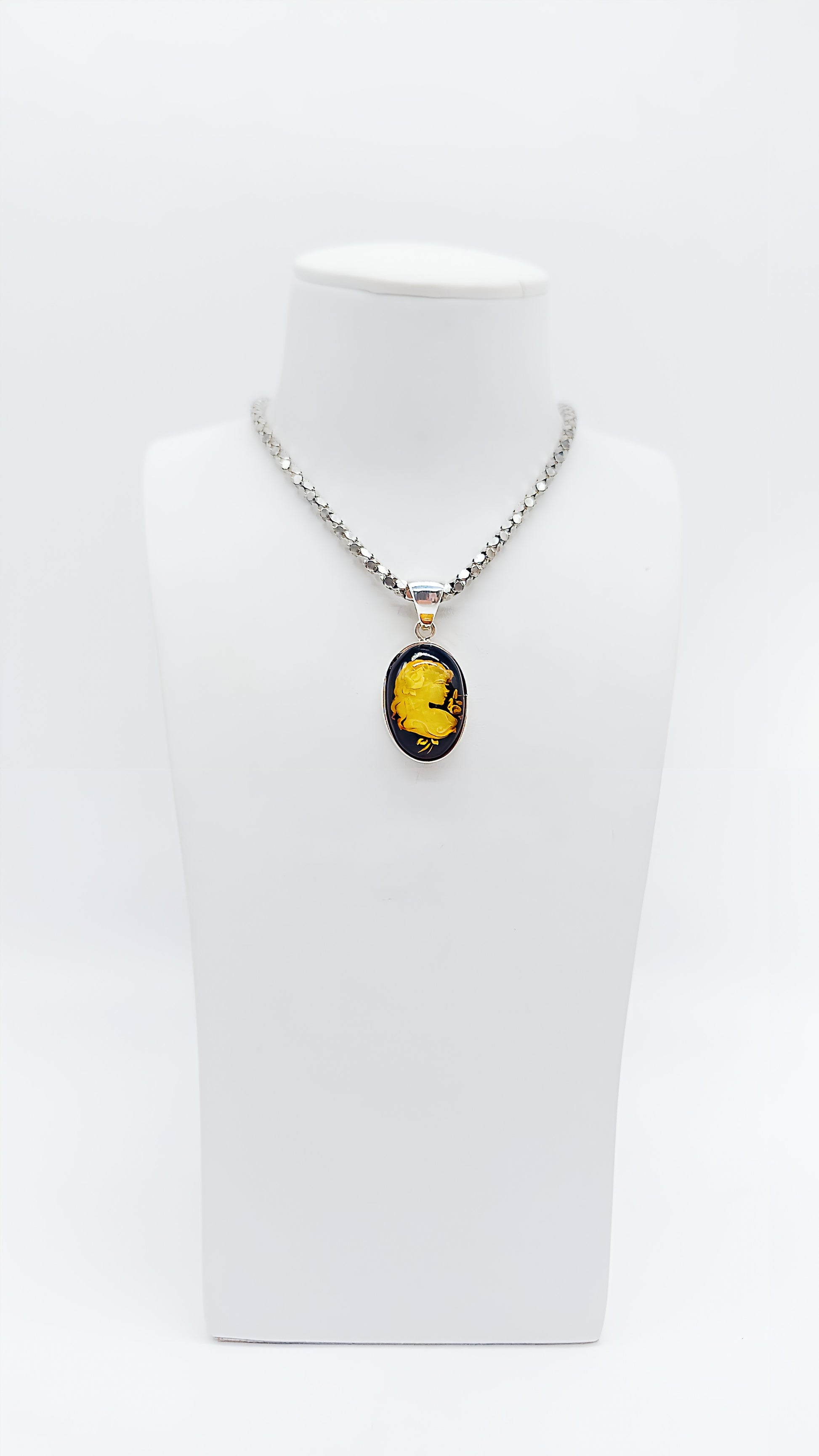 Dieser edle Anhänger aus 925er Sterlingsilber ist ein wahres Kunstwerk. Im Mittelpunkt steht das kunstvoll gestaltete Frauenprofil, das aus tiefschwarzem Bernstein herausgearbeitet wurde und dem Schmuckstück eine antike, klassische Eleganz verleiht. Die filigrane Verarbeitung und das Zusammenspiel aus Silber und Bernstein machen diesen Anhänger zu einem unverwechselbaren Schmuckstück, das zeitlos und dennoch modern wirkt. Ideal für Frauen, die eine Vorliebe für klassischen Stil und historische Designs haben. Dieser Anhänger ist das perfekte Geschenk für besondere Anlässe wie Jubiläen, Geburtstage oder als Ausdruck von Wertschätzung.