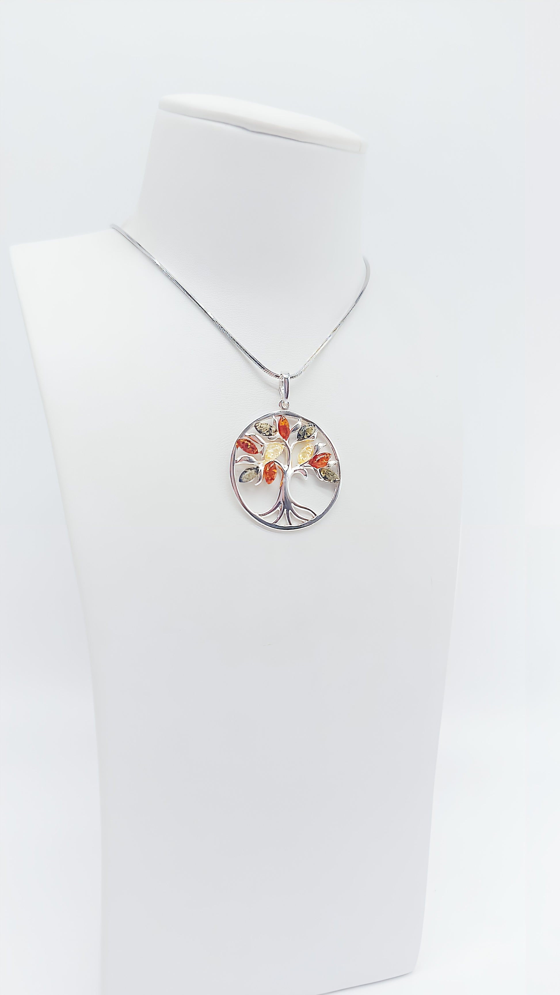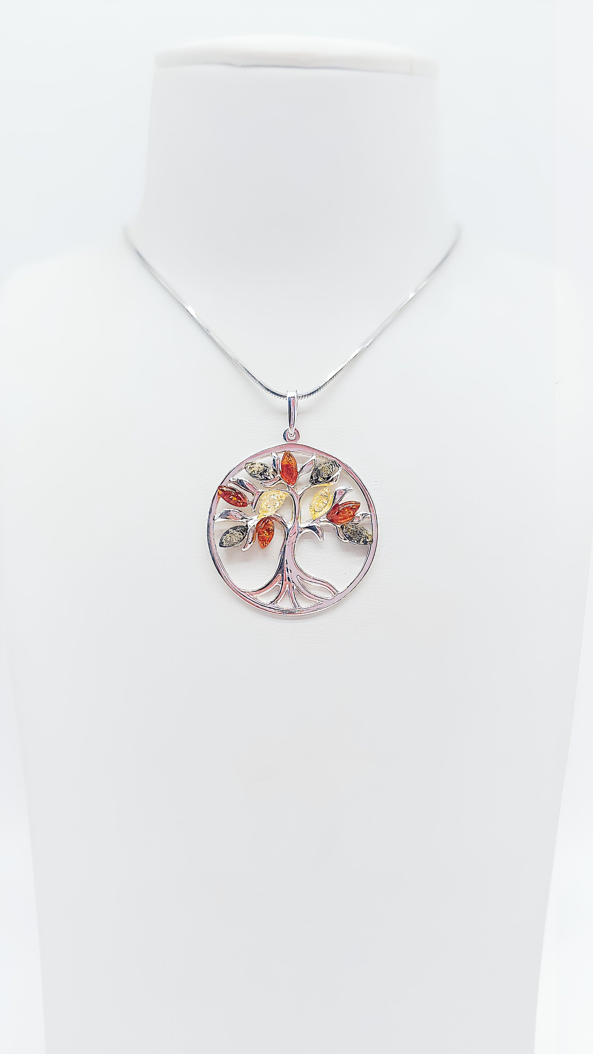 Lebensbaum-Anhänger: Silber und bunter Bernstein in Harmonie