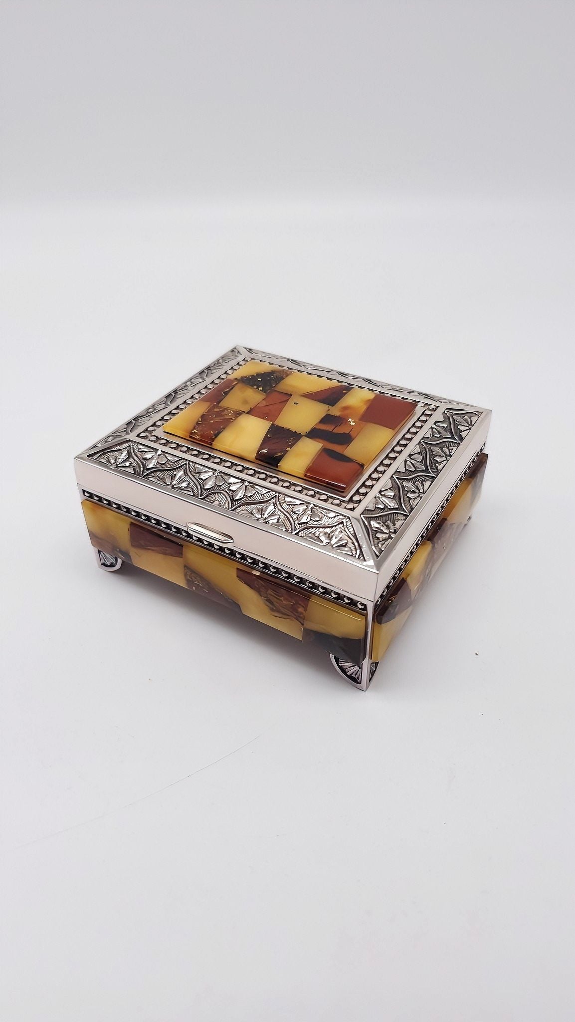 Dieses exquisite Schmuckkästchen vereint die natürliche Schönheit von echtem Bernstein mit kunstvoll gearbeiteten Silberverzierungen. Die warmen Bernsteintöne, angeordnet in einem Schachbrettmuster, harmonieren perfekt mit den filigranen Details der Box. Im Inneren bietet das Kästchen großzügigen Platz für Ihre wertvollsten Schmuckstücke und bewahrt sie sicher und stilvoll auf. Ideal als Geschenk oder als Highlight auf Ihrem Schminktisch – dieses handgefertigte Schmuckkästchen ist ein Ausdruck von Luxus und Eleganz.