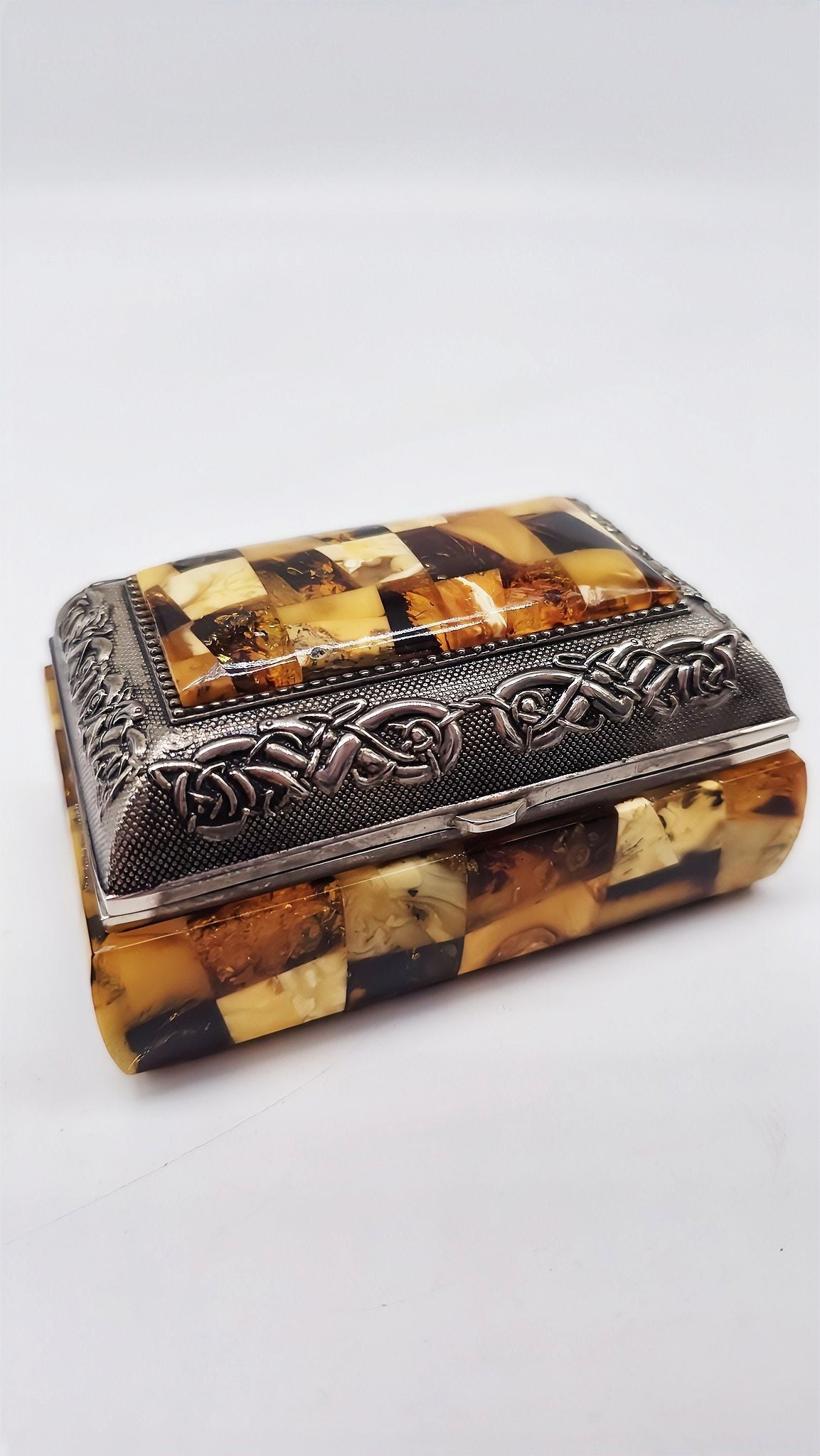 Dieses kompakte Schmuckkästchen aus echtem Bernstein bietet zwei separate Fächer zur stilvollen Aufbewahrung von Schmuckstücken wie Ohrringen, Ringen oder Anhängern. Die Kombination aus warmen Bernsteintönen im Schachbrettmuster und kunstvoll gearbeiteten Silberdetails verleiht der Box eine elegante und luxuriöse Ausstrahlung. Ideal für Reisen oder den Schminktisch, ist dieses handgefertigte Schmuckkästchen nicht nur praktisch, sondern auch ein dekorativer Hingucker. Perfekt als Geschenk für Liebhaber von edlem Design und Handwerkskunst.