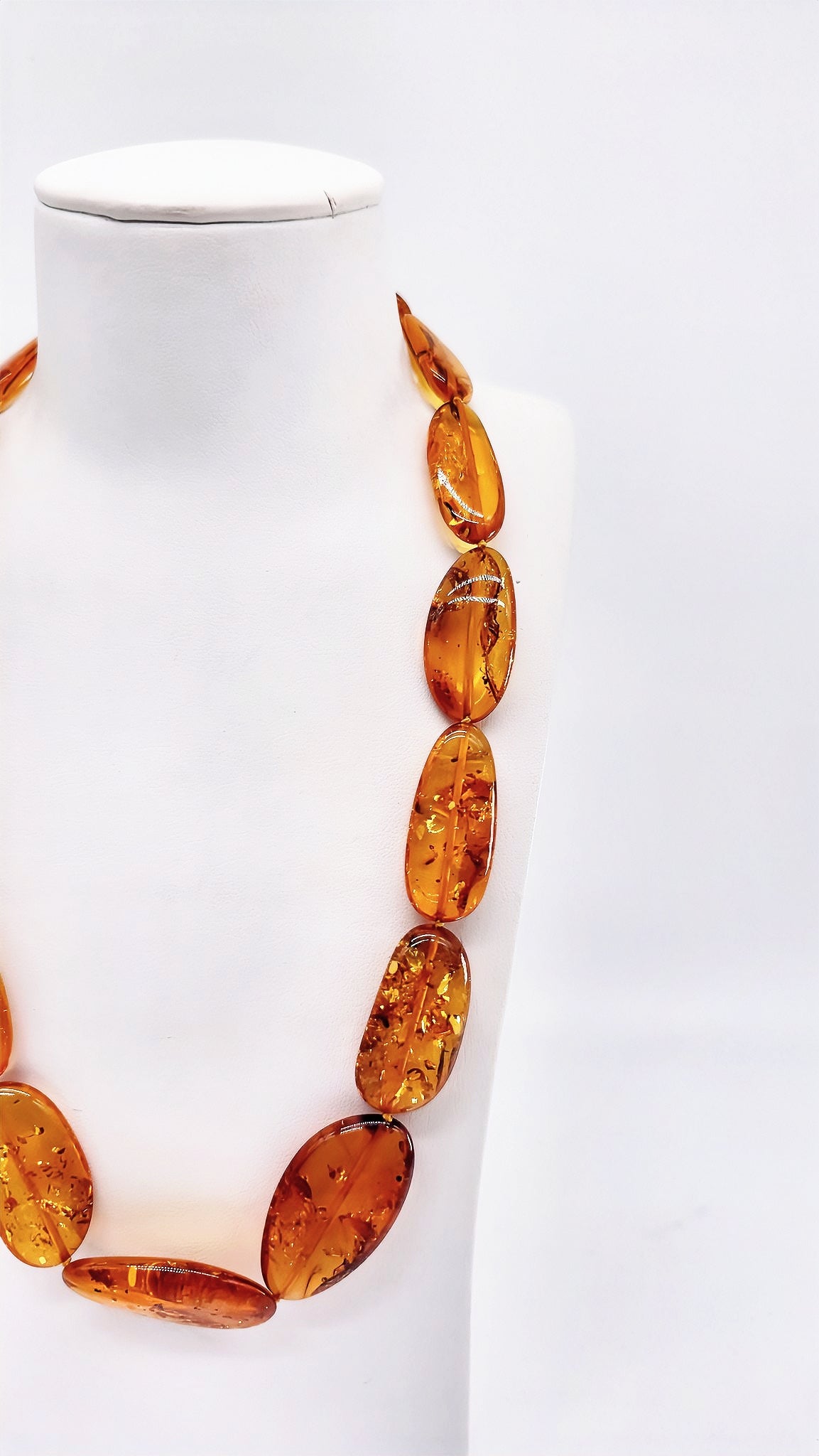 Diese handgefertigte Bernstein-Halskette ist ein wahres Meisterwerk der Natur. Die großzügig geschliffenen Bernsteinperlen in warmem Orange leuchten in verschiedenen Nuancen und verleihen jedem Outfit einen Hauch von Eleganz und Natürlichkeit. Jeder Stein wurde sorgfältig poliert, um seine einzigartigen Einschlüsse und Muster hervorzuheben.