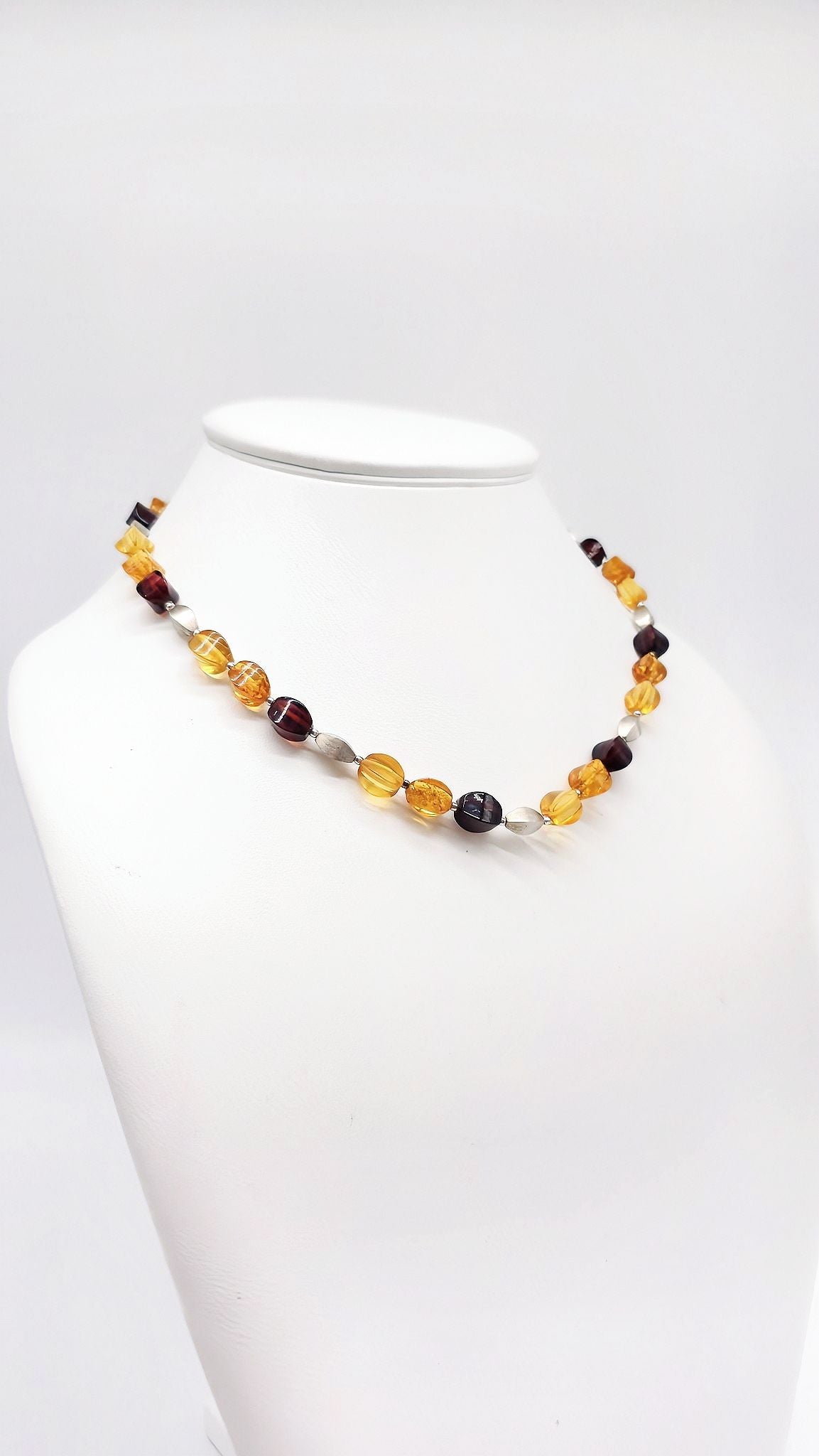 Diese elegante Bernsteinkette kombiniert hochwertige Naturmaterialien mit edlem Design. Sie besteht aus echtem baltischem Bernstein in warmen Tönen von Orange, Rot und Gelb, ergänzt durch 925er Sterlingsilber-Elemente. Der praktische Magnetverschluss sorgt für einfaches An- und Ablegen. Mit einer Länge von 45 cm liegt die Kette perfekt am Hals und eignet sich für den Alltag sowie besondere Anlässe. Diese Halskette ist ein stilvolles Accessoire für Frauen, die natürlichen Schmuck lieben. Auch als Geschenk für Geburtstage, Jubiläen oder Weihnachten ist sie eine ausgezeichnete Wahl.