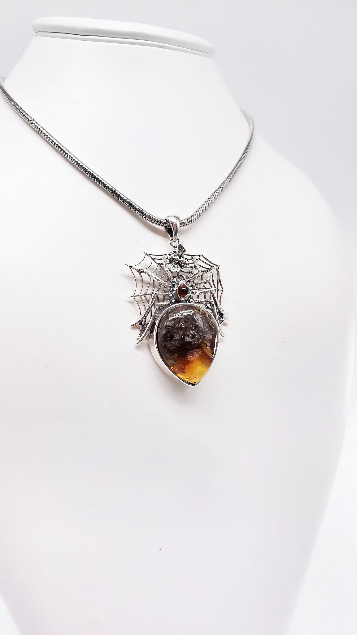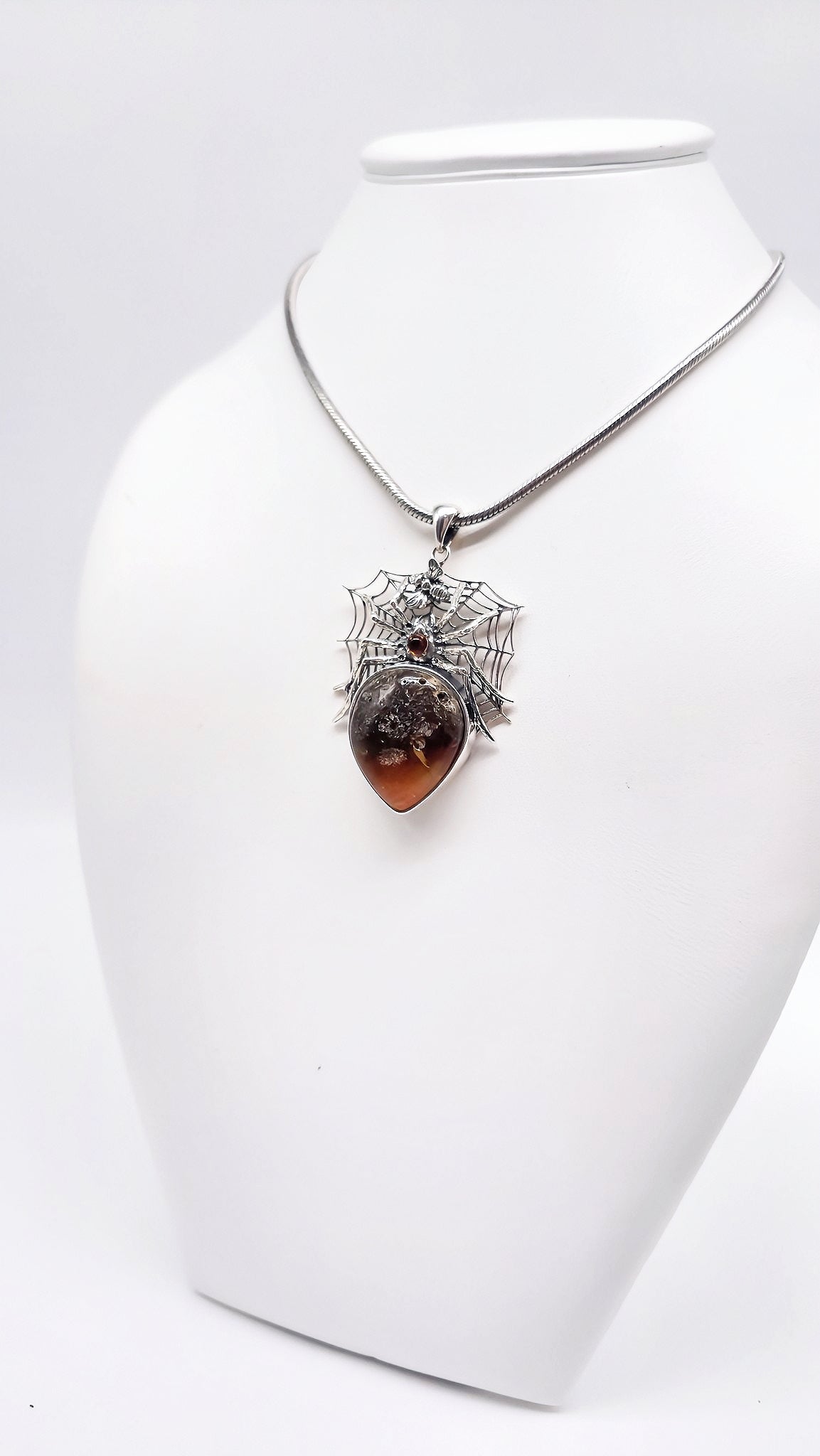 Dieser einzigartige Spinnen-Anhänger aus 925er Sterlingsilber ist ein echtes Statement-Piece. Das filigrane Spinnennetz-Design umrahmt einen faszinierenden, echten Bernstein mit natürlichen Einschlüssen. Ein zusätzlicher kleiner Granatstein verleiht dem Schmuckstück eine geheimnisvolle Note. Mit einer Länge von 7 cm und einer Breite von 4 cm ist dieser Anhänger ein wahrer Blickfang. Perfekt für Liebhaber außergewöhnlichen Schmucks und als besonderes Geschenk.