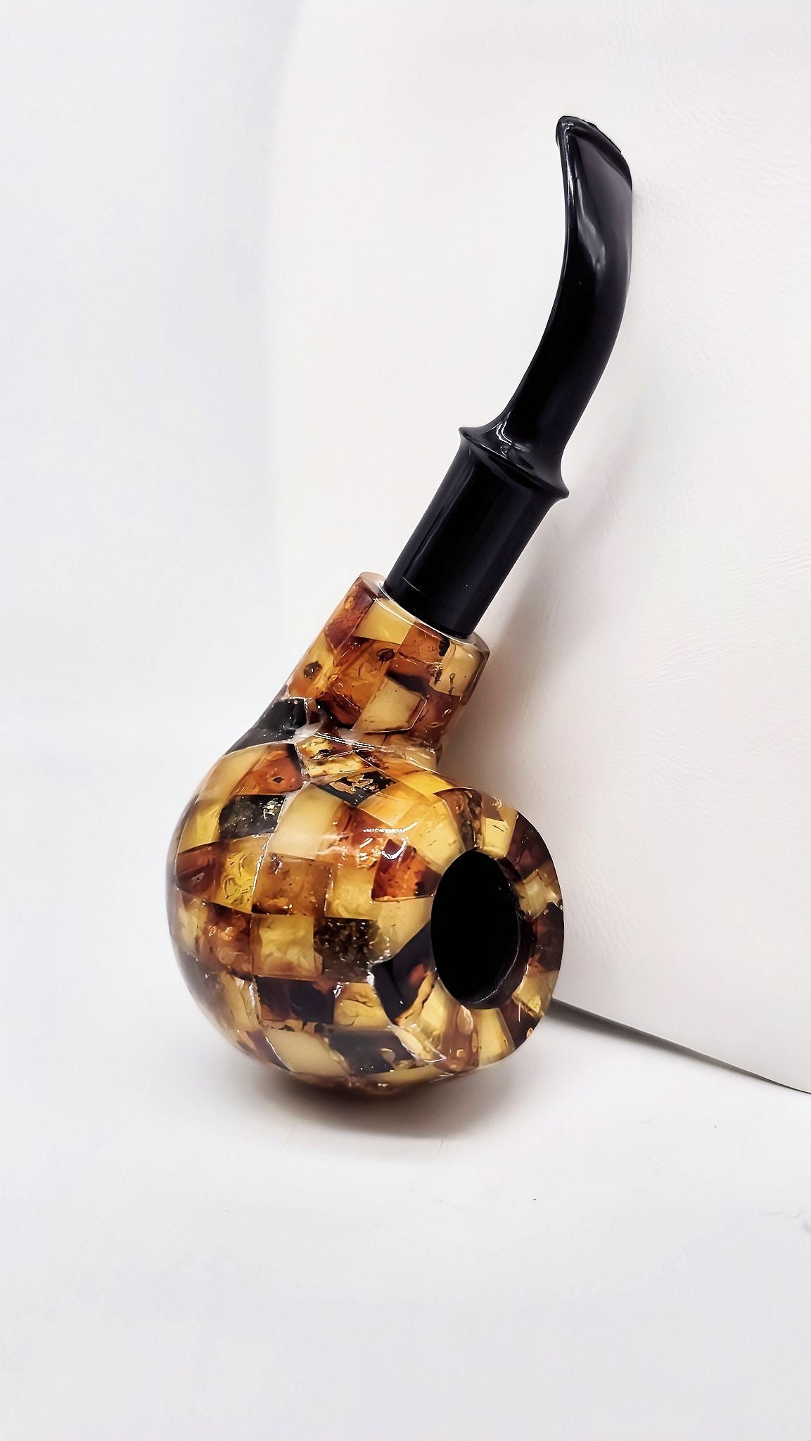 Mit einer Länge von 13,5 cm liegt die Pfeife angenehm in der Hand, während das edle Bernstein-Mosaik eine stilvolle Optik verleiht.