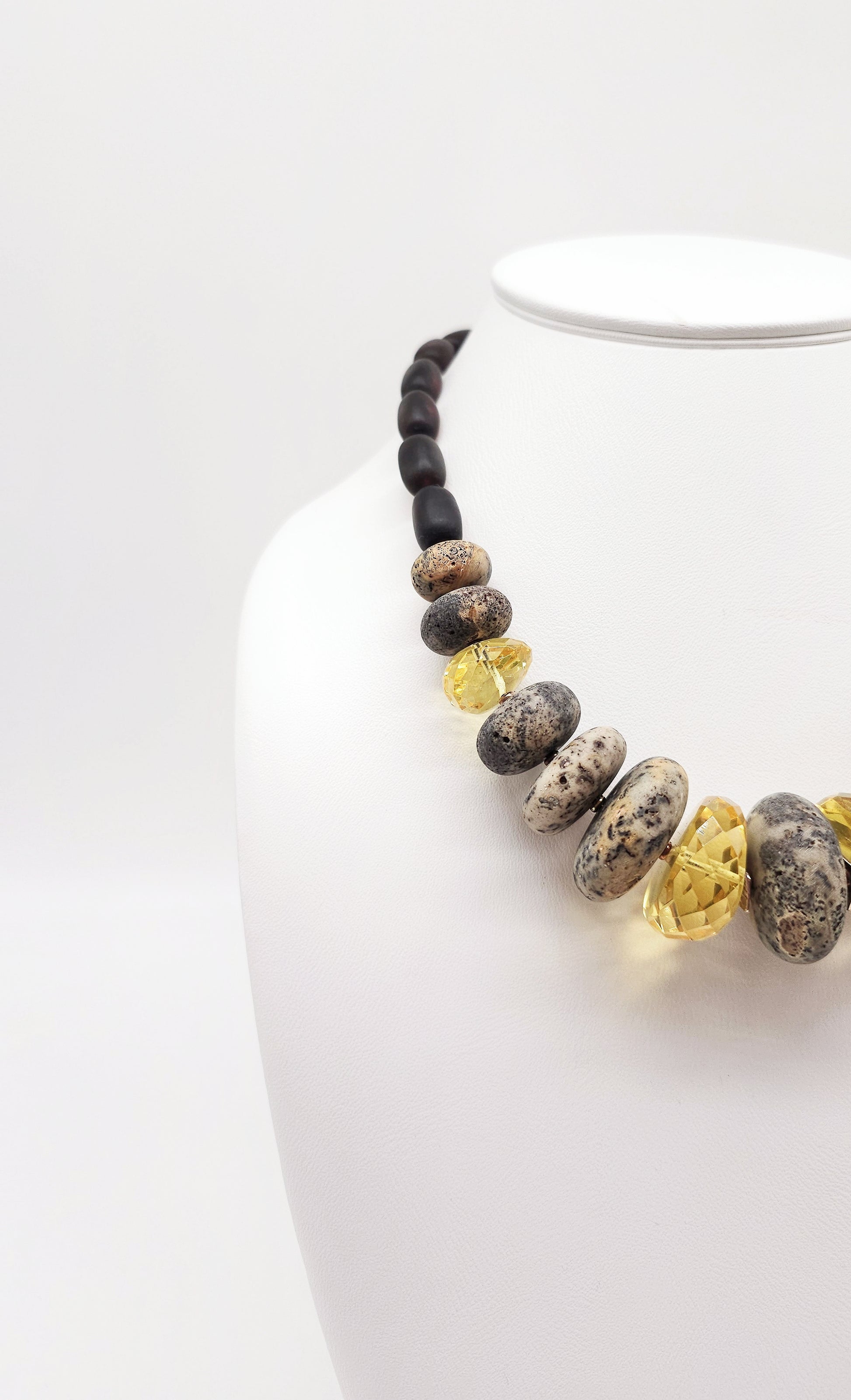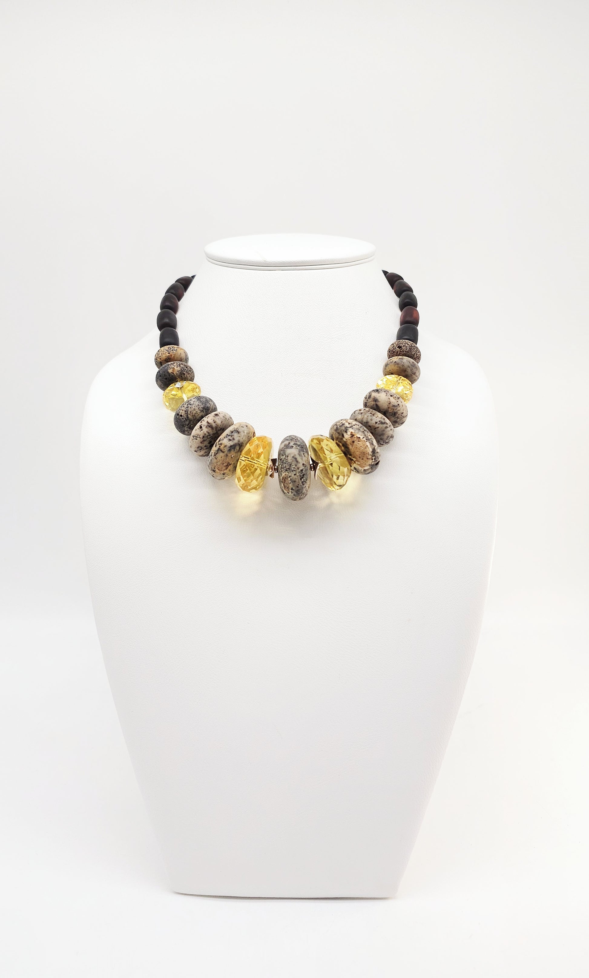 Dieses einzigartige Collier ist ein Ausdruck natürlicher Eleganz und kraftvoller Ästhetik. Eine exklusive Kombination aus facettierten, honigfarbenen Bernsteinen und markanten Natursteinen verleiht der Kette ihren unverwechselbaren Look. Die Materialien harmonieren perfekt in ihrer Farbgebung – von tiefem Braun über Beige bis zu leuchtendem Gelb. Das massive Erscheinungsbild mit einem Wechselspiel aus glatten und strukturierten Oberflächen sorgt für einen beeindruckenden Auftritt.