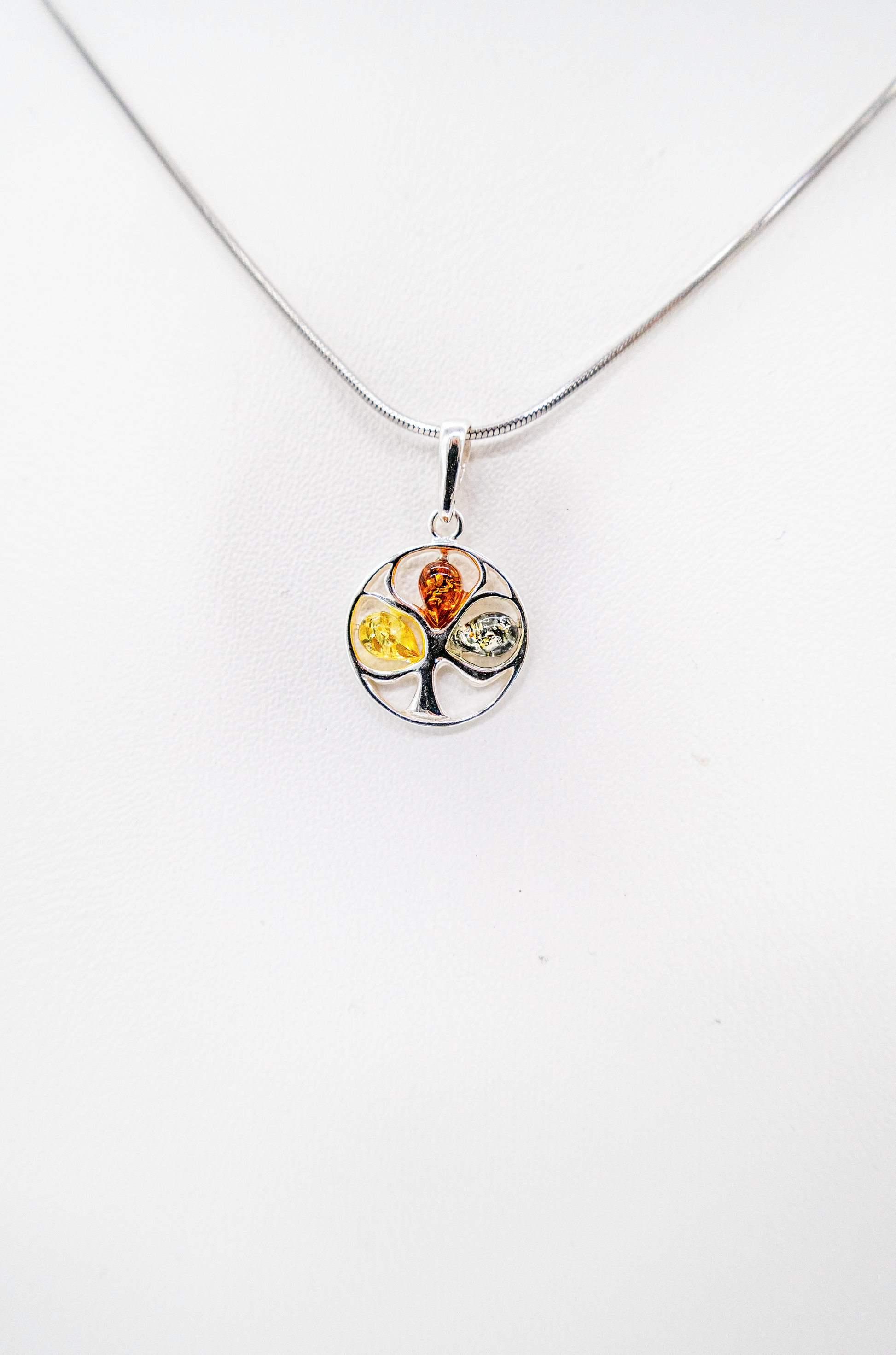 Ausdrucksstarker Lebensbaum-Anhänger mit echtem Bernstein in drei Farben – Symbol für Stärke & Harmonie