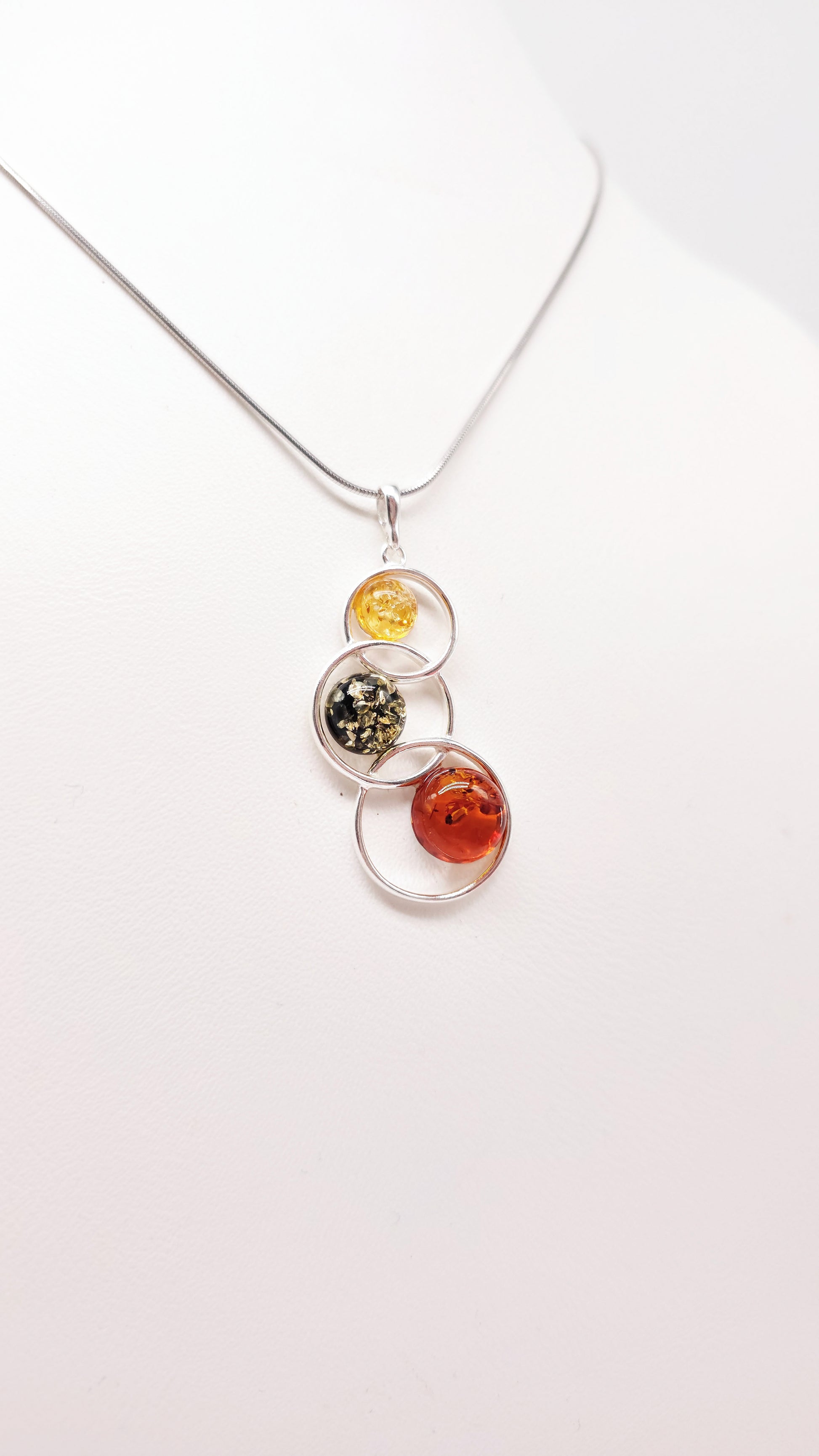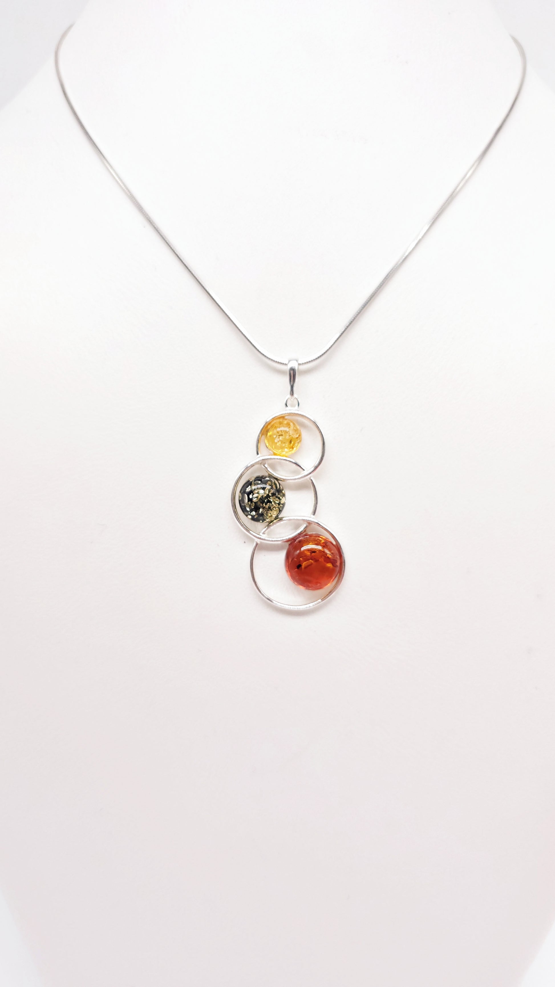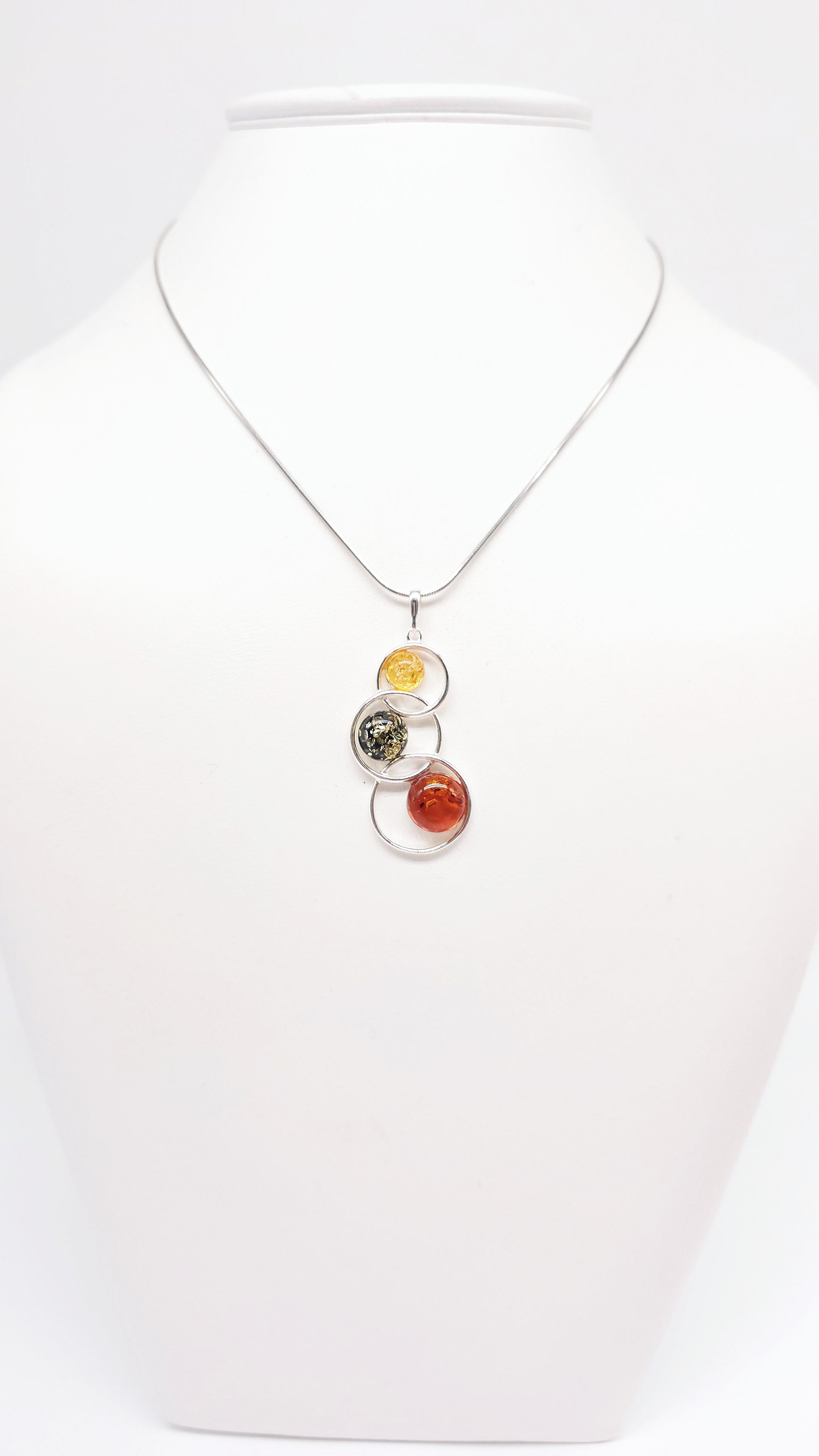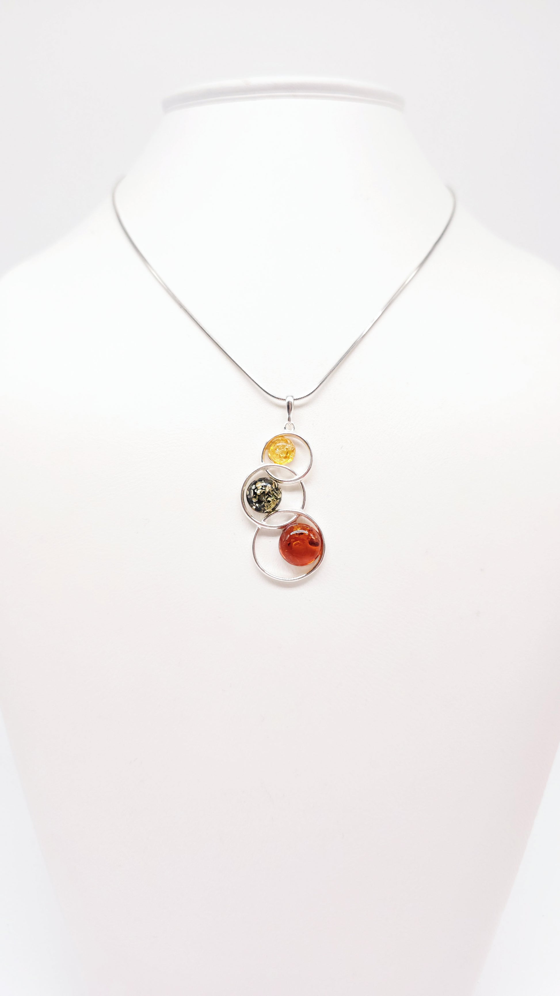 925er Sterlingsilber, poliert, mit drei Kugeln aus echtem Naturbernstein (gelb, grün, cognac)