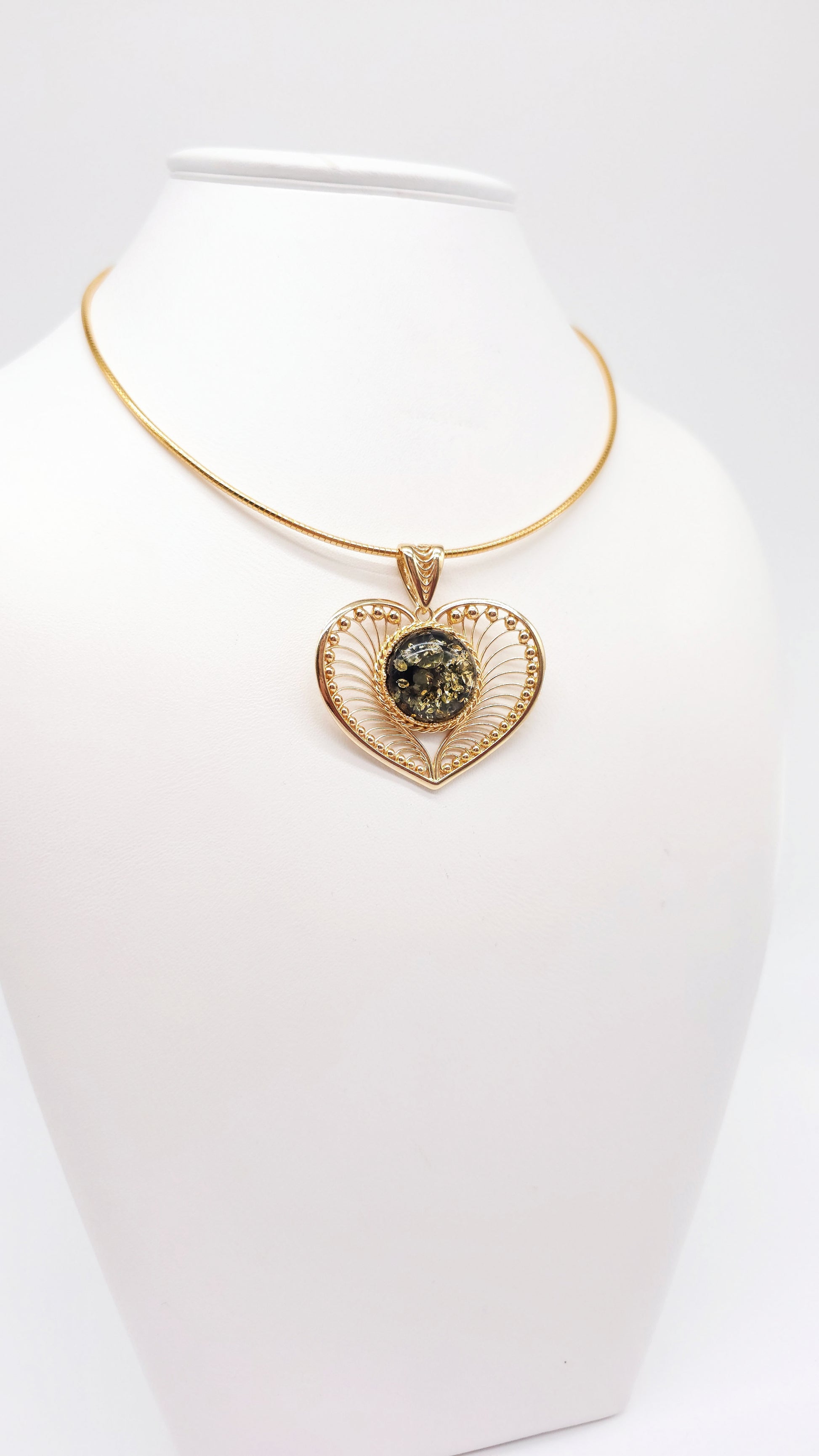 Dieser handgefertigte Herzanhänger aus vergoldetem 925er Sterlingsilber mit einem eindrucksvollen grünen Bernstein ist ein echtes Schmuckhighlight für stilbewusste Damen. Das filigrane Herzdesign symbolisiert Liebe, Wärme und Verbundenheit – perfekt als Geschenk für einen besonderen Menschen oder als Ausdruck der Selbstliebe.