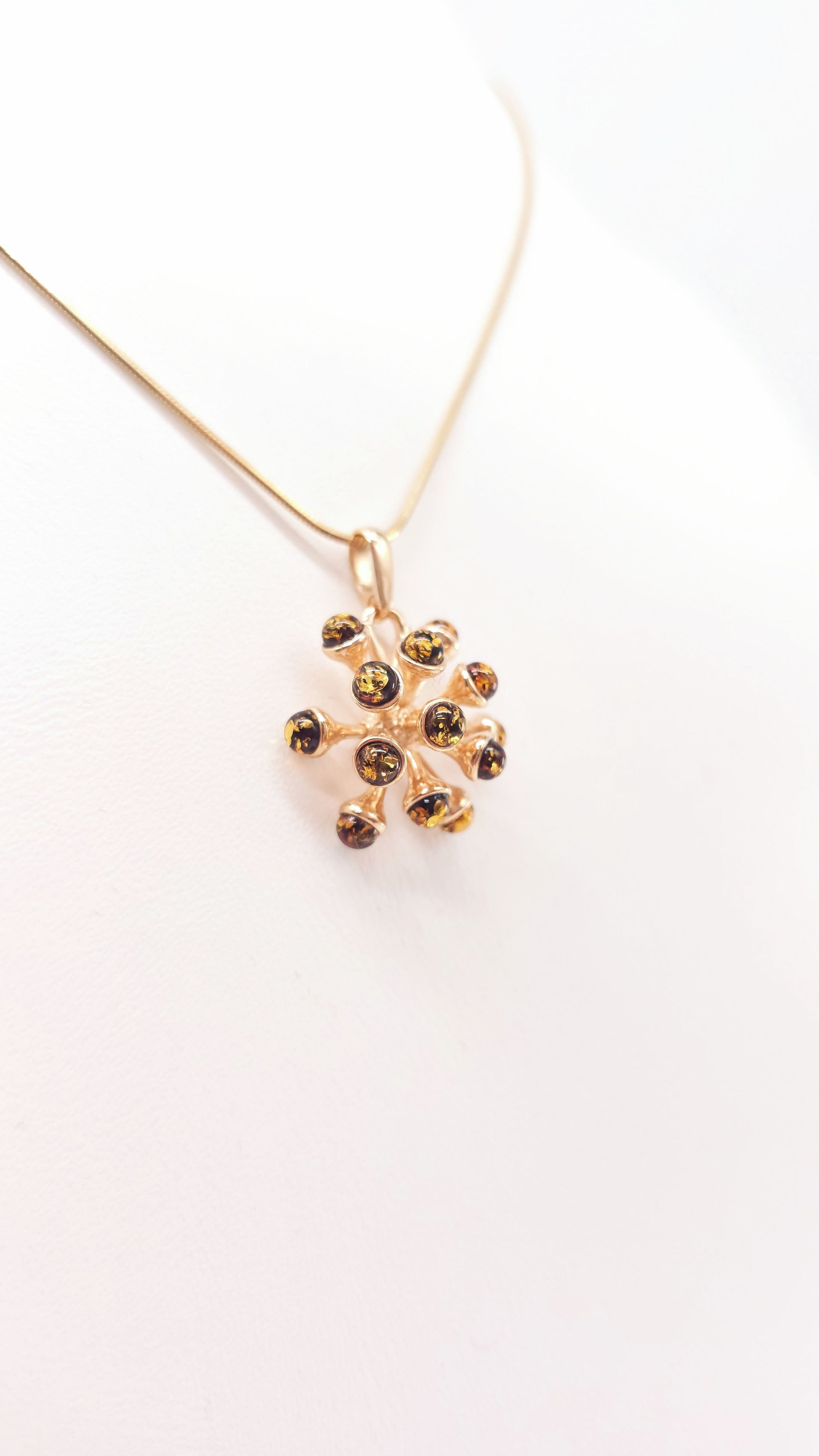 Dieser edle Bernsteinanhänger begeistert durch sein außergewöhnliches Design – ein harmonisches Zusammenspiel aus elf kleinen Bernstein-Kugeln in einem modernen, geometrisch-blumigen Arrangement. Die intensiv schimmernden grün-goldenen Einschlüsse sorgen für ein lebendiges Farbspiel, das den Anhänger zu einem echten Blickfang macht.