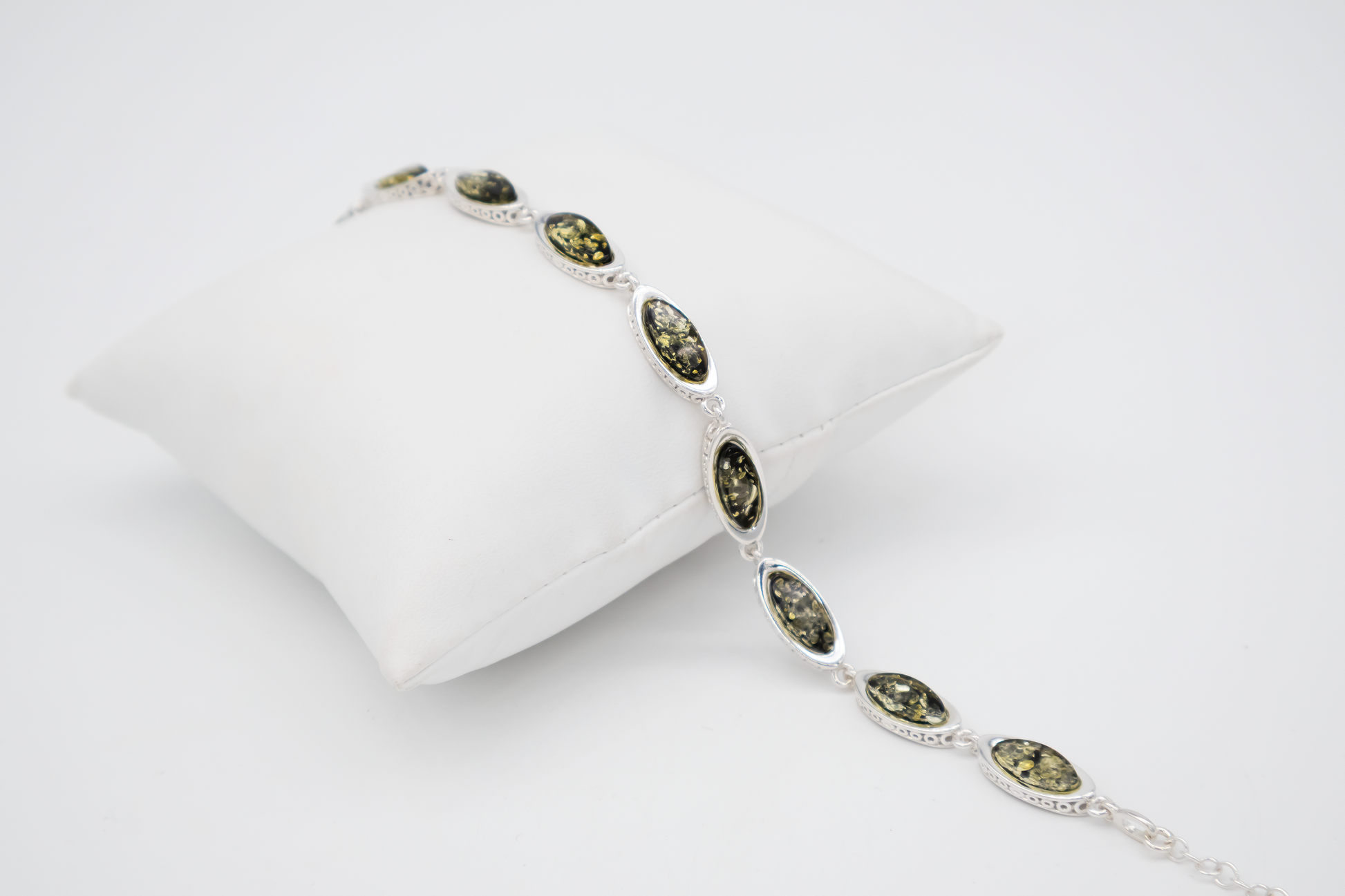 Dieses elegante Silberarmband mit grünem Bernstein vereint zeitlose Eleganz und Handwerkskunst. Gefertigt aus 925er Sterlingsilber und veredelt mit sorgfältig eingefassten, ovalen Bernsteinsteinen, wird es zu einem einzigartigen Blickfang. Besonders detailreich: die seitliche Verzierung mit feiner Gravur, die dem Armband eine edle Note verleiht.