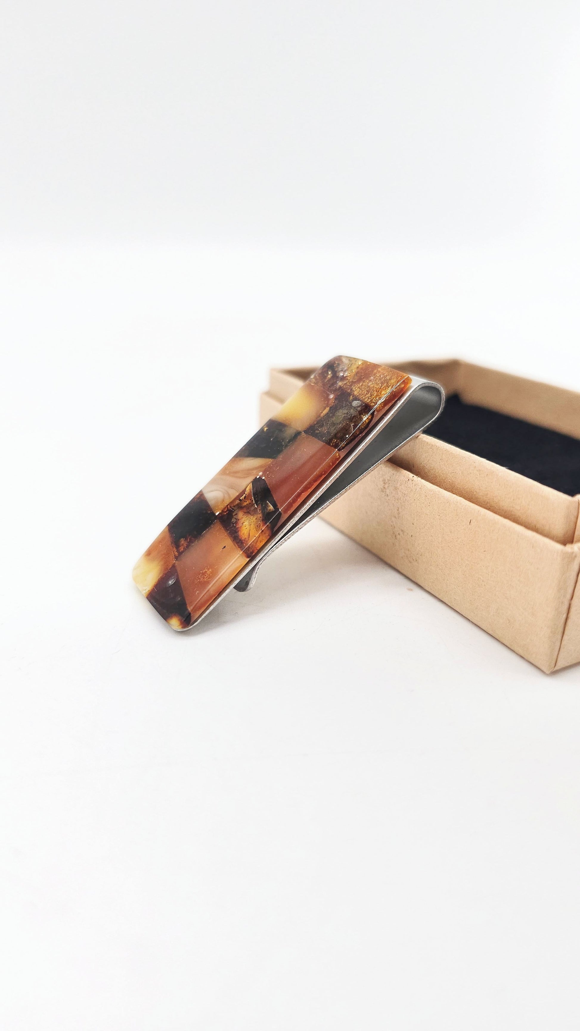Diese elegante Geldklammer mit echtem Naturbernstein ist das ideale Accessoire für stilbewusste Männer. Sie vereint klassische Funktionalität mit hochwertigem Design. Der handverarbeitete Bernstein in Mosaikoptik macht jede Klammer zu einem echten Einzelstück – kein Muster gleicht dem anderen.