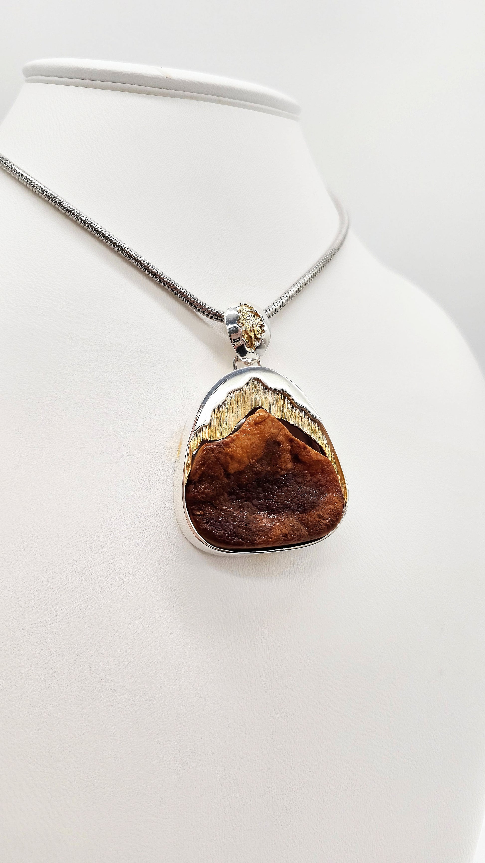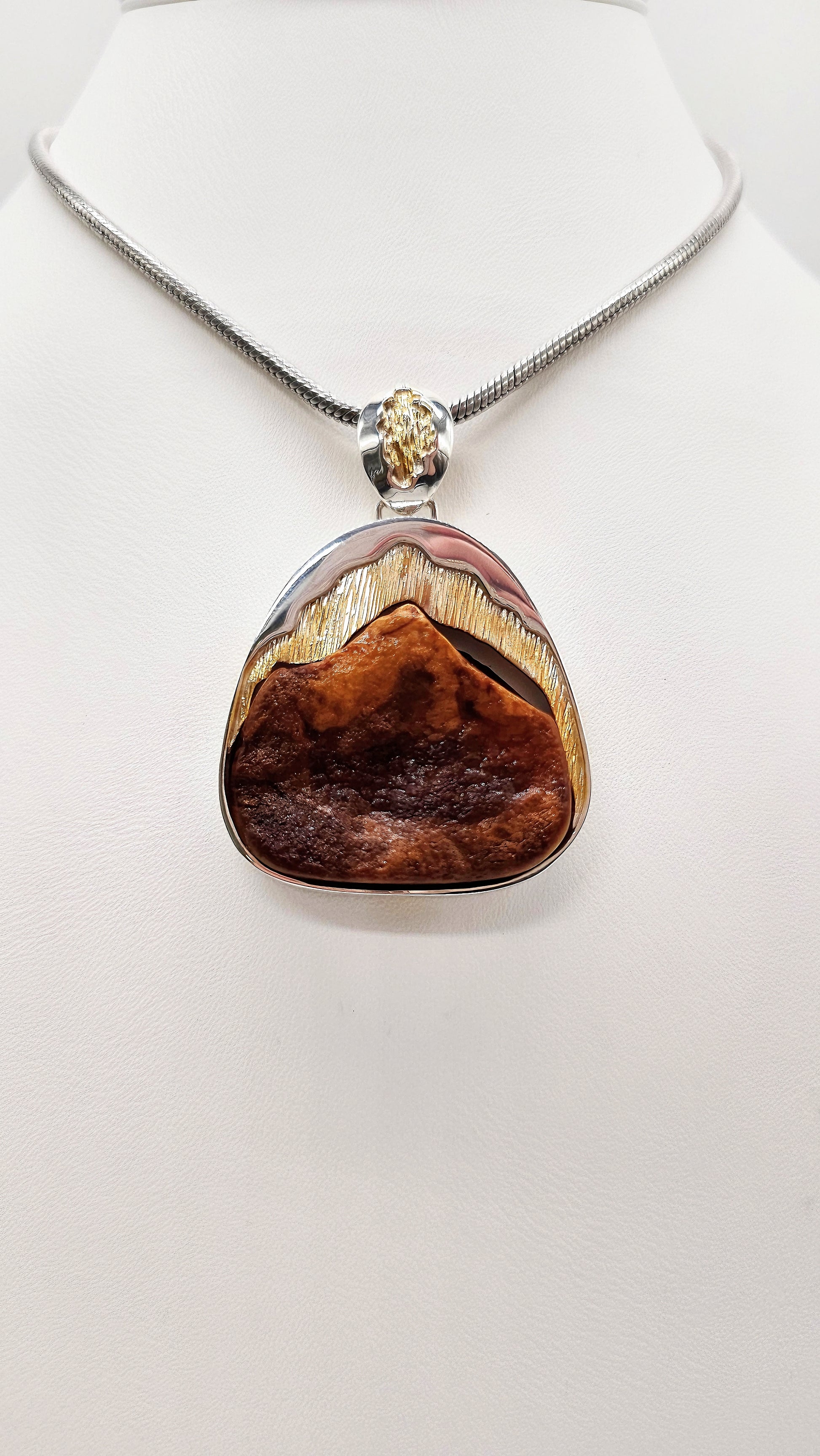Dieser außergewöhnliche Anhänger vereint natürliche Ursprünglichkeit mit modernem Design. Der kräftig strukturierte Bernstein in sattem Braunton wirkt fast wie ein Stück Gebirge – eingefasst in poliertes 925er Silber mit vergoldeten Akzenten. Die leicht geschwungene Form erinnert an eine Berglandschaft und symbolisiert innere Stärke, Erdung und Beständigkeit. Ein Schmuckstück für Menschen, die ihre Wurzeln kennen und ihre Individualität mit Stolz zeigen.