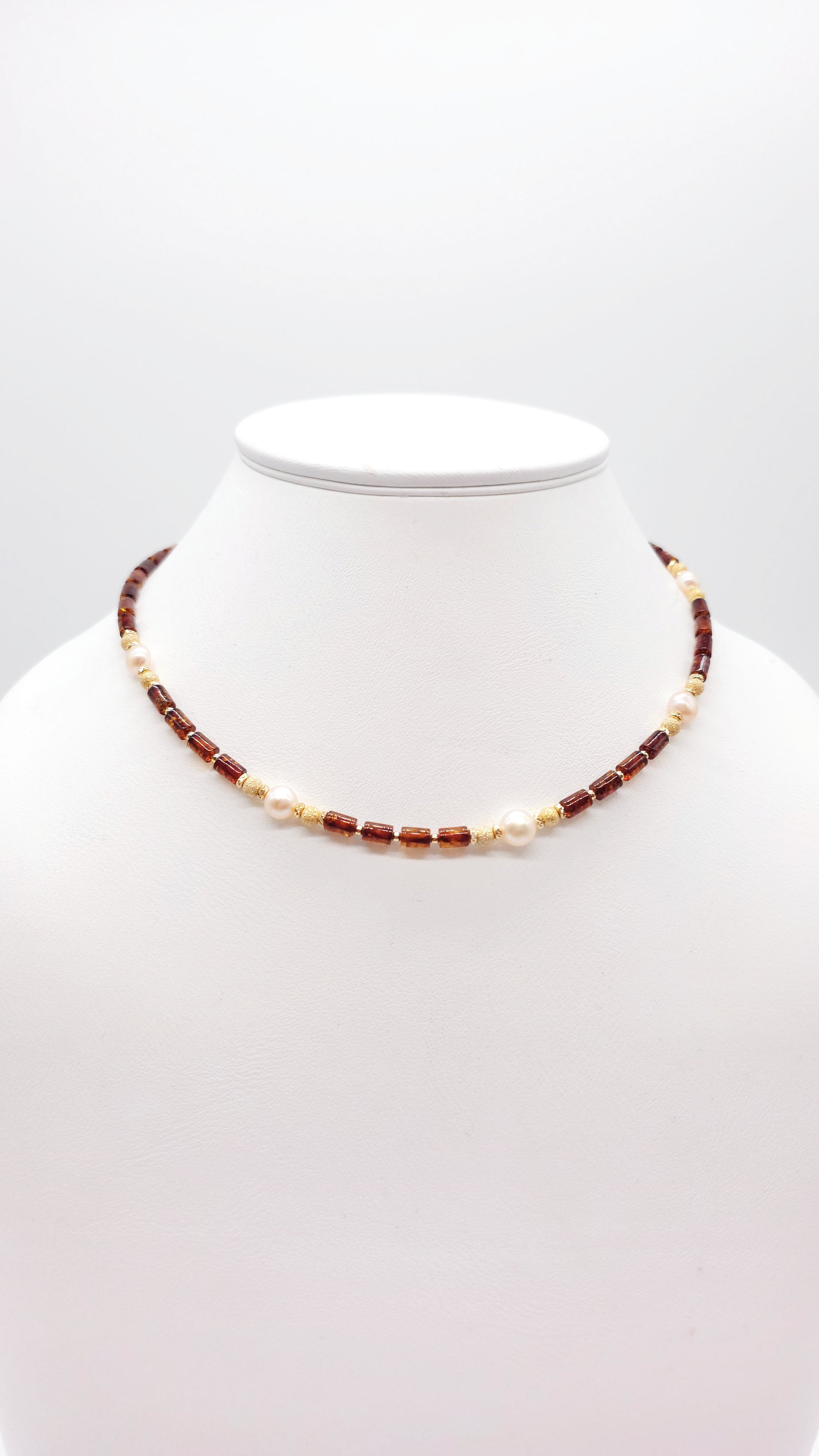 Dieses filigrane Collier vereint edlen Naturbernstein mit zarten Süßwasserperlen und vergoldeten Akzenten aus 925er Sterlingsilber. Die elegante Farbkombination und das ausgewogene Design machen dieses handgefertigte Unikat zu einem stilvollen Begleiter für besondere Anlässe oder den Alltag. Die Kette misst 43 cm und lässt sich durch eine 4 cm Verlängerung individuell anpassen. Der hochwertige Karabinerverschluss garantiert sicheren Halt. Ein exklusives Schmuckstück mit natürlicher Ausstrahlung – ideal auch als Geschenk.