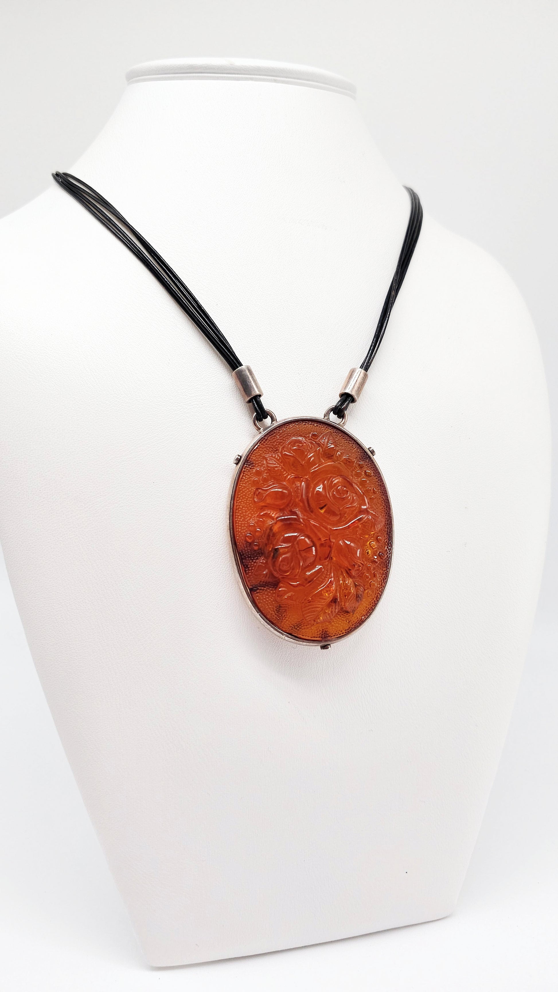 3D Rosen im Bernstein – Anhänger mit Lederkette