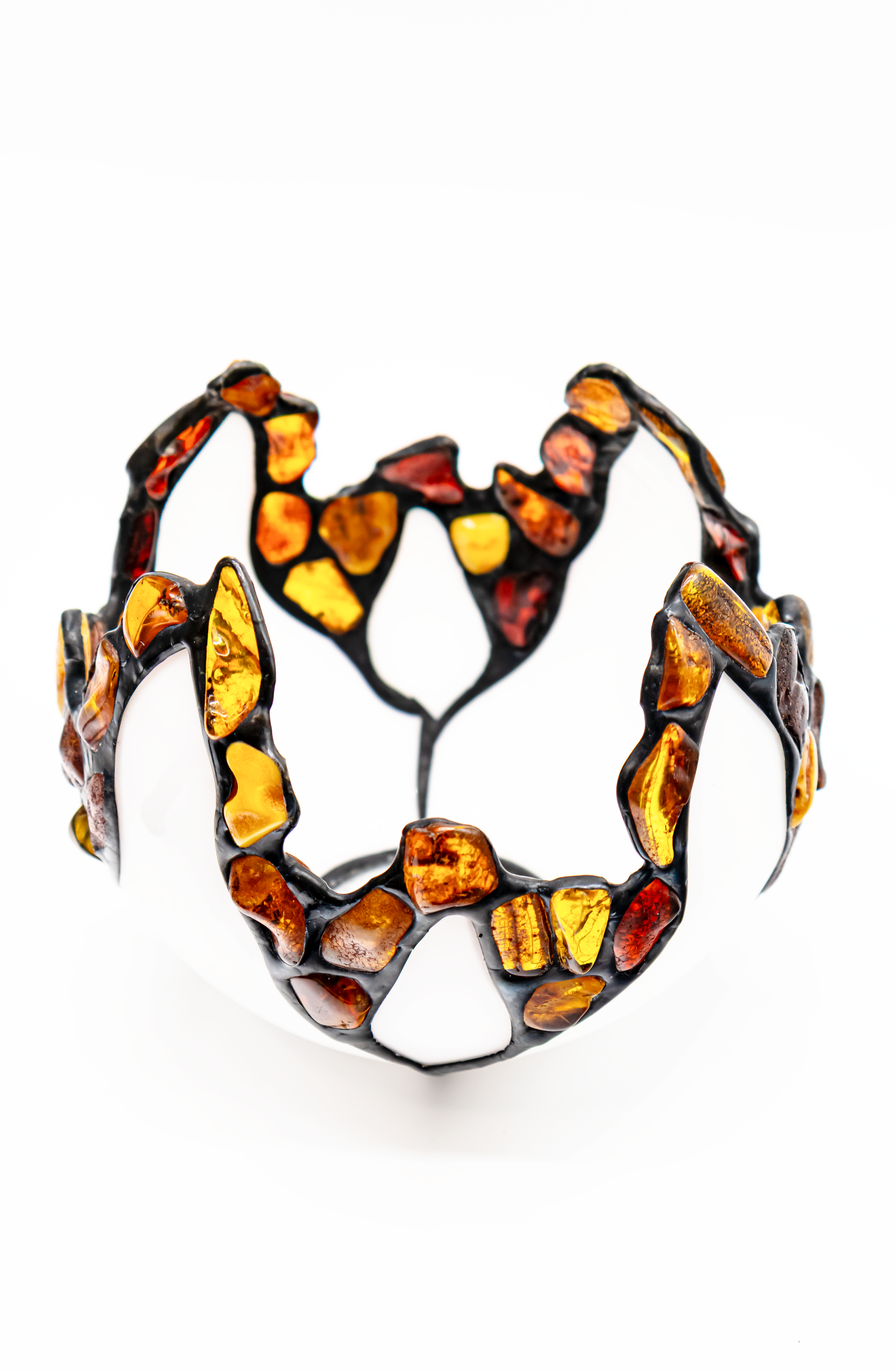 Handgefertigtes Unikat aus Glas, Metall und Bernstein – jedes Stück ein Kunstwerk, das durch das Lichtspiel der Bernsteine eine warme, einladende Atmosphäre schafft.