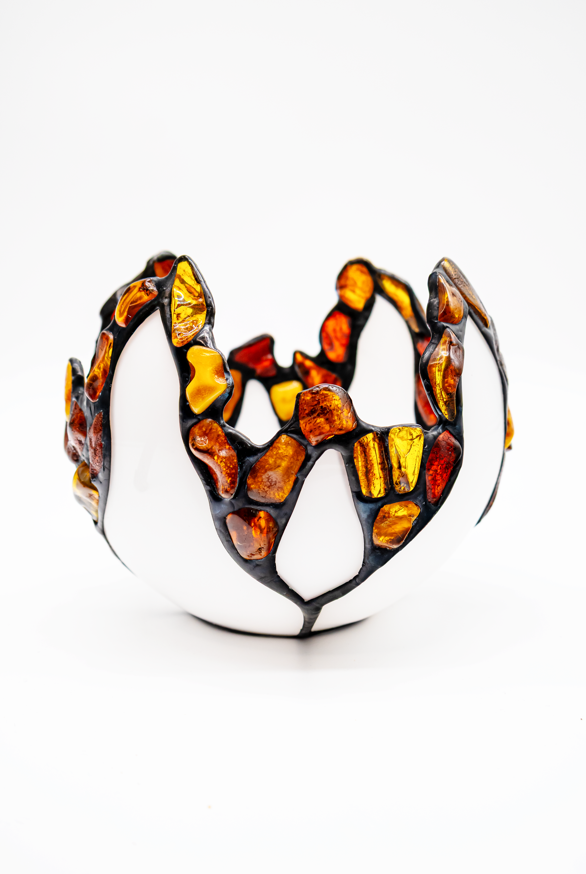 Dieses außergewöhnliche Windlicht vereint Glas, Metall und echten Bernstein zu einem faszinierenden Kunstobjekt. In kunstvoller Handarbeit gefertigt, fangen die bernsteinfarbenen Elemente das Licht ein und erzeugen ein warmes, lebendiges Schimmern – perfekt für gemütliche Abende oder als stilvolle Dekoration.