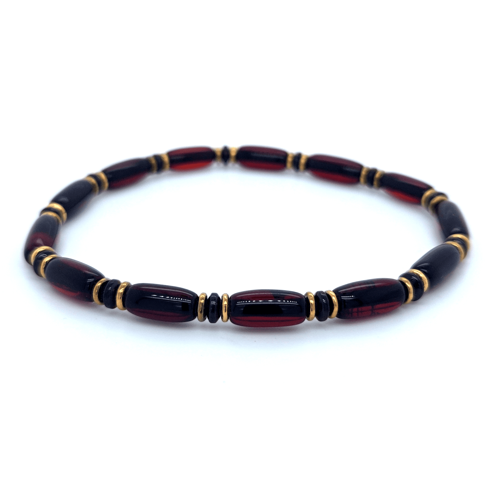 Die länglichen Bernsteinperlen in tiefem Cognac-Rot verleihen dem Armband eine besonders hochwertige und moderne Ausstrahlung. Durch die elastische Verarbeitung lässt sich das Armband bequem an- und ablegen und passt sich angenehm dem Handgelenk an. Es eignet sich ideal für einen Handgelenkumfang von ca. 16 bis 20 cm.