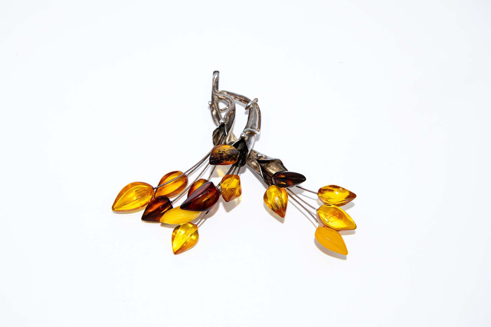 Handgefertigte Brosche mit unterschiedlich farbigen Bernsteinen, die wie zarte Blätter wirken – jedes Stück ein Unikat.