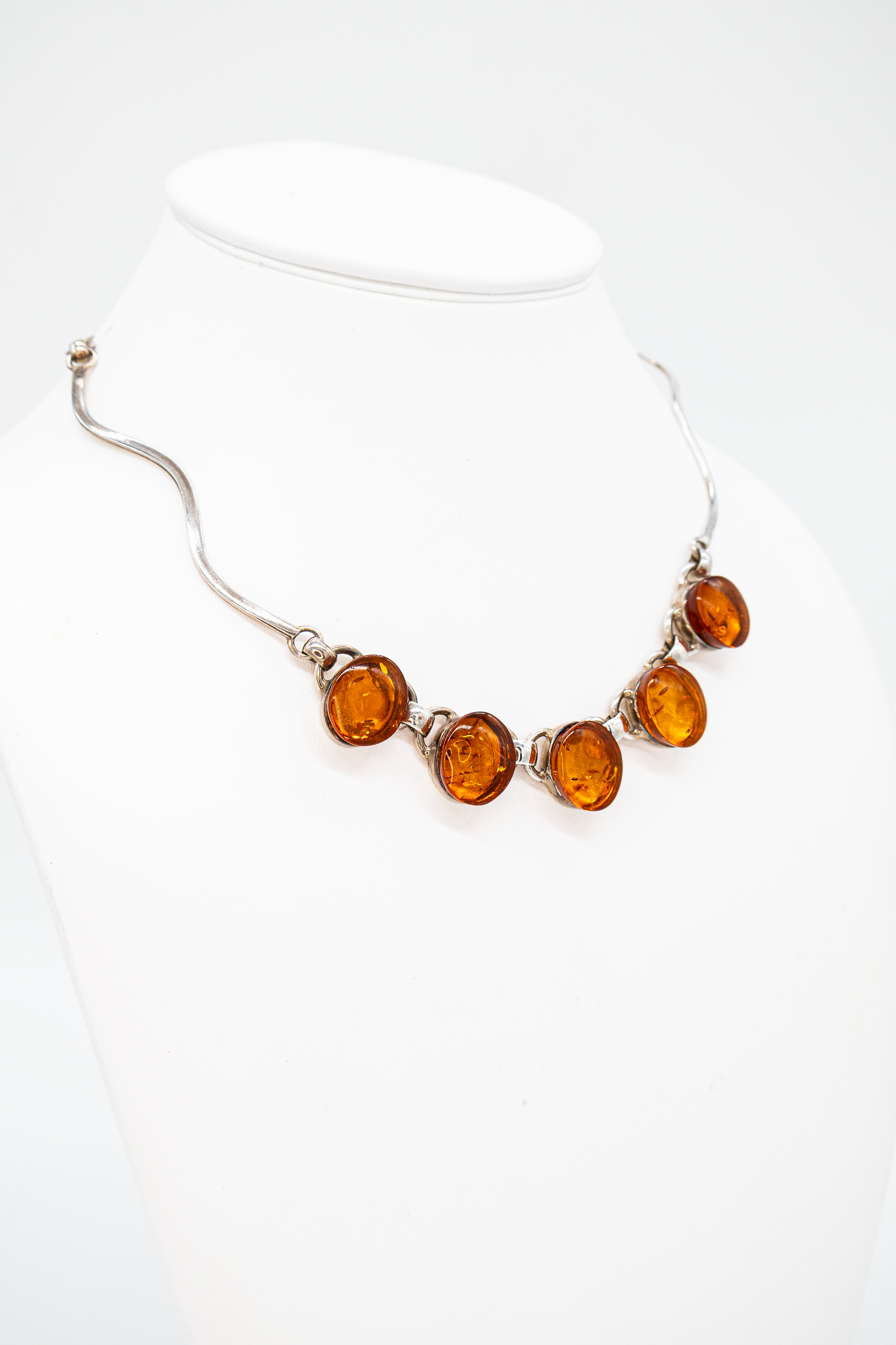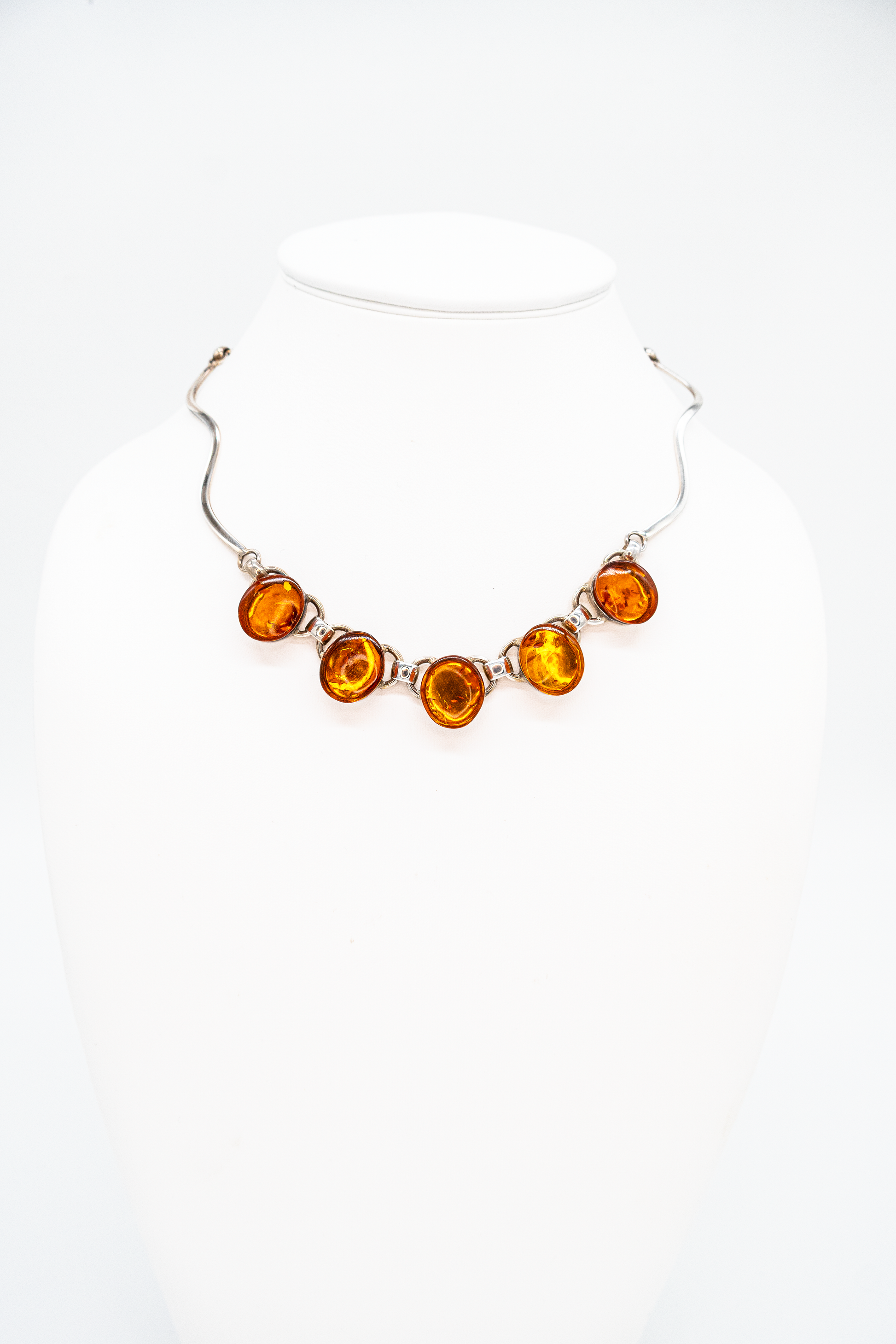 Handgefertigtes Unikat mit fünf polierten Bernsteinen in Silberfassung – ein Collier, das Eleganz und Natur perfekt verbindet.