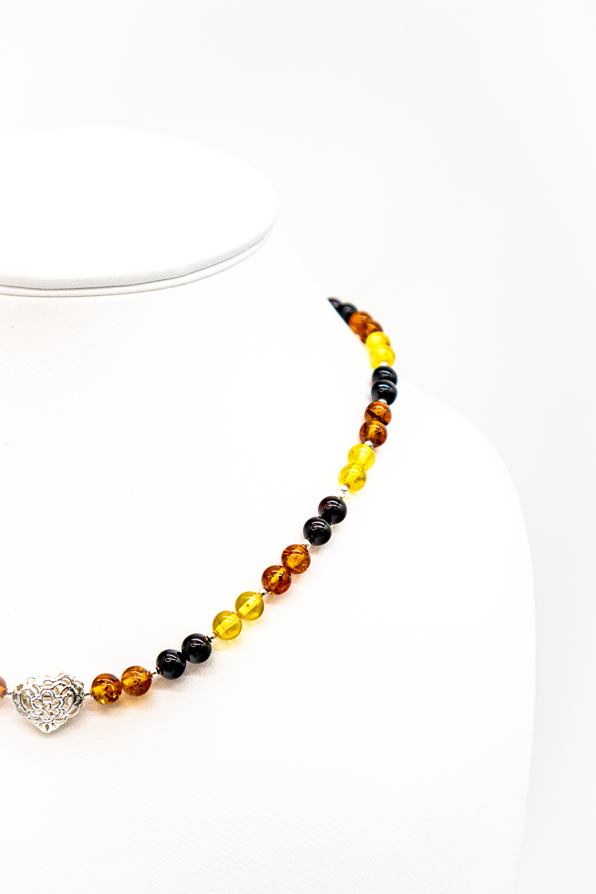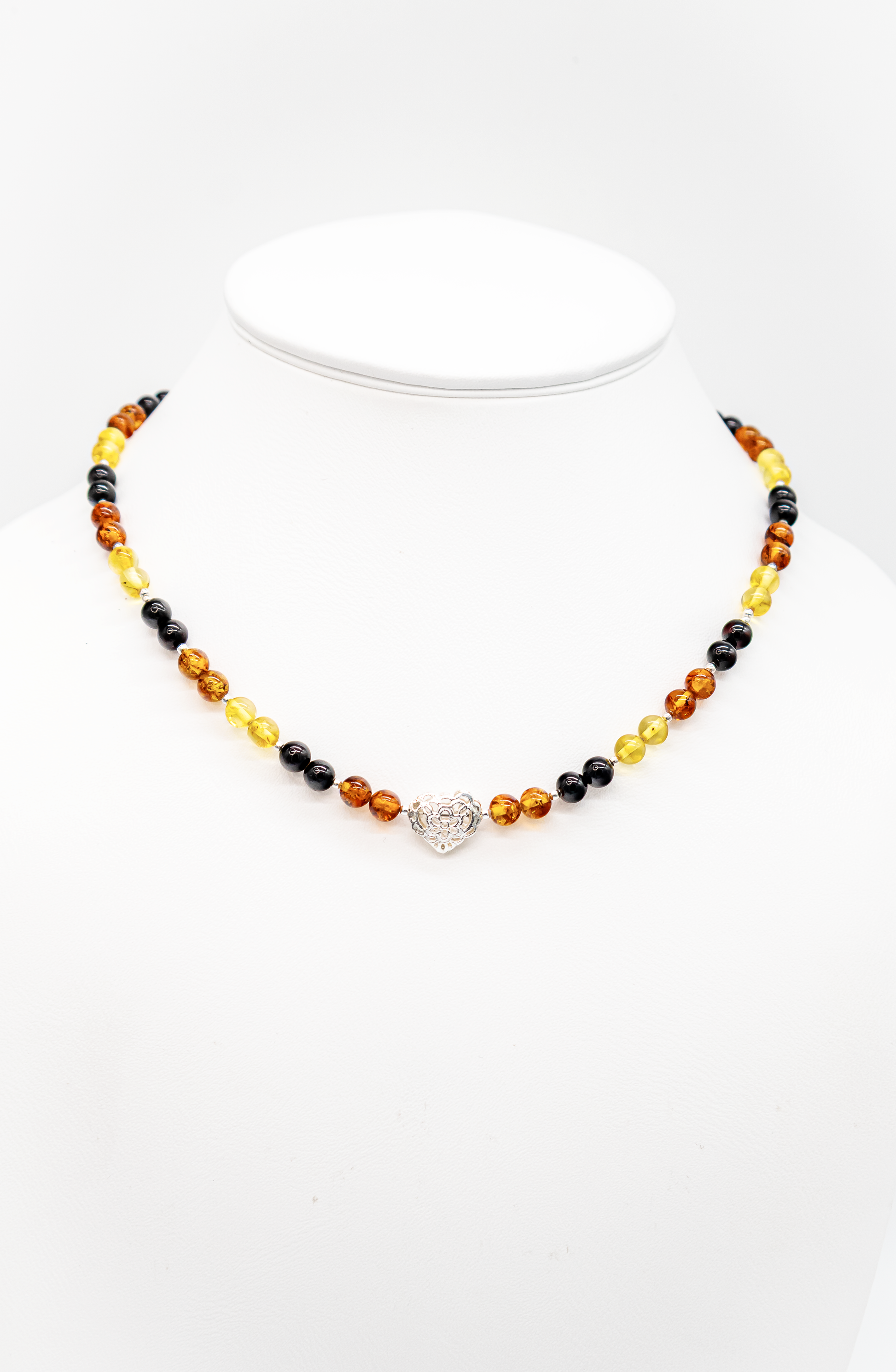 Die bunten Bernsteinkugeln in warmen Honig-, Zitronen- und Cognactönen werden durch ein filigran gearbeitetes Herz aus Silber in der Mitte harmonisch betont.