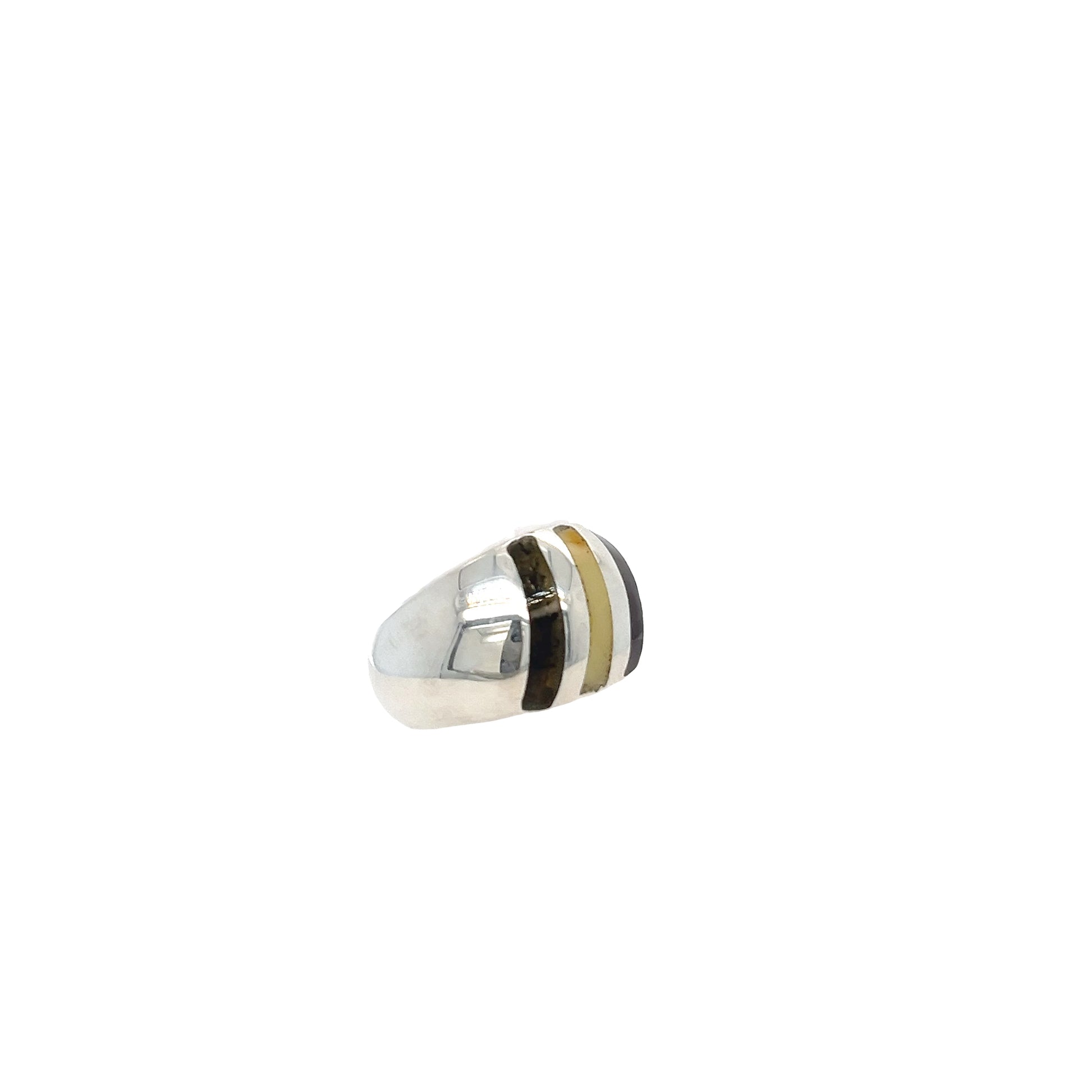Das breite Silberband wird durch vertikal eingesetzte Bernsteinstreifen in unterschiedlichen Farbtönen akzentuiert. Der echte Bernstein zeigt natürliche Farbnuancen von hell bis dunkel sowie individuelle Strukturen, die jedem Ring eine besondere Tiefe verleihen. Die Kombination aus glänzendem Silber und farbigen Bernsteinelementen sorgt für einen markanten, modernen Look.
