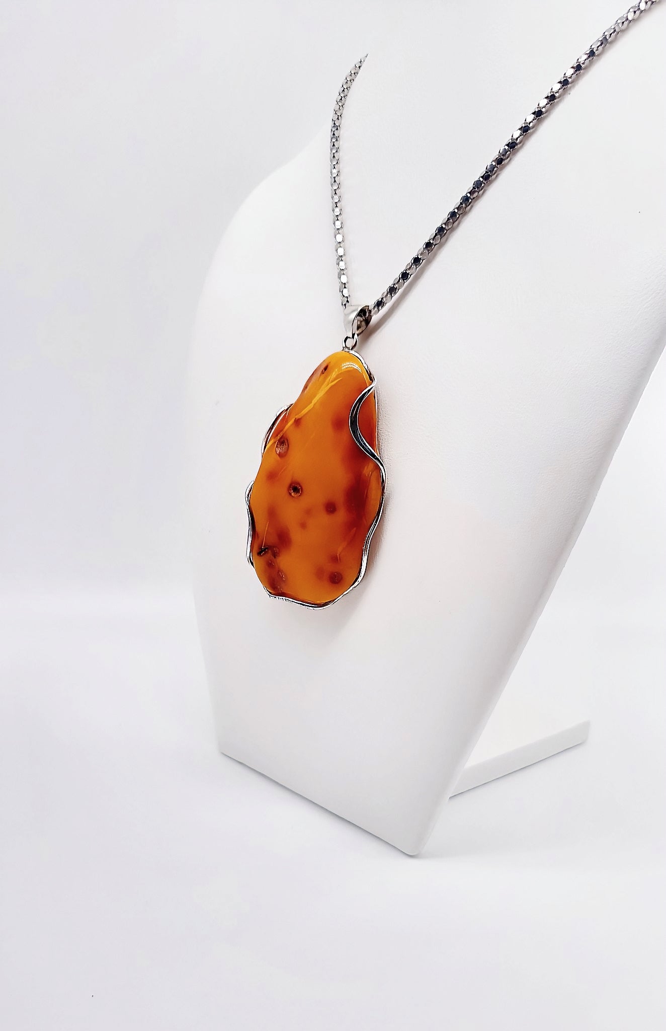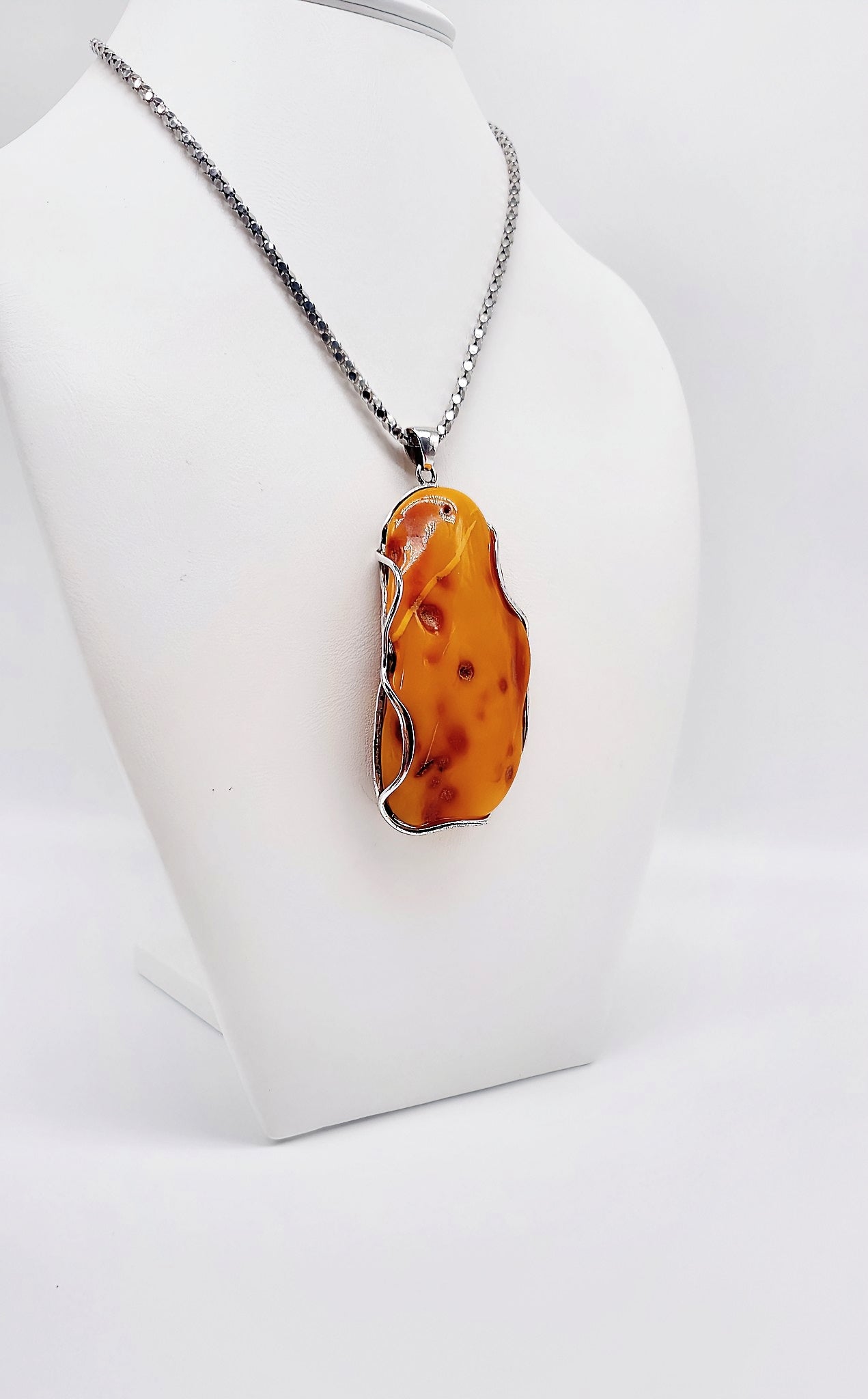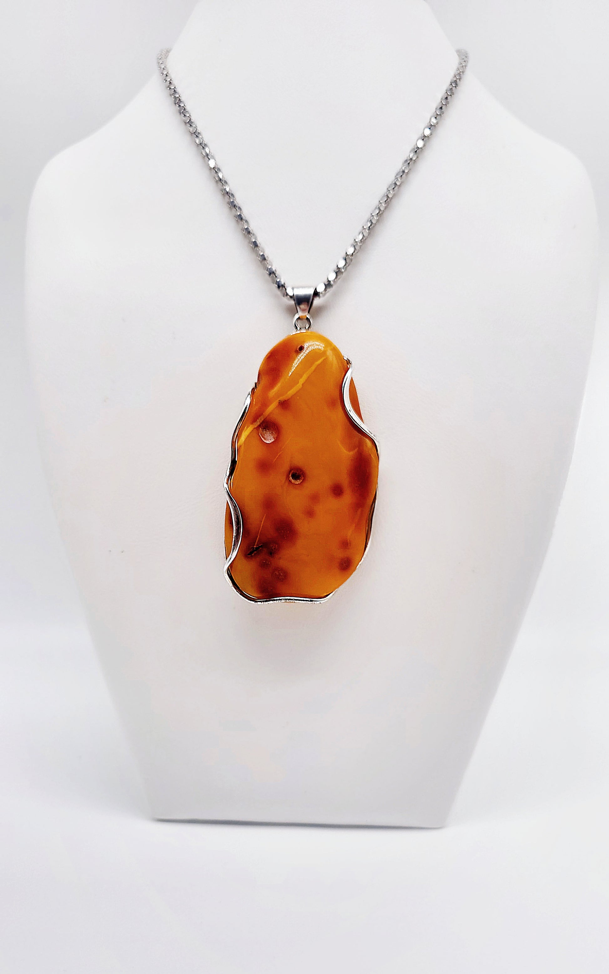 Dieser wunderschöne Bernsteinanhänger besticht durch seine außergewöhnliche Form und den warmen, goldenen Farbton. Eingefasst in eine elegante Silberfassung, bringt der Anhänger die natürliche Schönheit des Bernsteins perfekt zur Geltung. Jeder Anhänger ist ein Unikat und zeichnet sich durch seine einzigartige Maserung und Farbe aus. Dieser Schmuck ist ein zeitloses Accessoire, das Ihrem Stil einen Hauch von Eleganz und Naturverbundenheit verleiht.