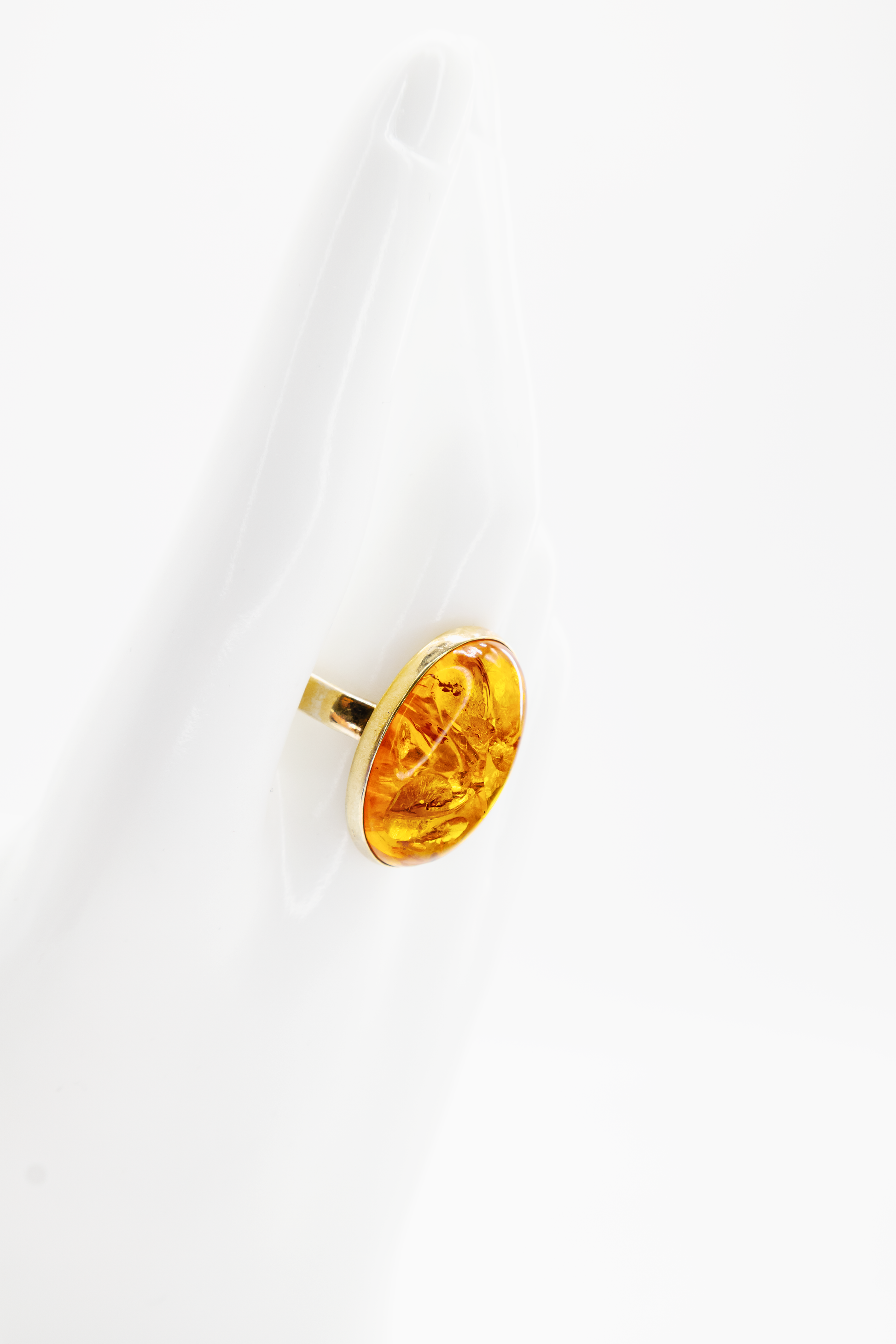 Dieser vergoldete Ring mit echtem Bernstein überzeugt durch seine harmonische Form und die warme, goldene Ausstrahlung des Steins. Der ovale Bernstein wird von 24 Karat vergoldetem 925er Sterlingsilber elegant eingefasst und kommt durch das klare Design besonders schön zur Geltung.