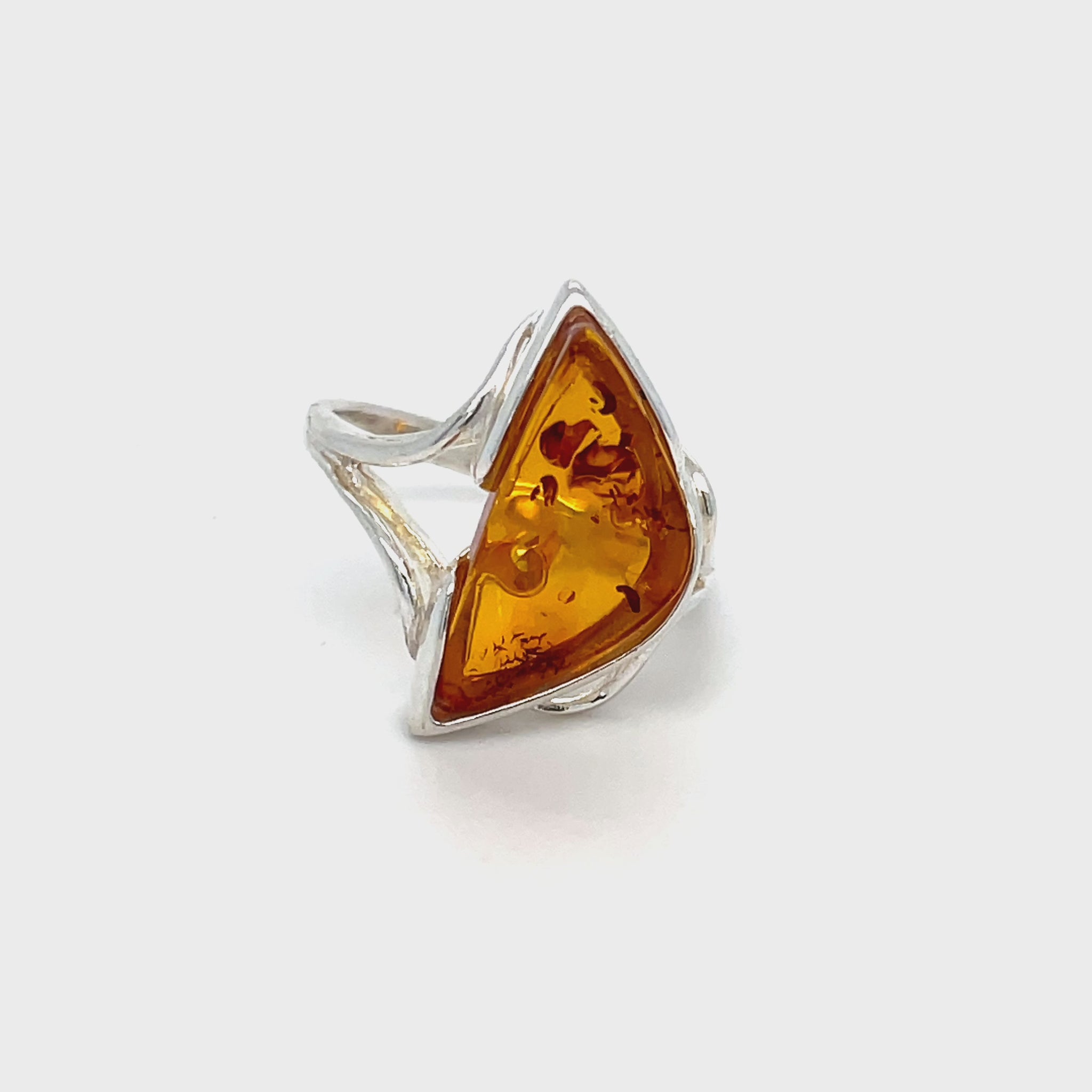 Ein Ring, der sofort ins Auge fällt: Die moderne, leicht dreieckige Bernsteinfassung wirkt wie ein kleines Kunstwerk, eingefangen in edlem 925er Sterlingsilber.