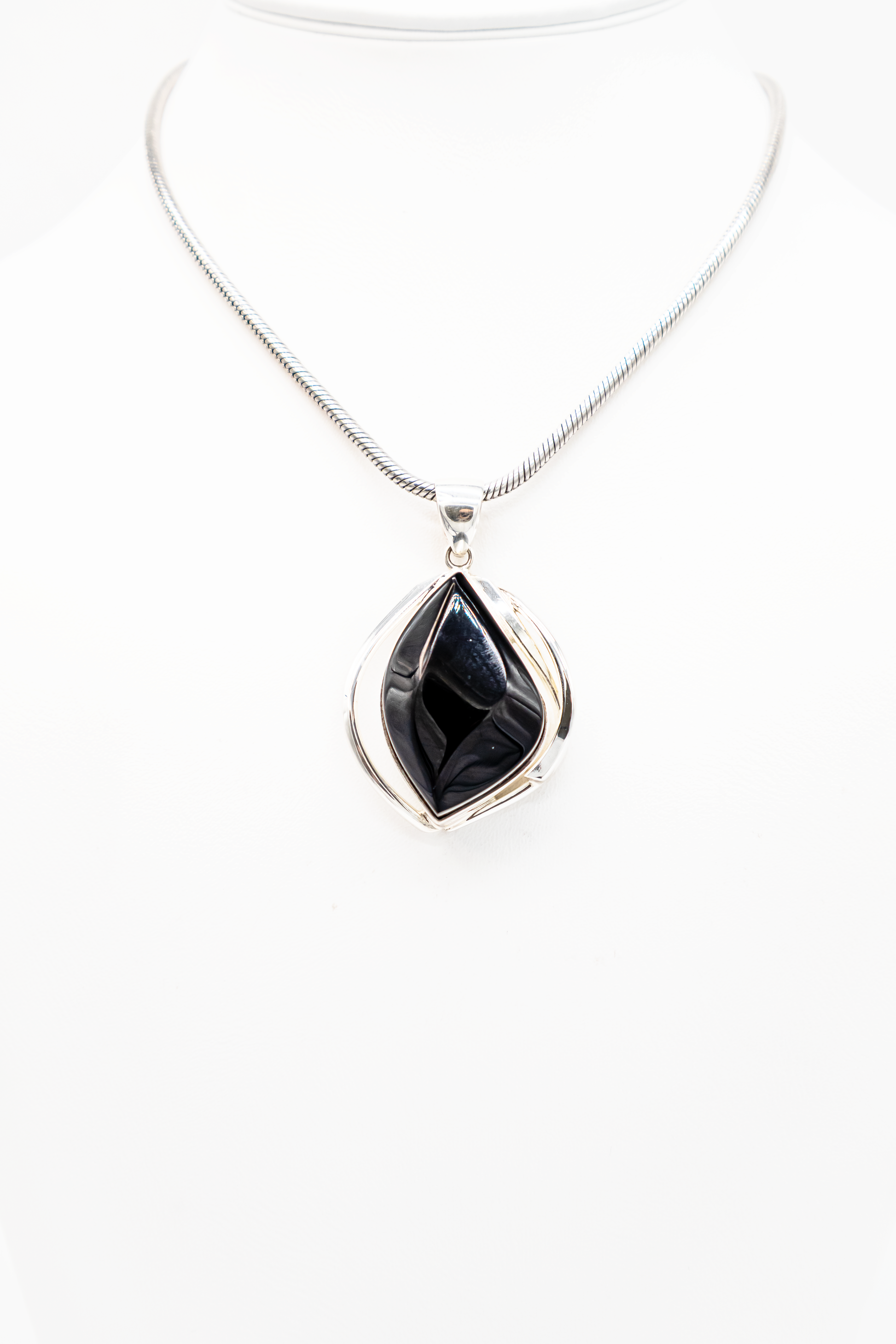 Das edle, organisch geschwungene Design betont die Tiefe und den geheimnisvollen Glanz des dunklen Bernsteins, der je nach Lichteinfall feine Rot- und Weintöne offenbart.