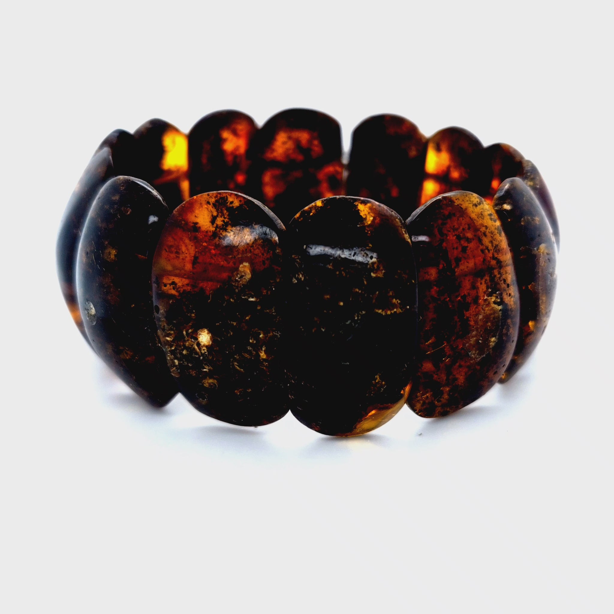 Dieses stilvolle Bernstein Armband besticht durch seine tiefen, dunklen Farbnuancen und die natürliche, lebendige Struktur des Bernsteins. Die ovalen Segmente zeigen ein intensives Zusammenspiel aus dunklem Braun, Cognac und warmen Lichtreflexen, die im Inneren des Bernsteins aufleuchten.