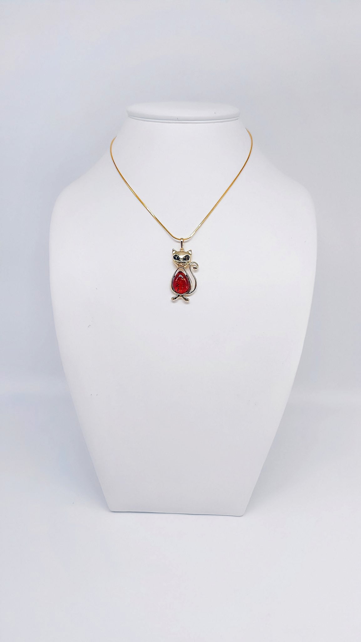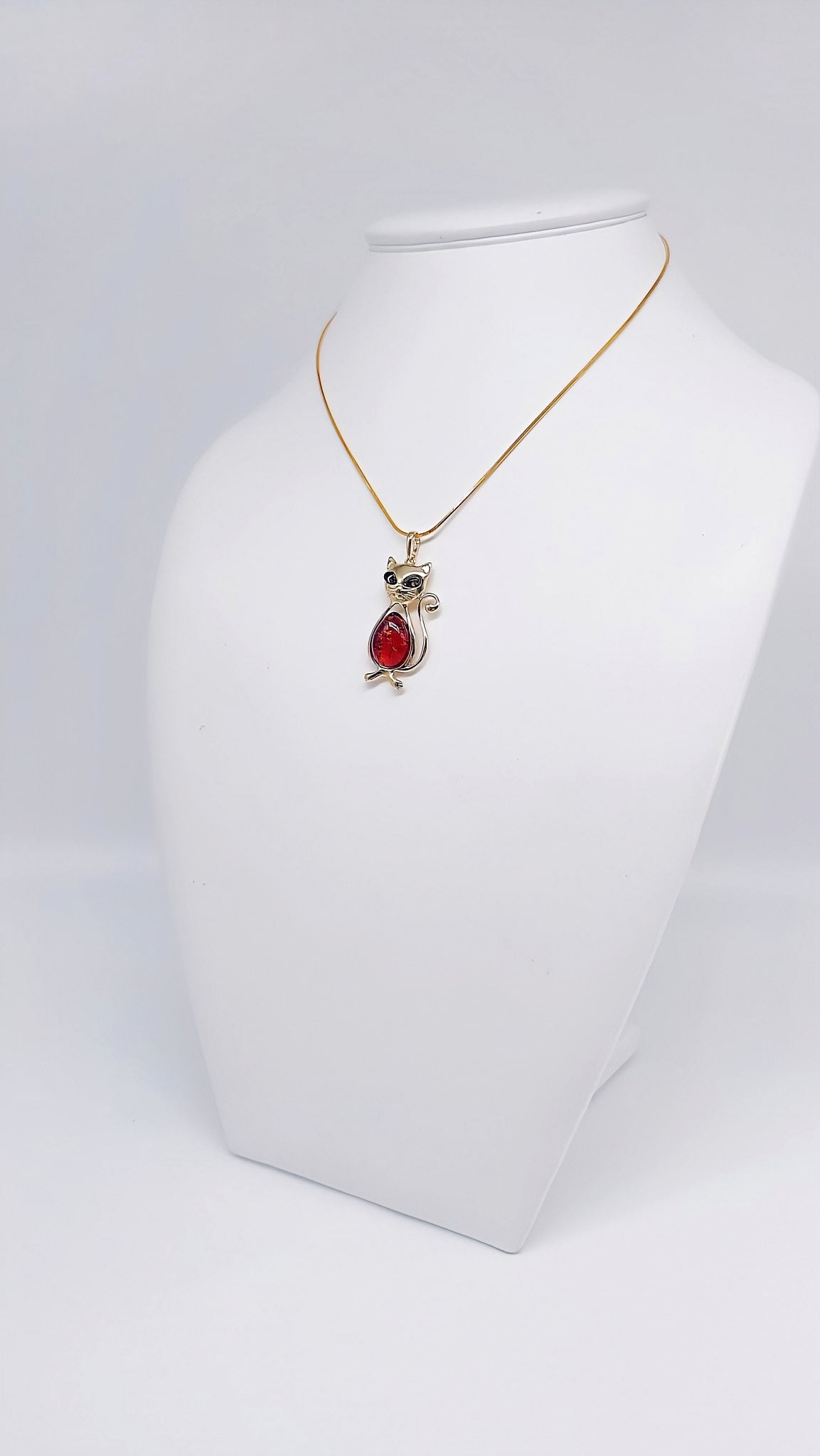 ieser charmante Anhänger in Katzenform ist aus vergoldetem 925er Sterlingsilber gefertigt und mit einem leuchtend roten Bernstein verziert. Die detaillierte Gestaltung und die funkelnden Bernsteinaugen machen diesen Anhänger zu einem besonderen Schmuckstück, das nicht nur für Katzenliebhaber ein echtes Highlight ist. Der warme, rote Bernstein harmoniert perfekt mit dem glänzenden Gold und verleiht dem Anhänger eine luxuriöse Ausstrahlung. Ideal als täglicher Begleiter oder als besonderes Geschenk für Tierliebhaber und Schmuckenthusiasten.