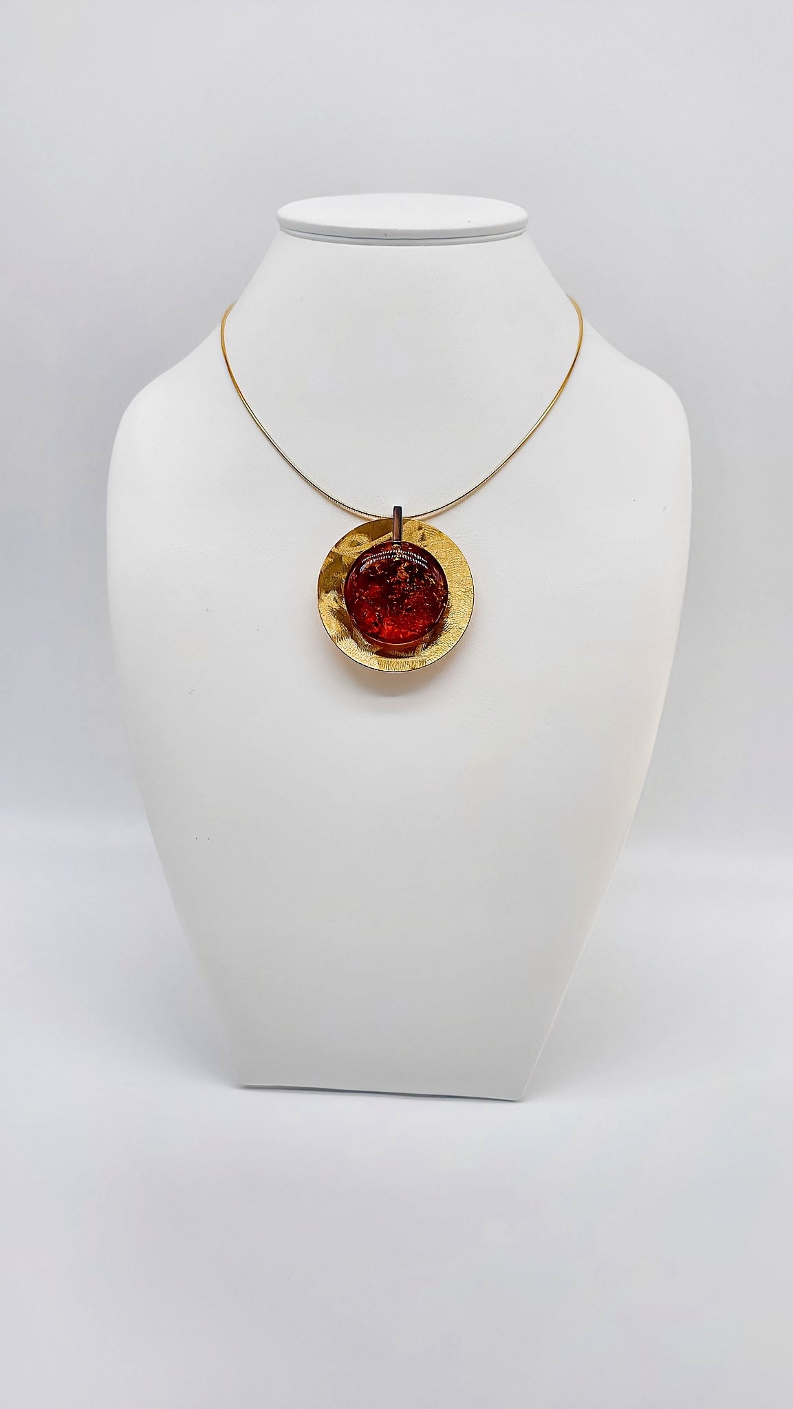 Dieser elegante Anhänger besticht durch sein raffiniertes Kreis-Design und die Kombination aus vergoldetem Metall und tiefrotem Bernstein. Der leuchtende Bernstein in der Mitte des Anhängers zieht alle Blicke auf sich und verleiht jedem Outfit eine luxuriöse Note. Perfekt für besondere Anlässe oder als stilvolles Accessoire für den Alltag, ist dieser Anhänger ein zeitloses Schmuckstück, das in keiner Sammlung fehlen darf.